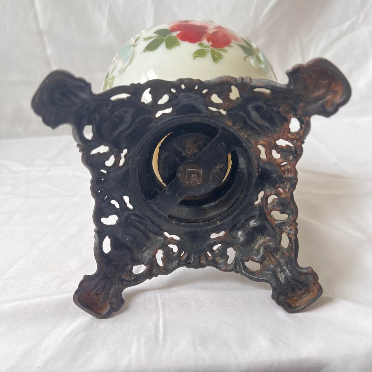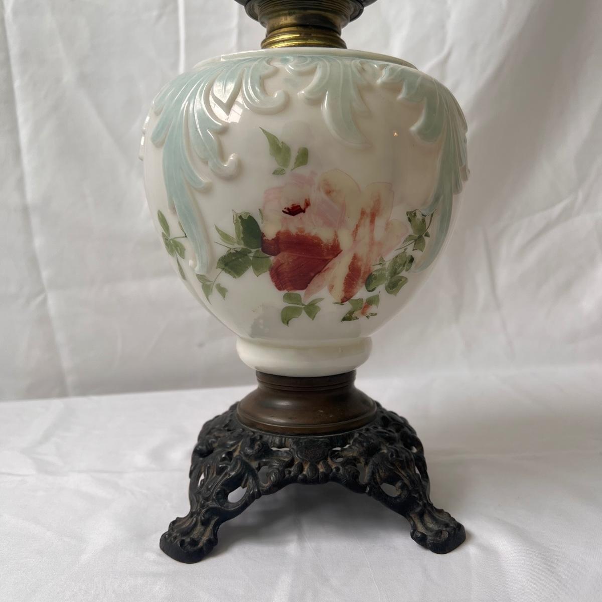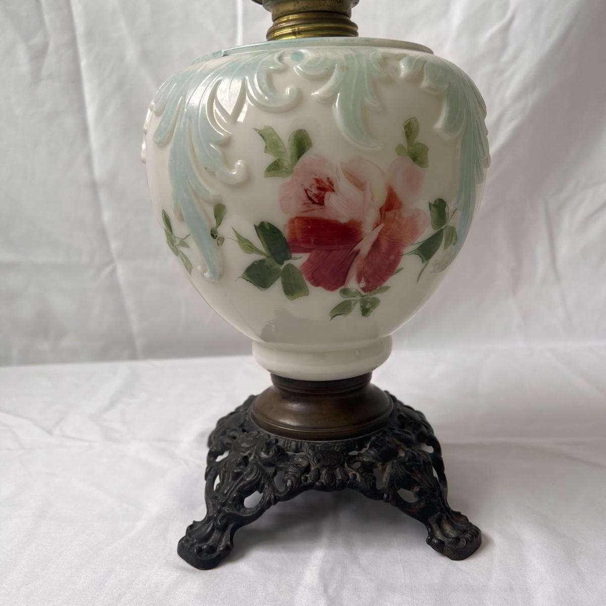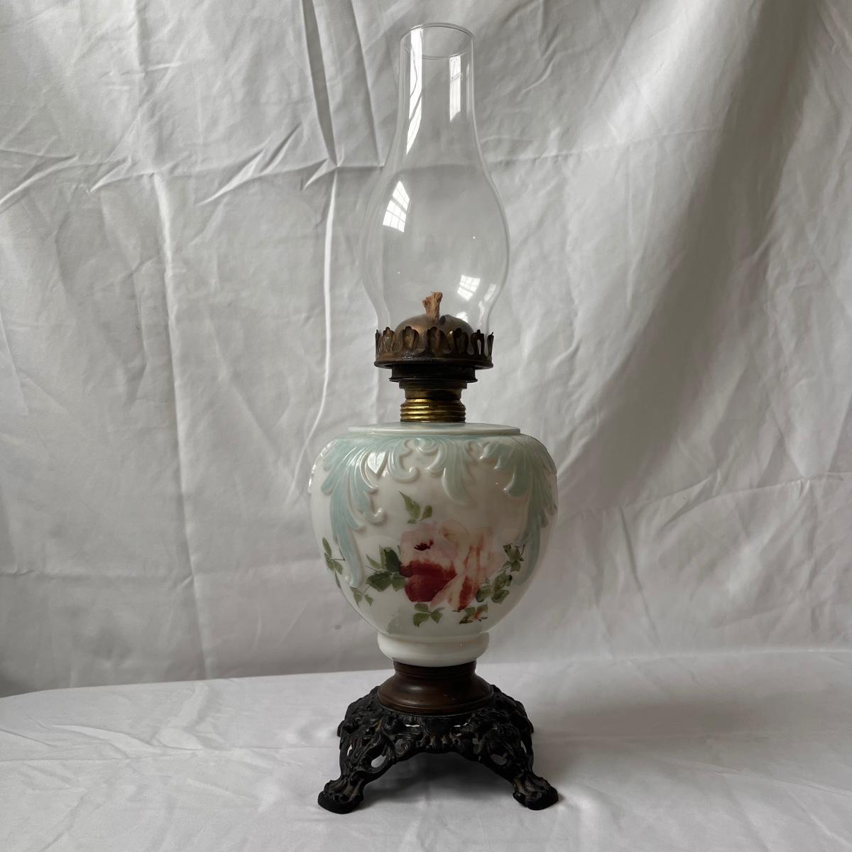 This lot includes one vintage oil lamp that measures 6” x 18”H. It appears to have a hand-painted floral design throughout the lamp. The base is cast iron and the painted part of the lamp appears to be milk glass. Shipping available.