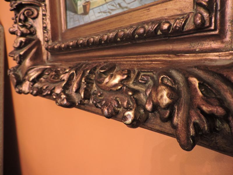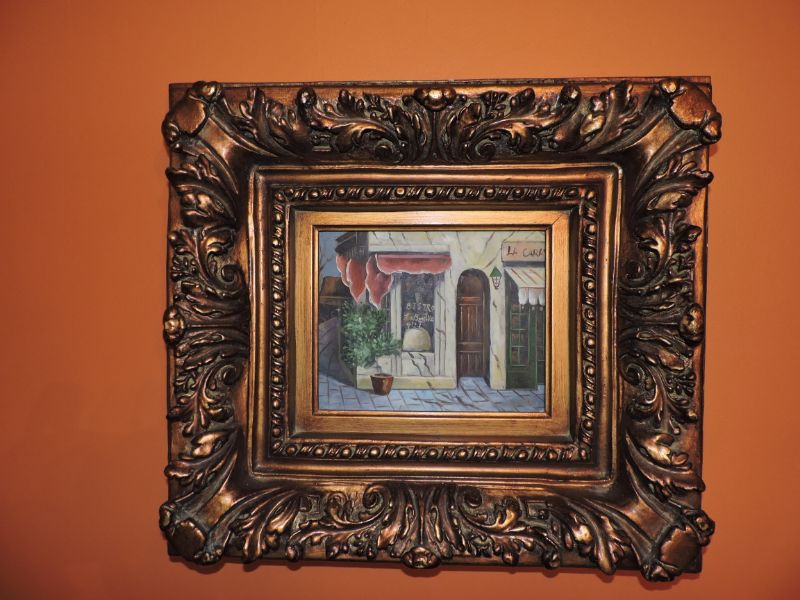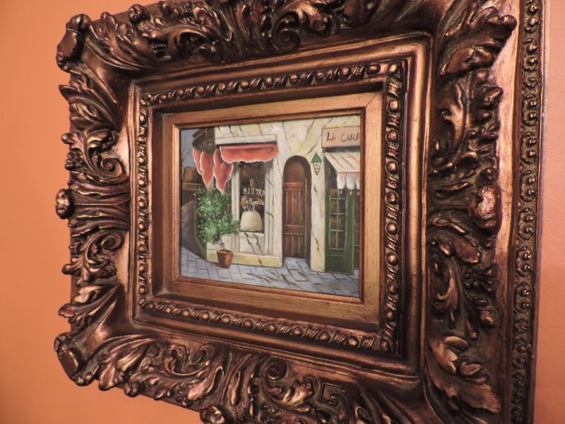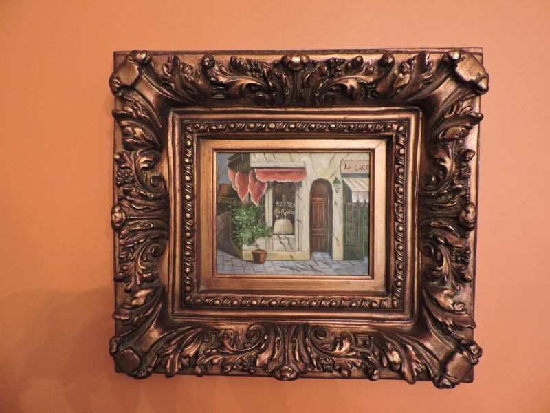 Hand-painted Oil on Wood-Bistro Scene-Jauz's ““ Scene of French street with bistro. 8”x10” oil on wood, Antique Gold Baroque frame 22.5”x20.5”