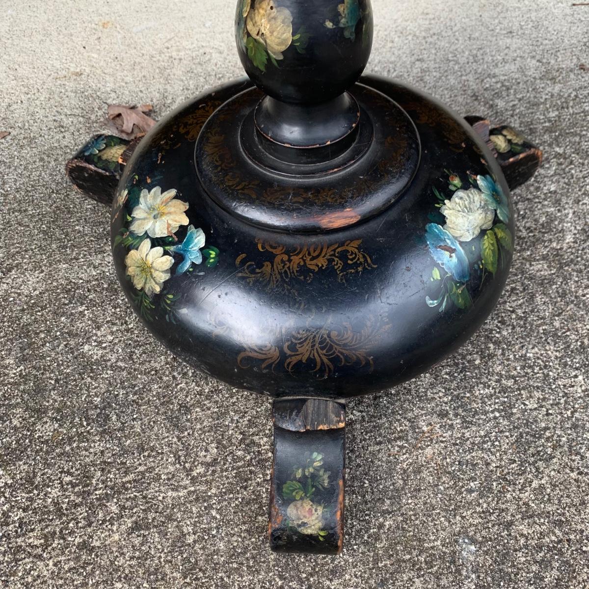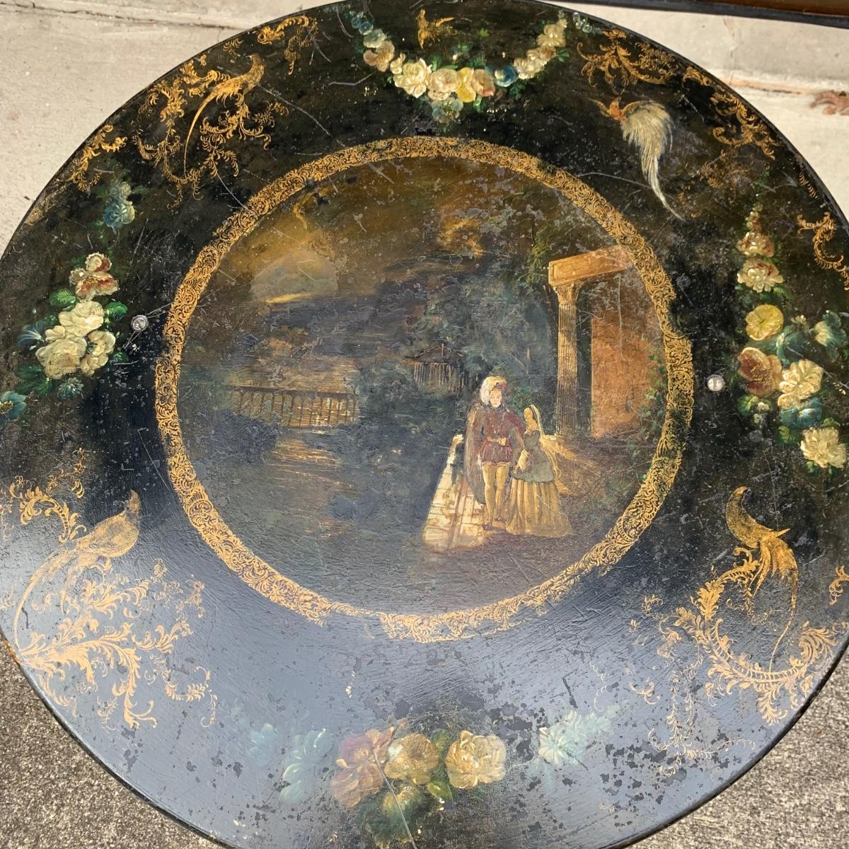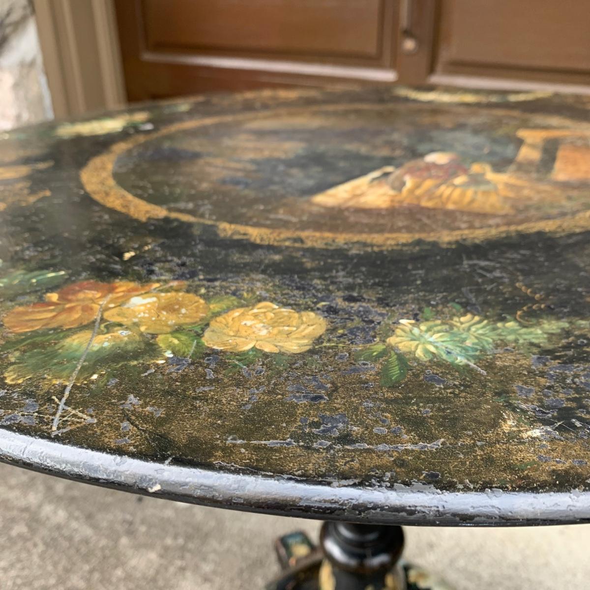Lovely pedestal tap with a metal top and wood base. Table appears to be hand-painted. Some of the design looks like it has chipped off. Please note that there is a slight tilt to the tabletop and some cracks in the base, as well as some wood missing from the foot of the base. It measures 27”D x 27.75”H.