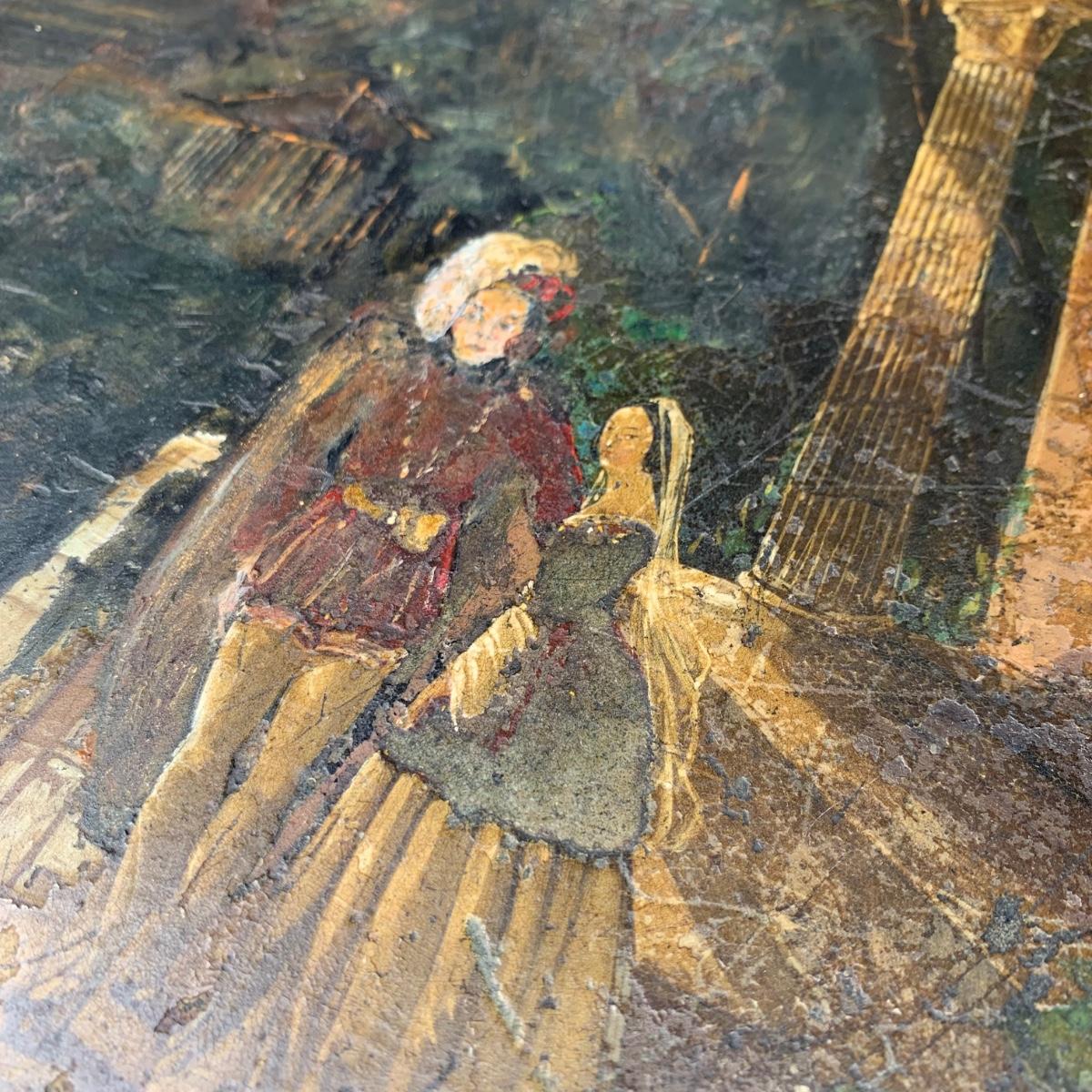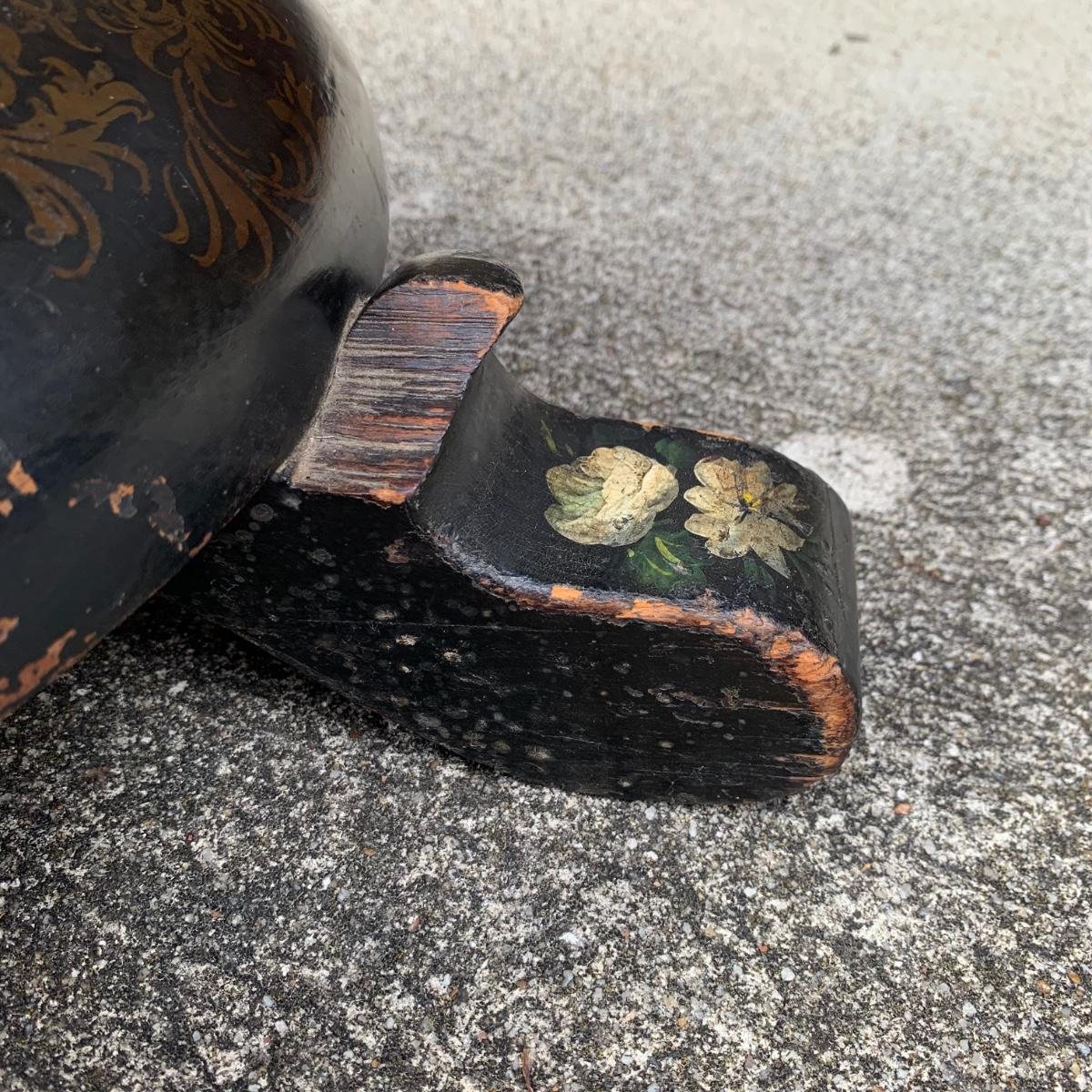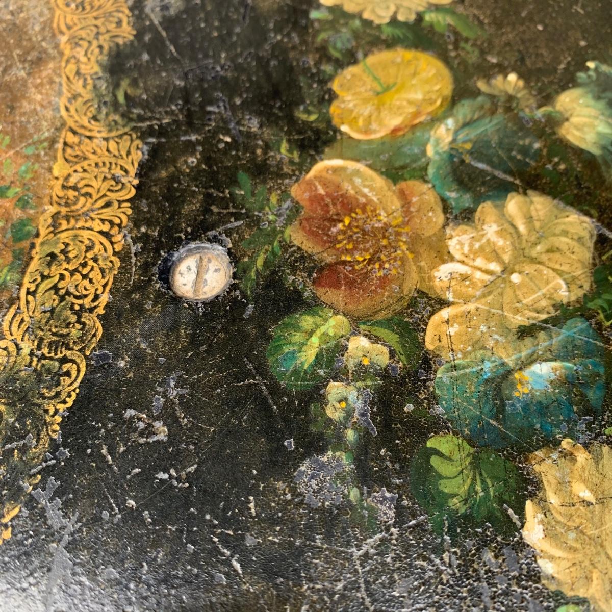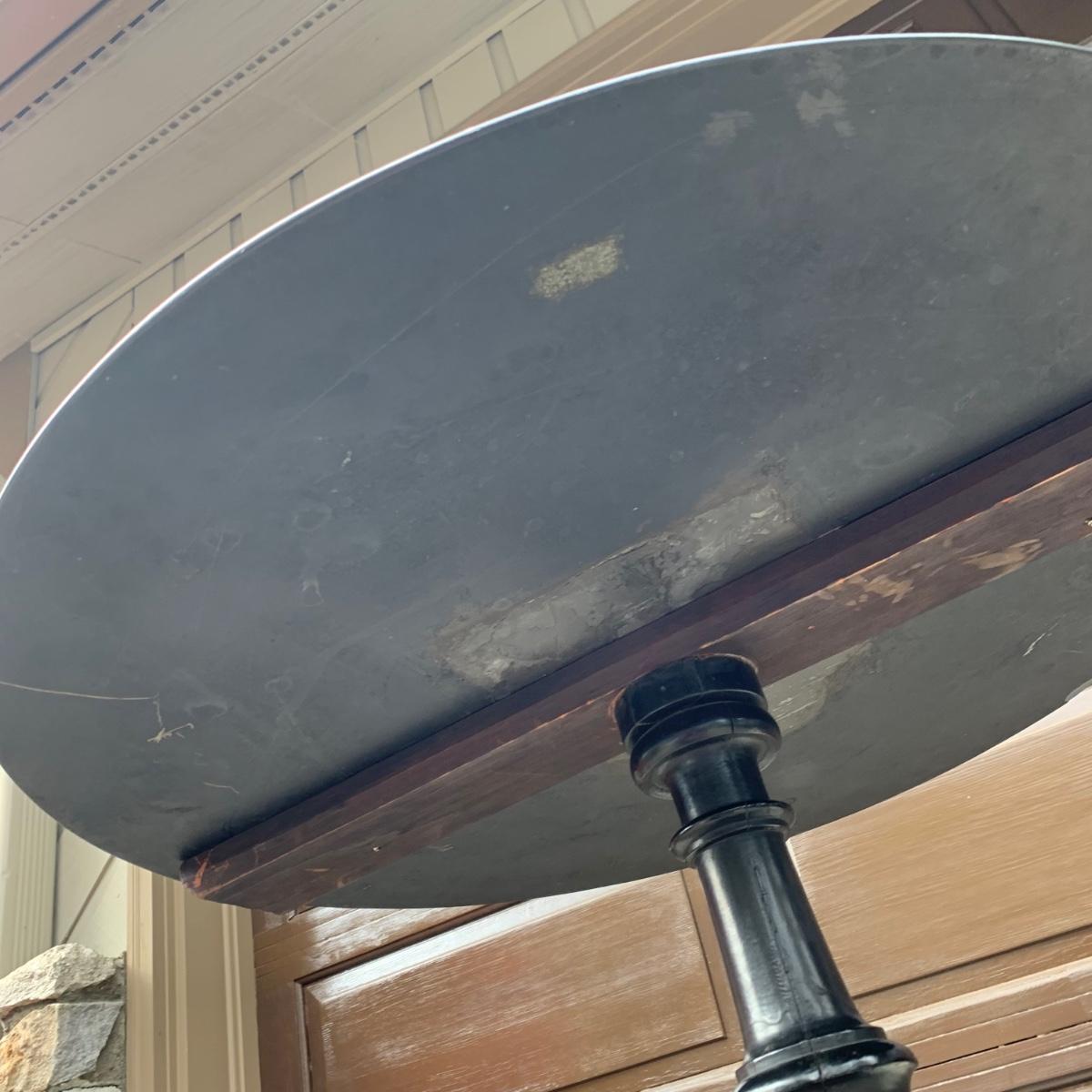 Lovely pedestal tap with a metal top and wood base. Table appears to be hand-painted. Some of the design looks like it has chipped off. Please note that there is a slight tilt to the tabletop and some cracks in the base, as well as some wood missing from the foot of the base. It measures 27”D x 27.75”H.