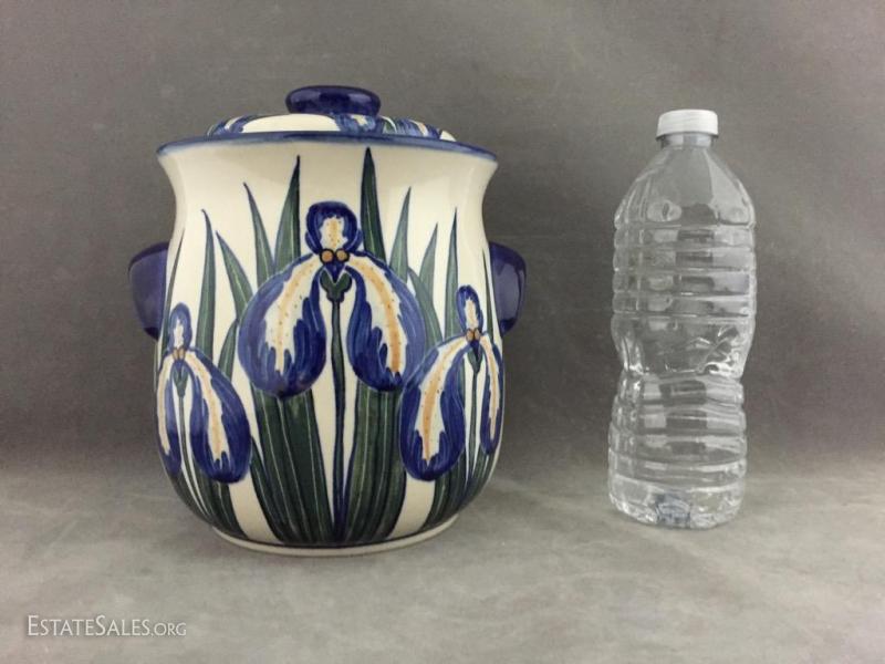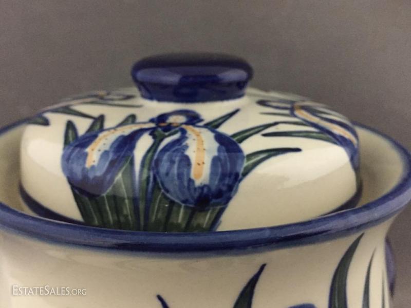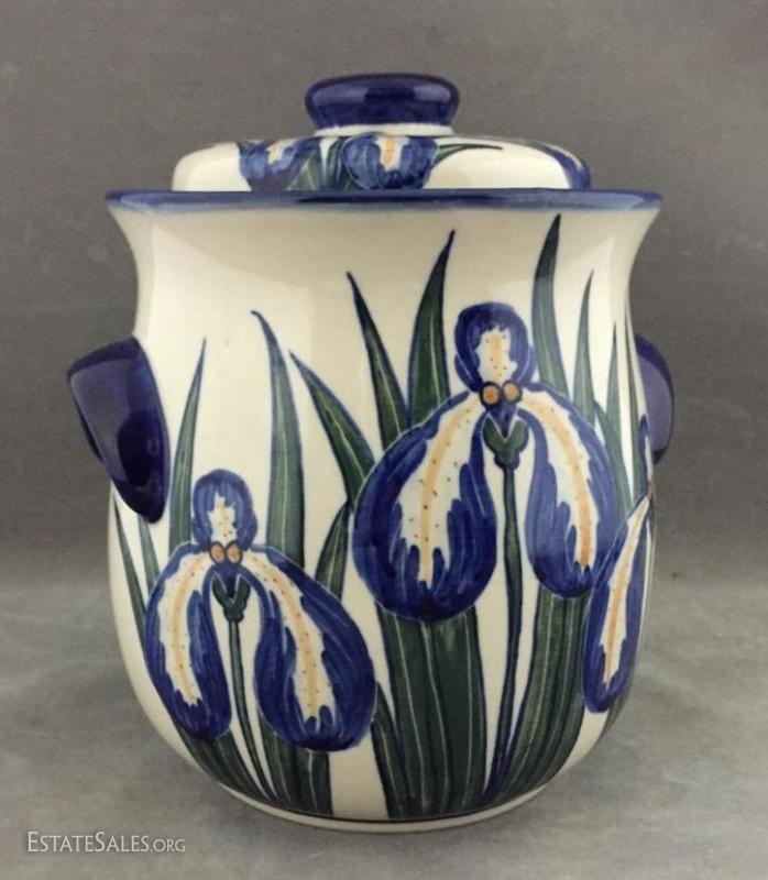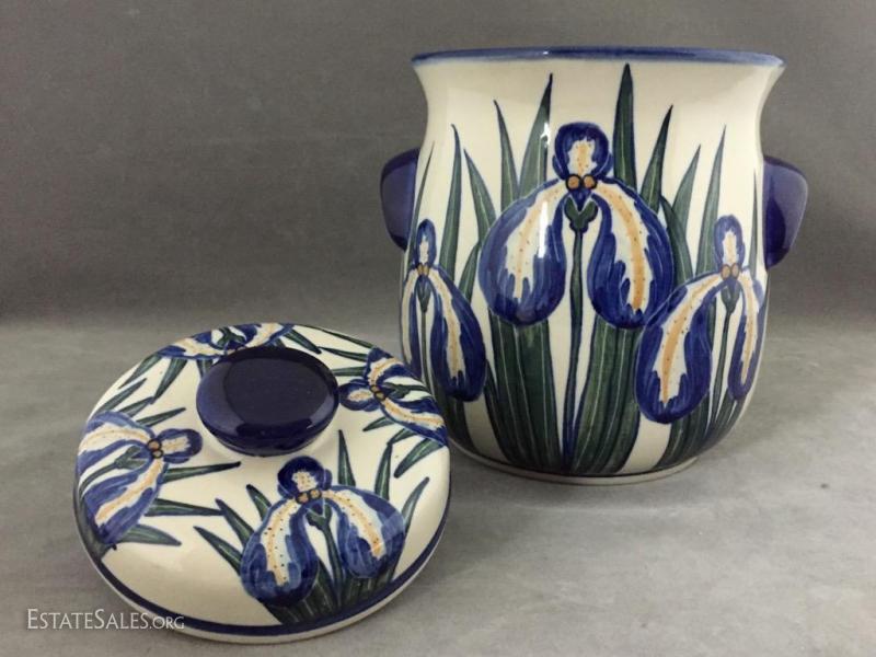Hand-painted Polish ceramic lidded jar by "WR, Boleslawiec" depicting blue iris design, 8.5" tall