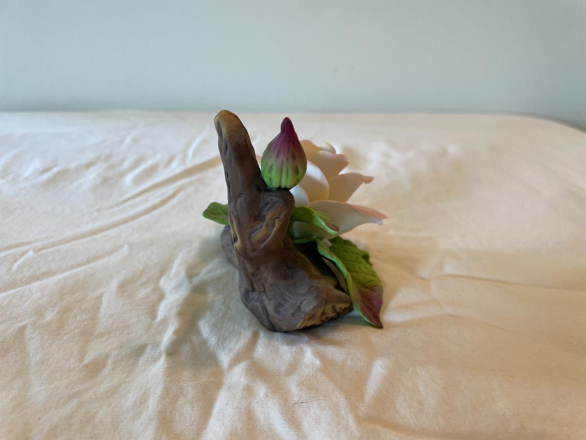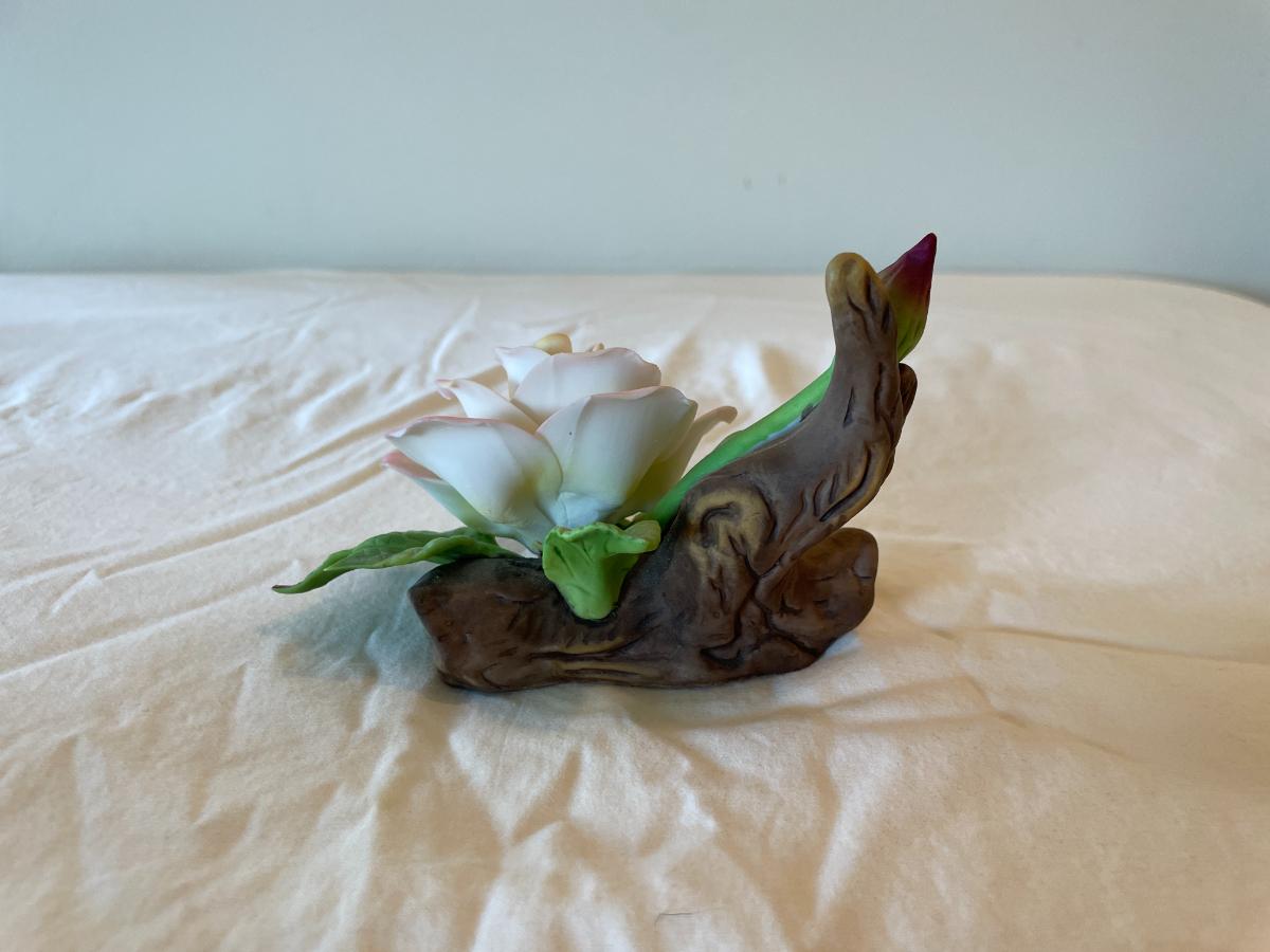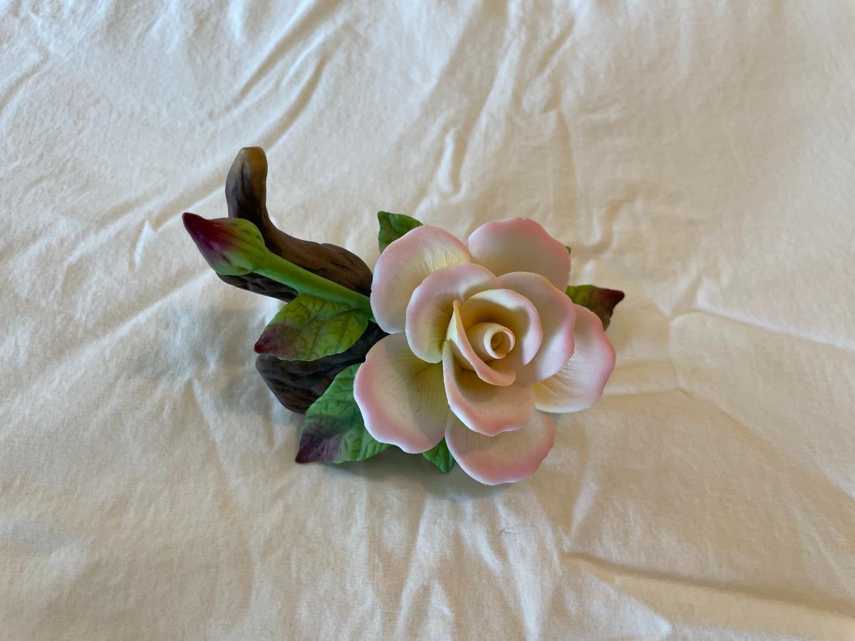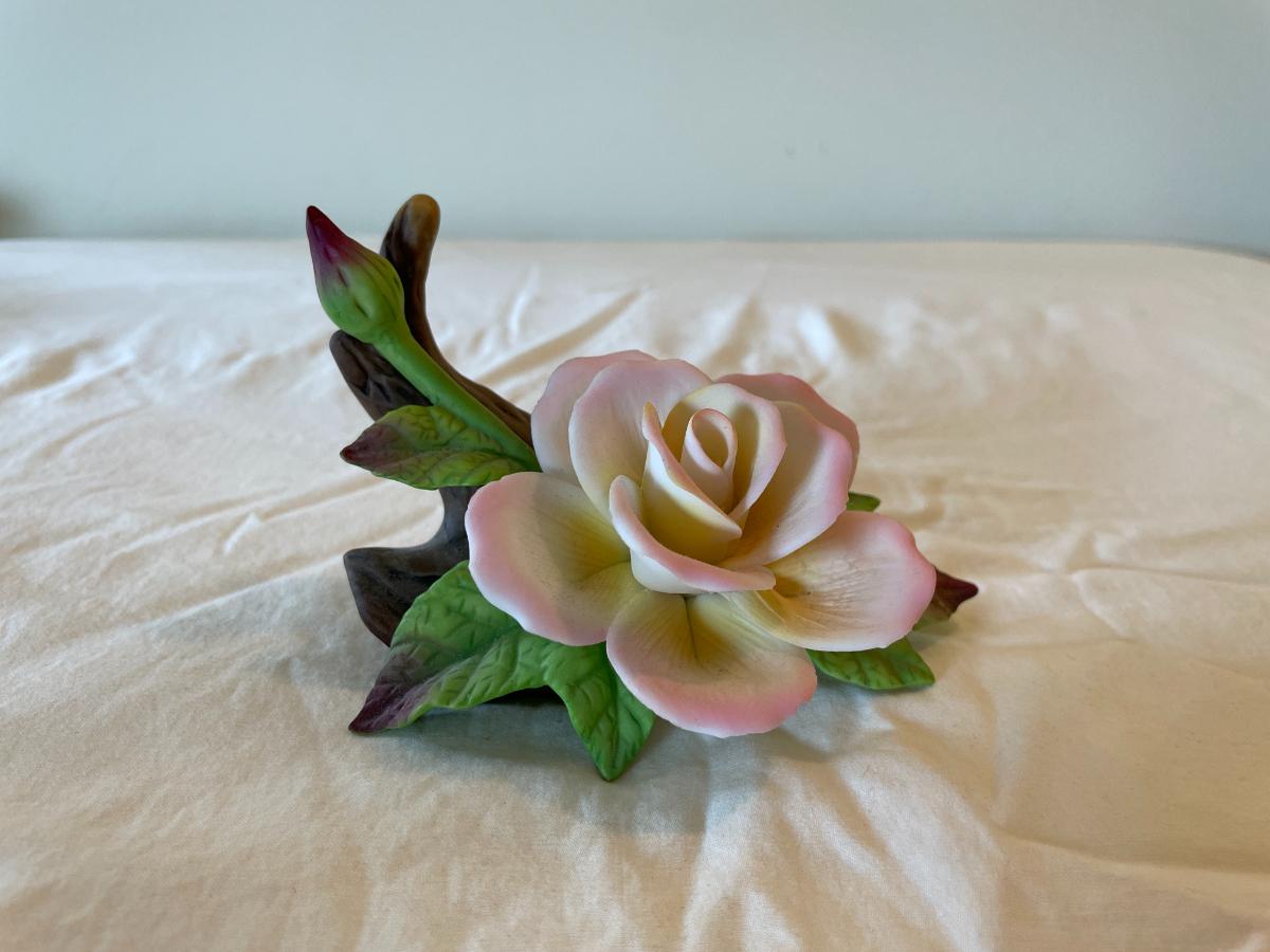 Hand-Painted Porcelain Rose Figurine with Leaves and Wood Trunk Base