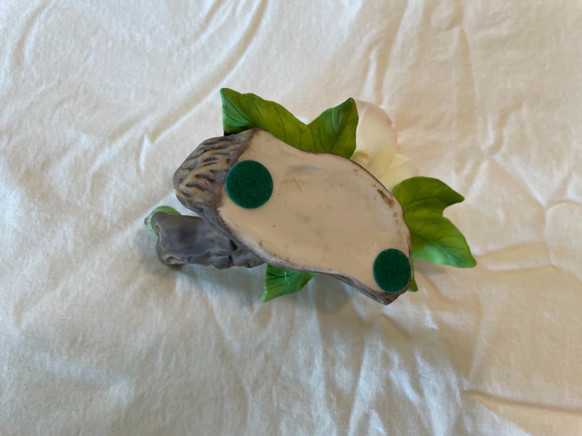 Porcelain rose figurine featuring a detailed pink flower with green leaves, mounted on a wood-like textured base. The piece measures 5 inches in length. It has protective green felt pads on the underside for surface protection. Condition appears good.