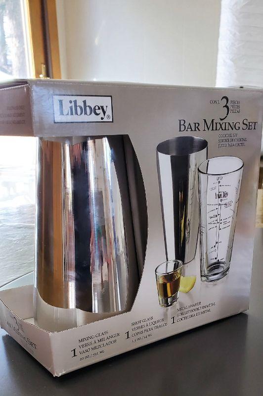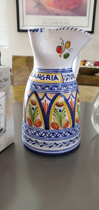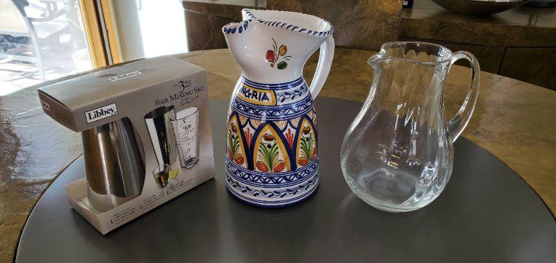 Hand Painted Ceramic Sangria Pitcher, Glass Pitcher and Libbey 3 Piece Bar Mixing Set in Box