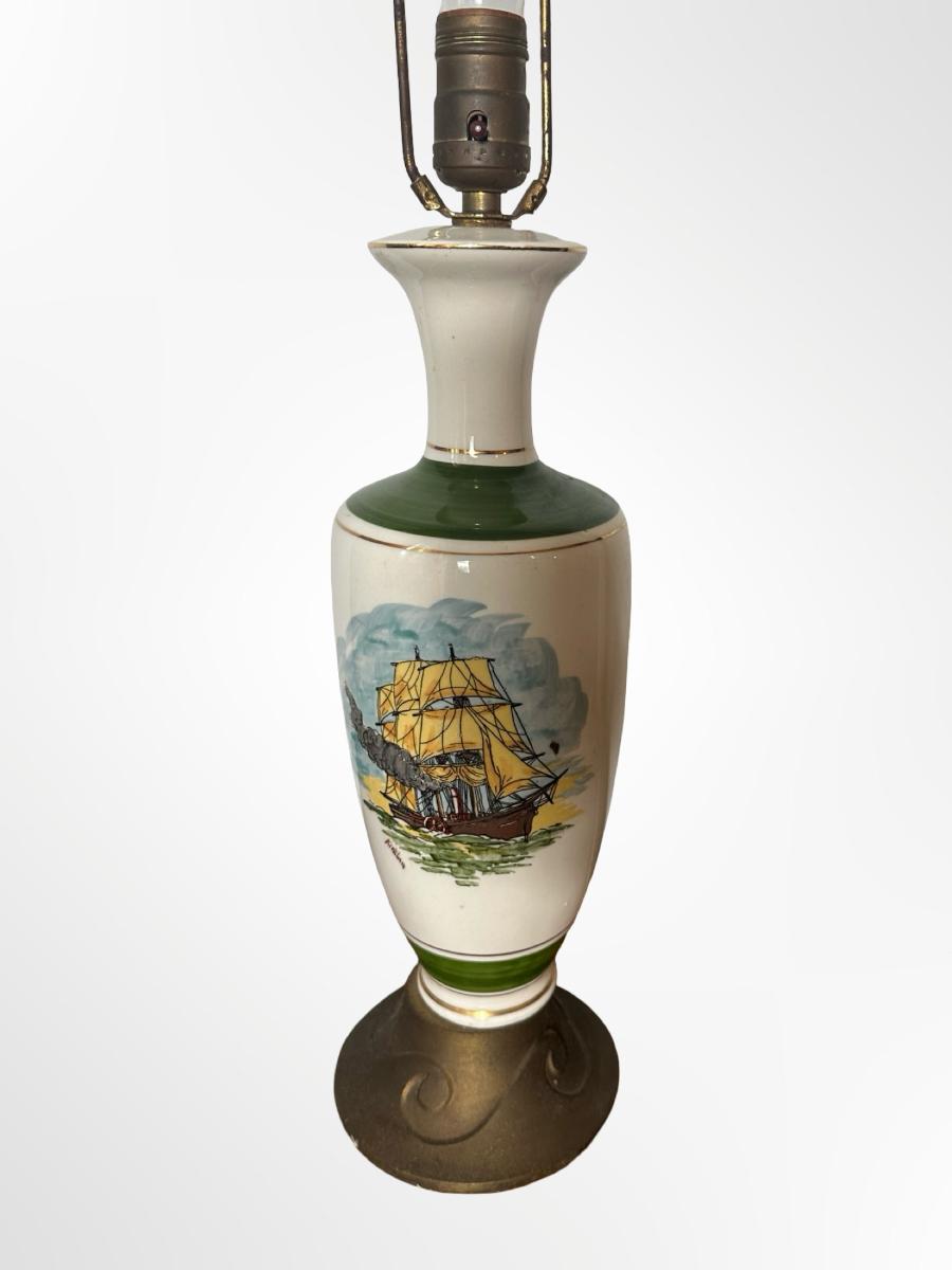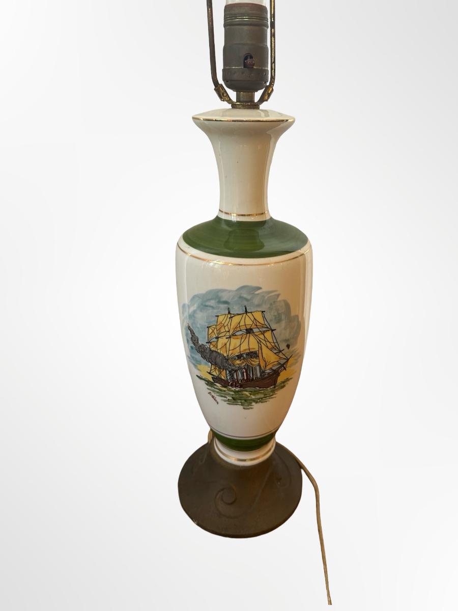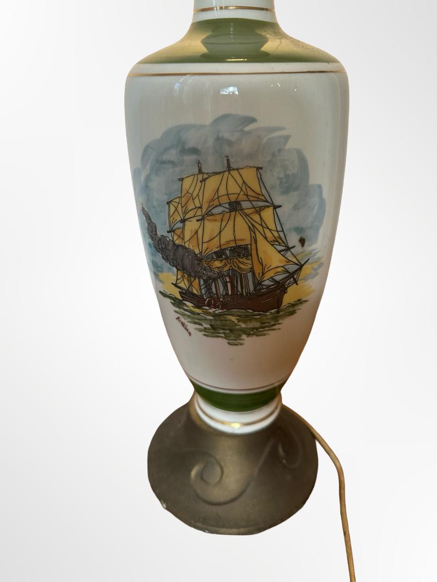 Hand-Painted Table Lamp with Sailing Ship Scene