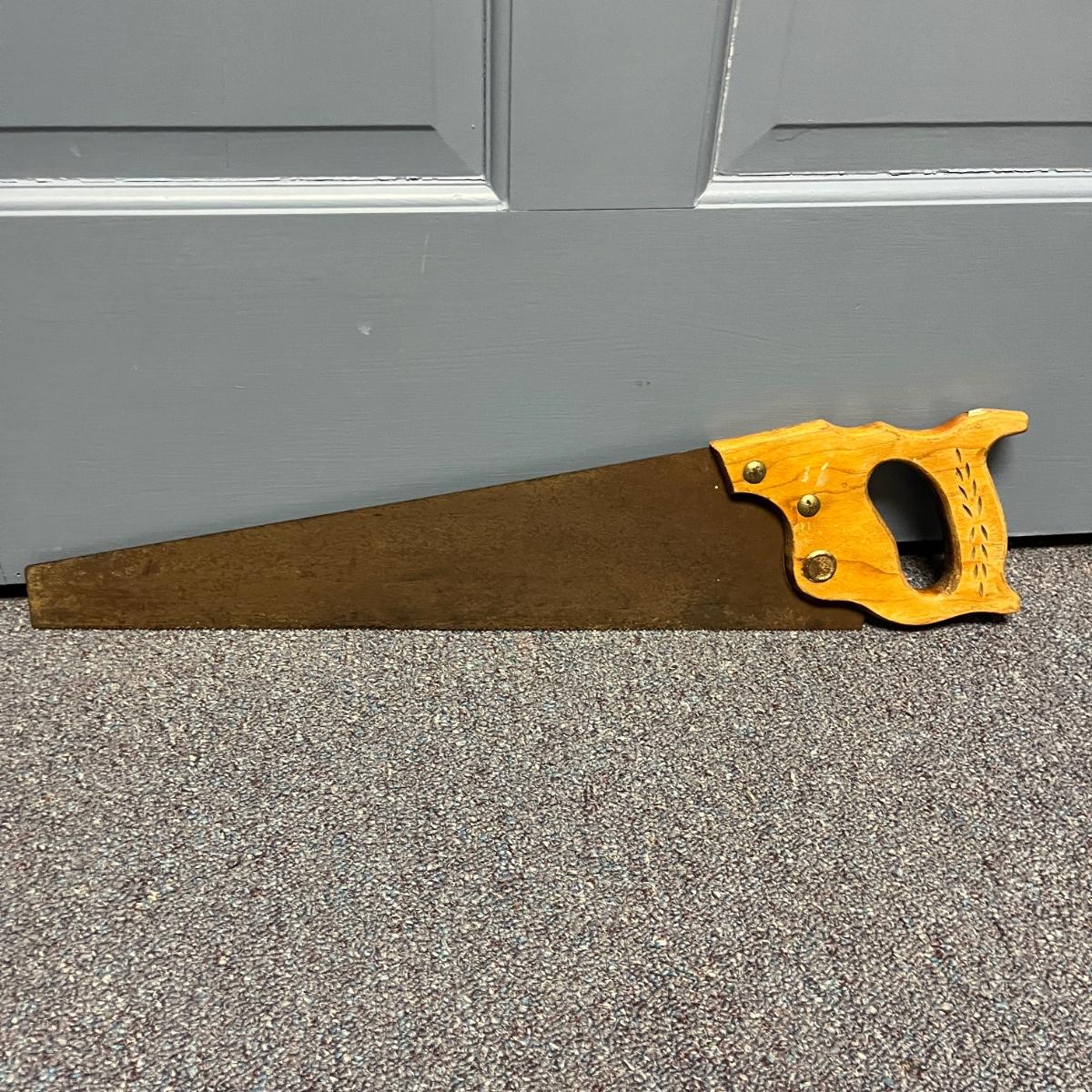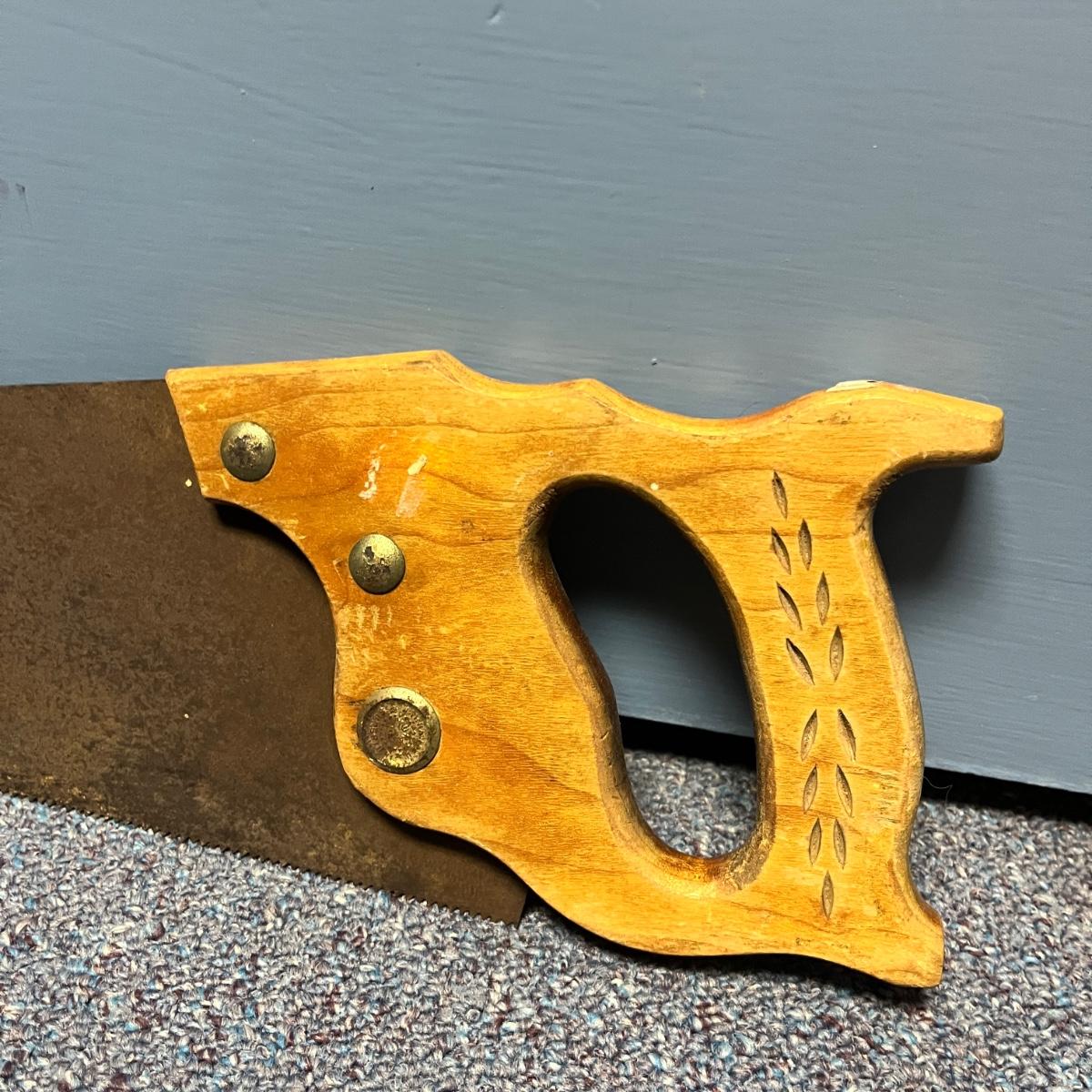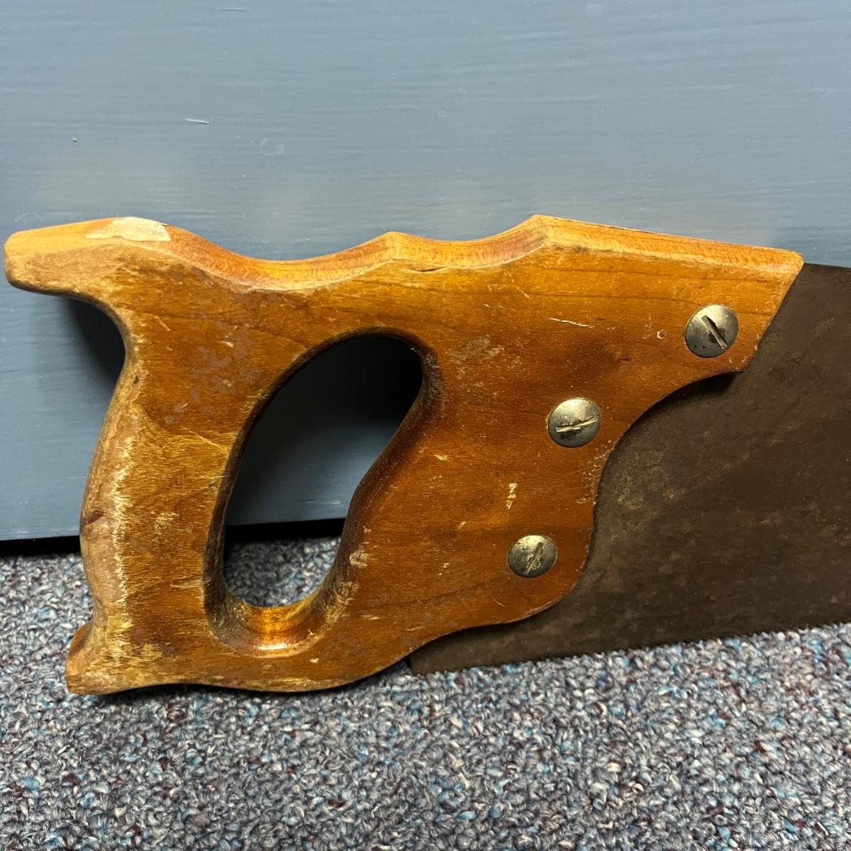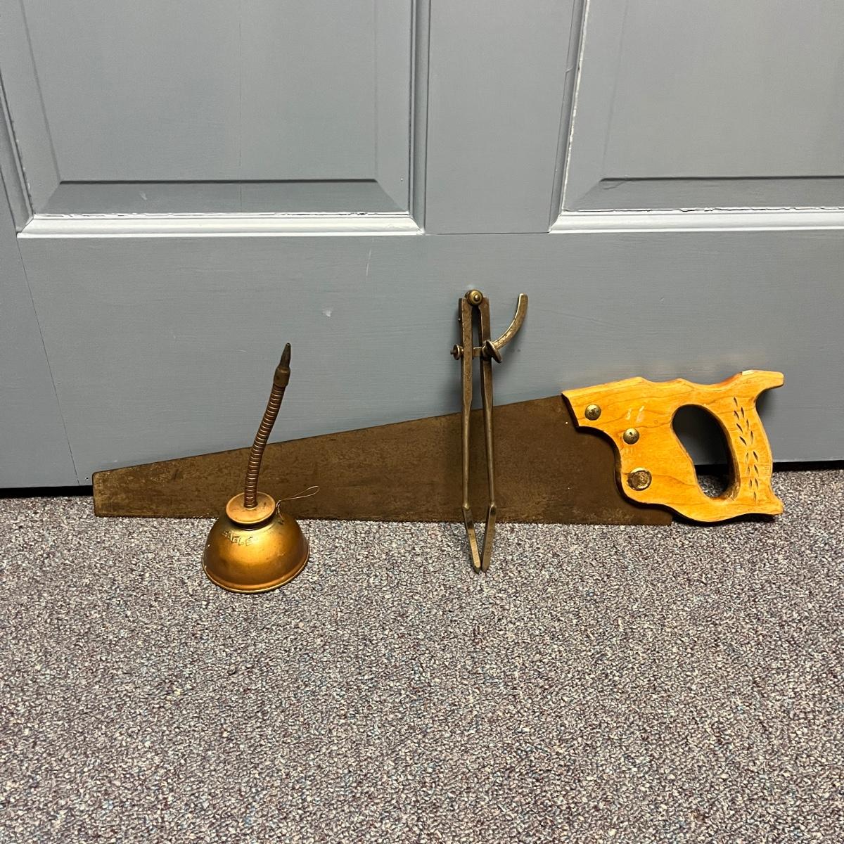 Lot contains a handsaw with a wooden handle, metal Eagle brand oil can, and a steel caliper. Saw measures 5.5” x 1” x 24” long.
