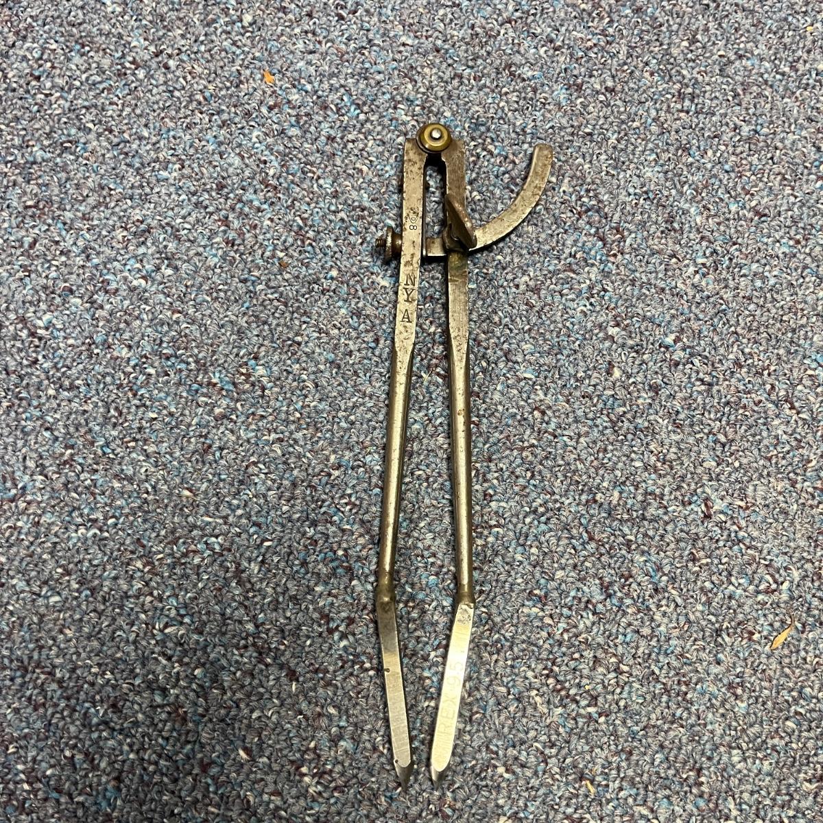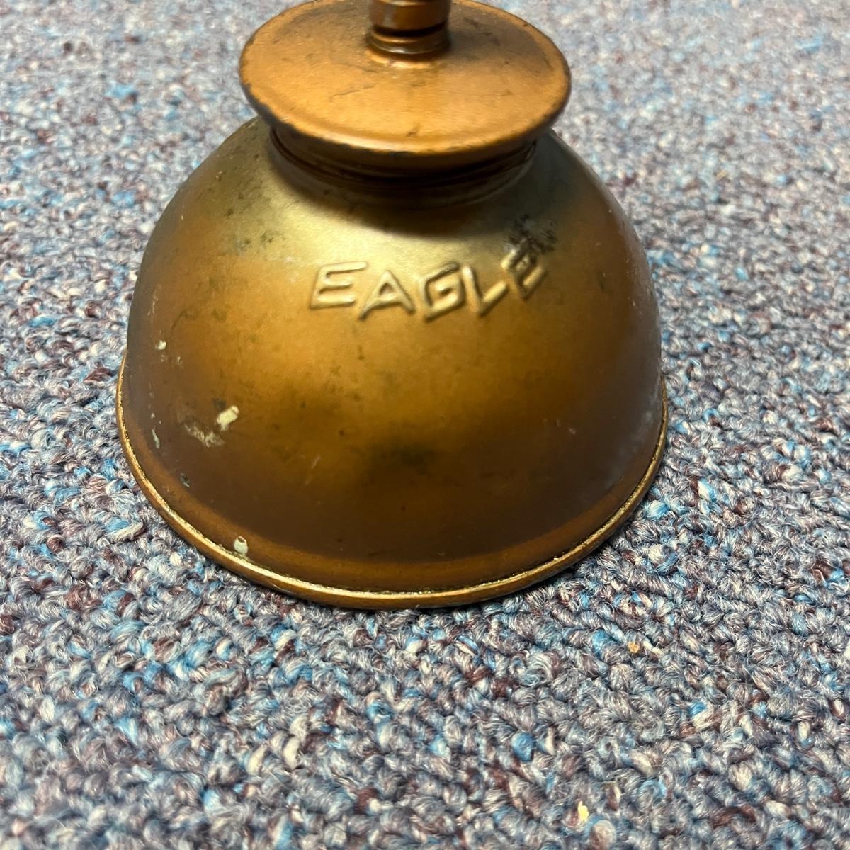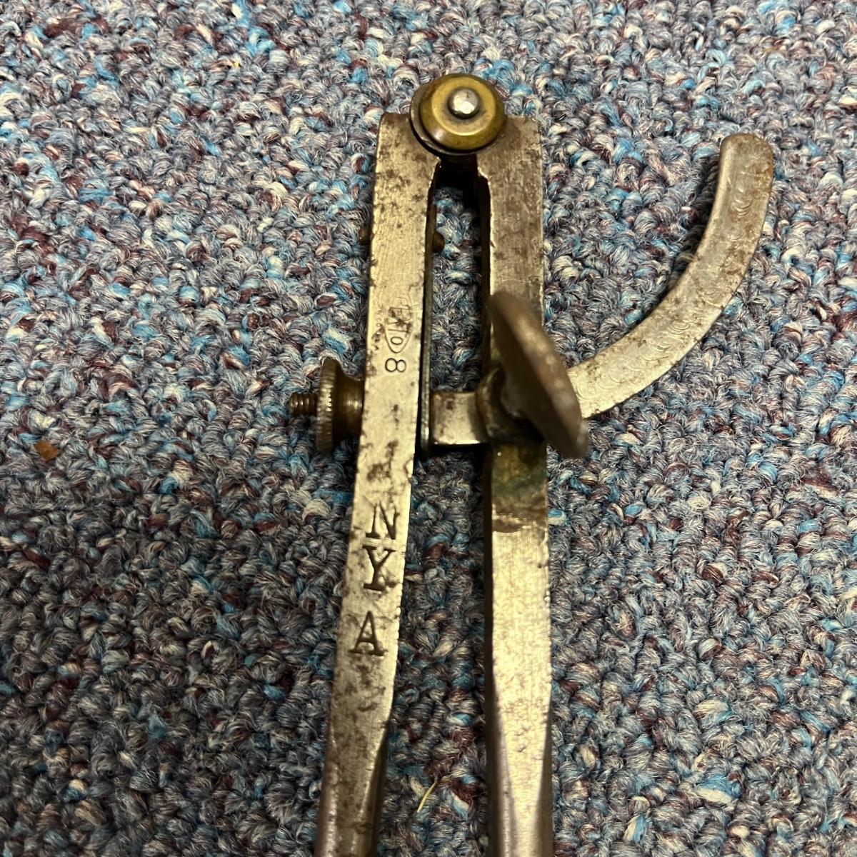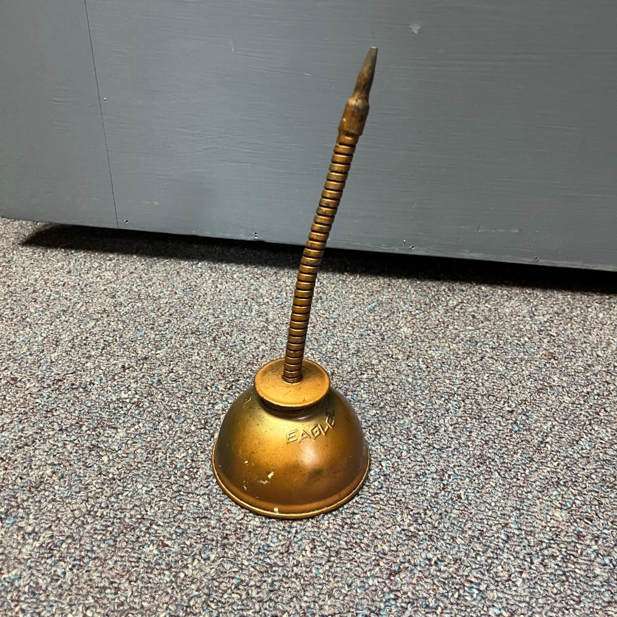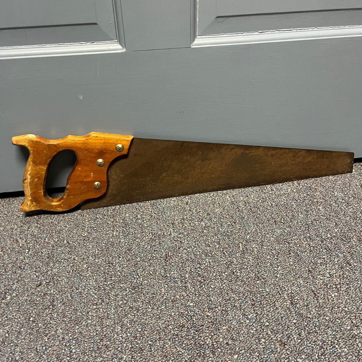 Lot contains a handsaw with a wooden handle, metal Eagle brand oil can, and a steel caliper. Saw measures 5.5” x 1” x 24” long.