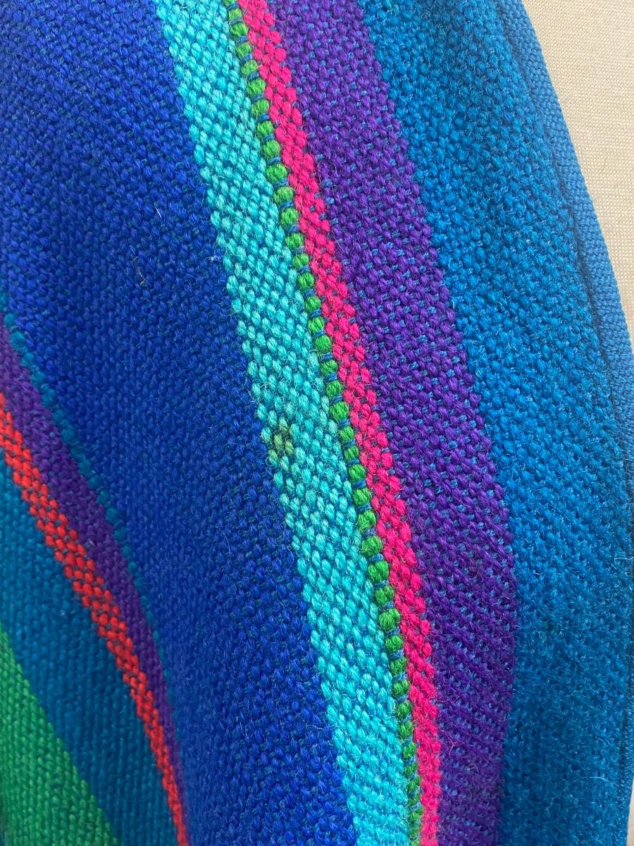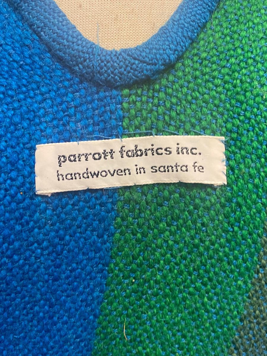 Brightly colored handwoven serape poncho from Parrott Fabrics Inc Sante Fe. Blue & green stripes with red thin stripe accent. Open front, fringed edge. No size tags, fits a medium to probably XL nicely. In good condition, one faint tiny spot, no holes. Feels like wool or wool blend.