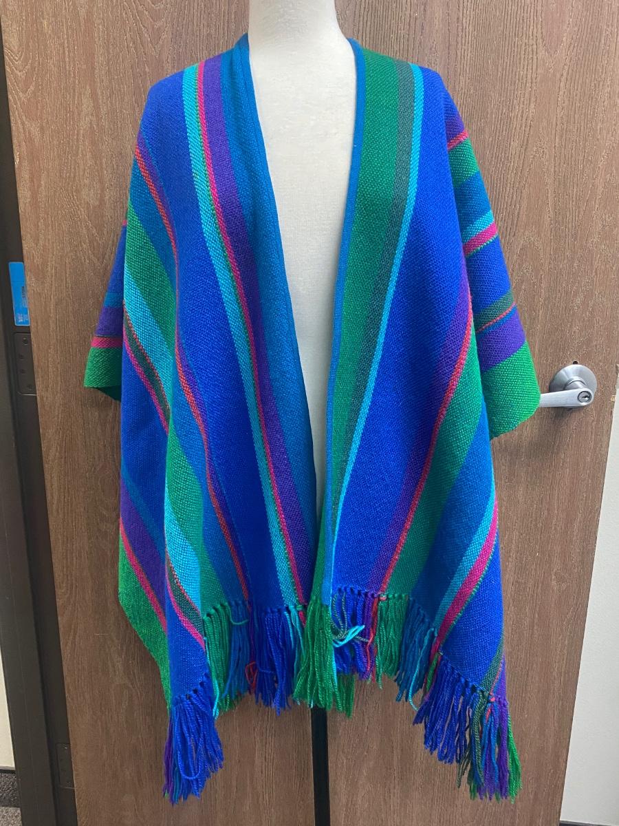 Handwoven Fringed Open Front Blue Green Striped Poncho Serape Parrott Fabrics Inc