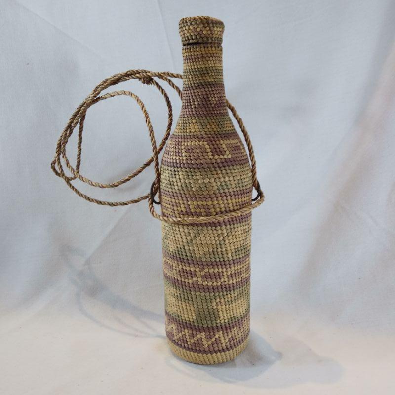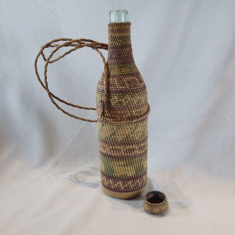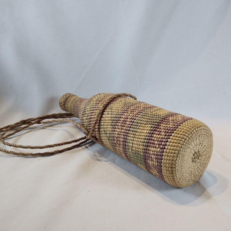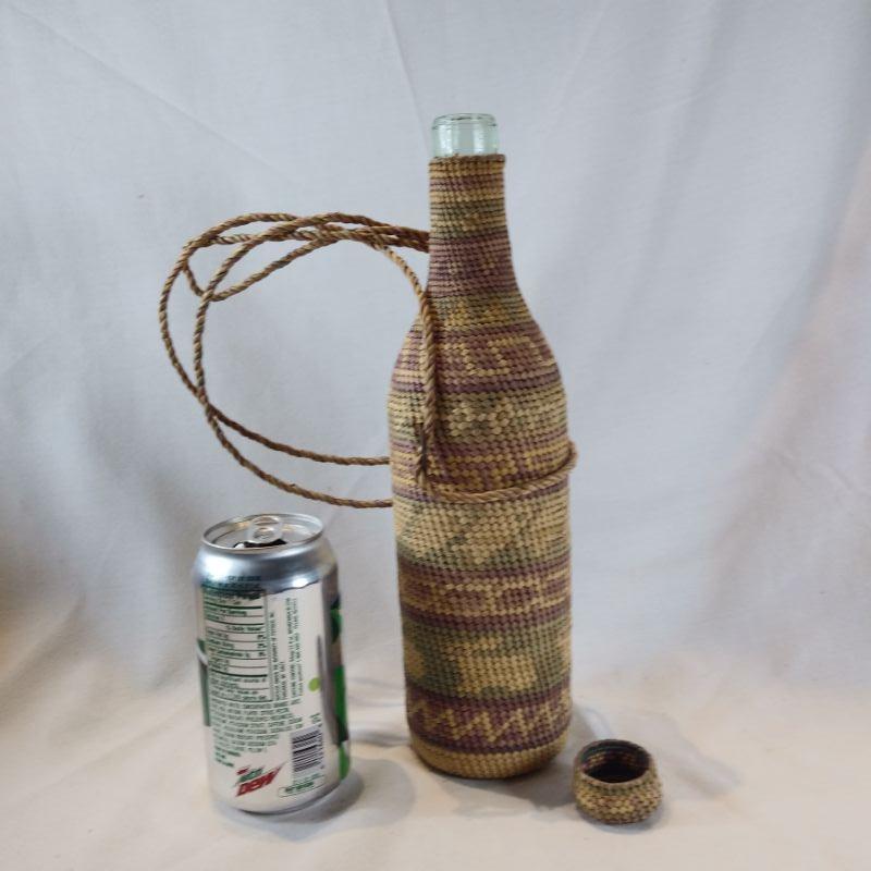 This is a excellent example of a handwoven straw covered glass bottle with a very long shoulder strap. The bottle is 12-inches tall X 3-1/2-inches in diameter. The shoulder strap is 30-inches long. Beautiful work in pastel green, purple and gold with natural straw.. Looks unused. In very good condition. And perfect for display and/or use.