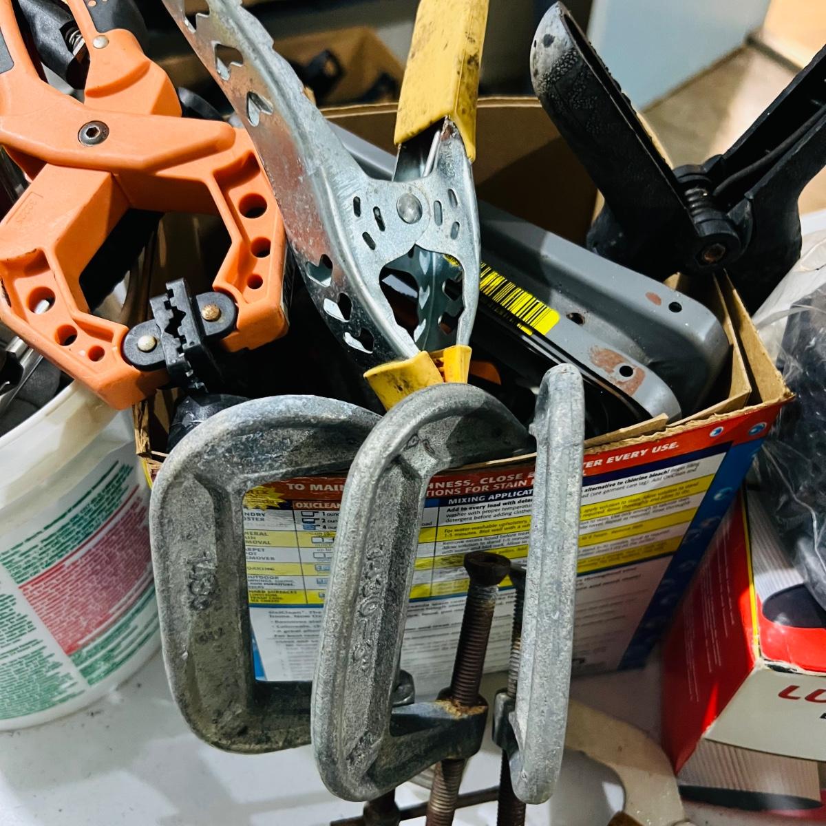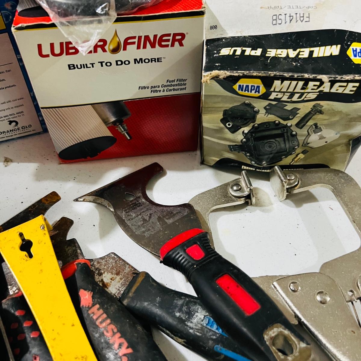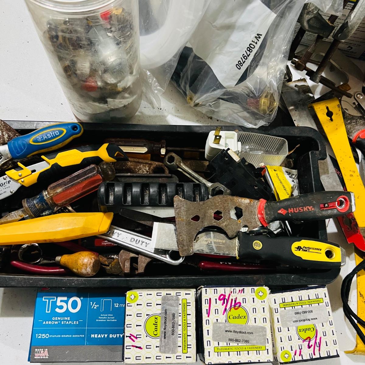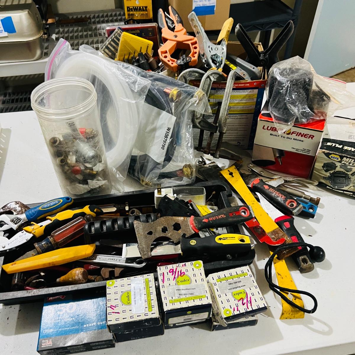 Lot includes a large variety of tools including a Husky screwdriver set, clamps, vices, wrenches, T-Handle Hex Key Sets and much more.