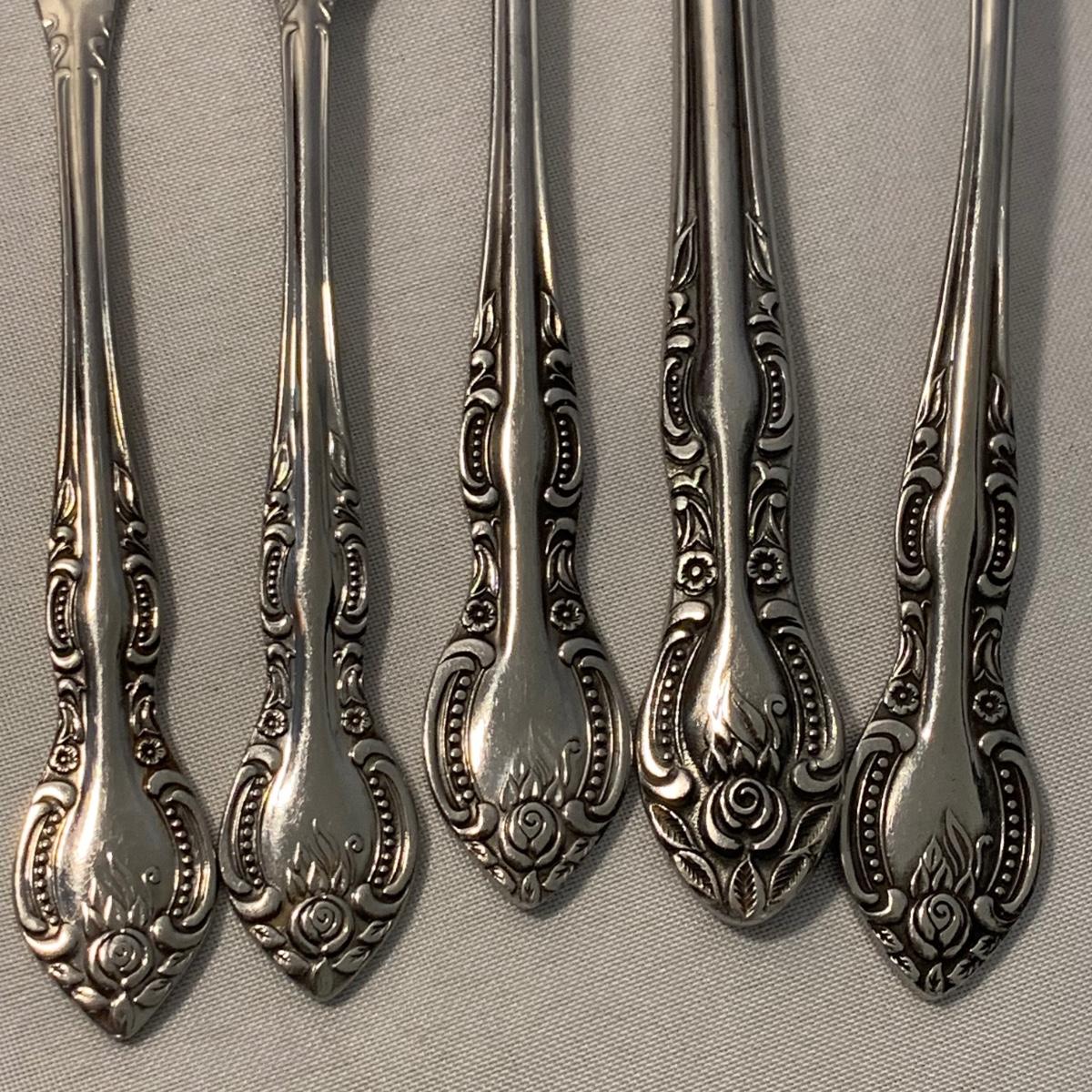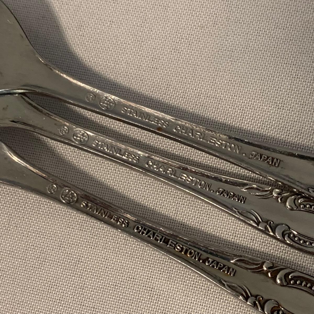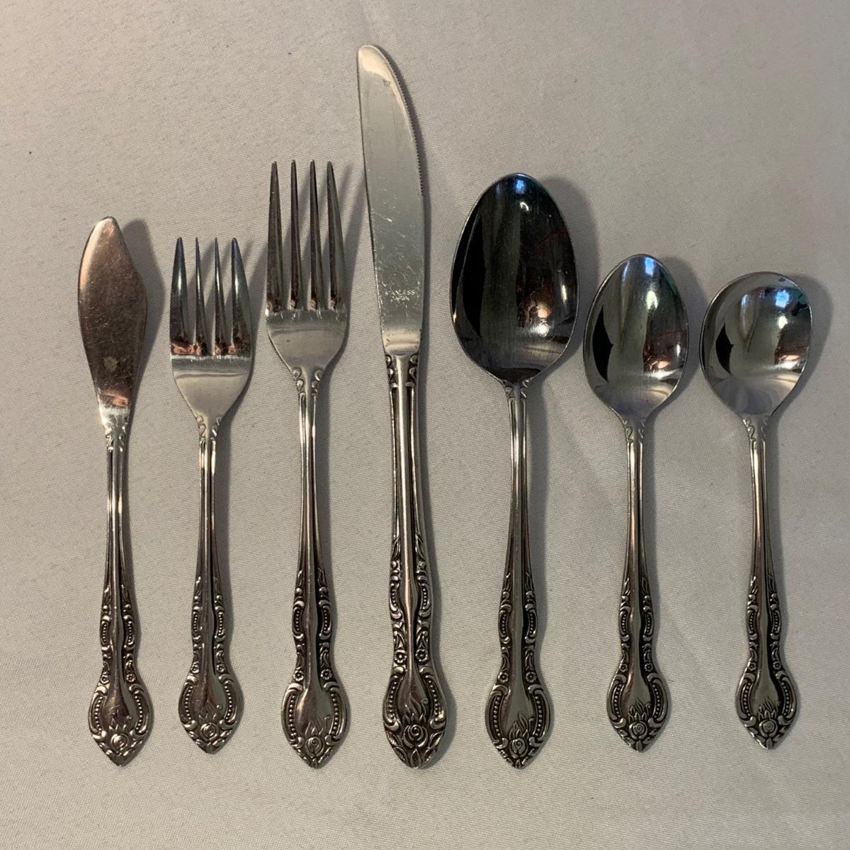 A complete five-piece place setting for six people, plus extras. Flatware is by Hanford Forge in their Charleston Classic pattern. Set has six salad forks, seven soup spoons, and eight (or more) each of dinner forks, spoons, and knives. Also included is one butter knife and one sugar spoon. Set is used but in good condition. 10” x 12.5” green plastic organizer is included.