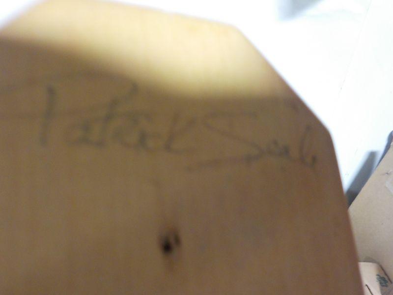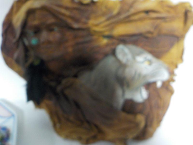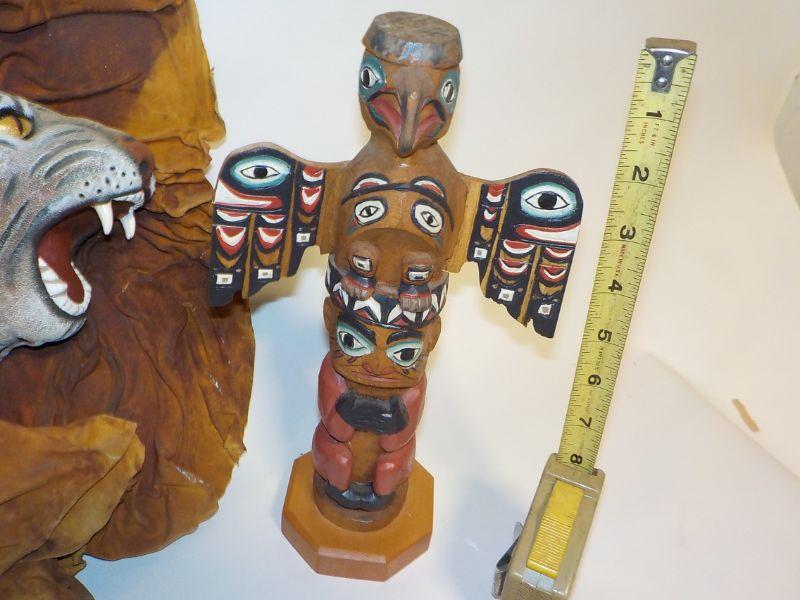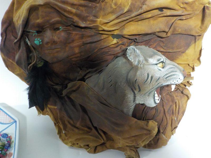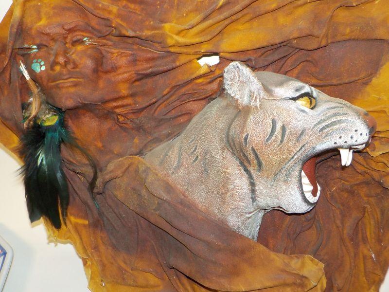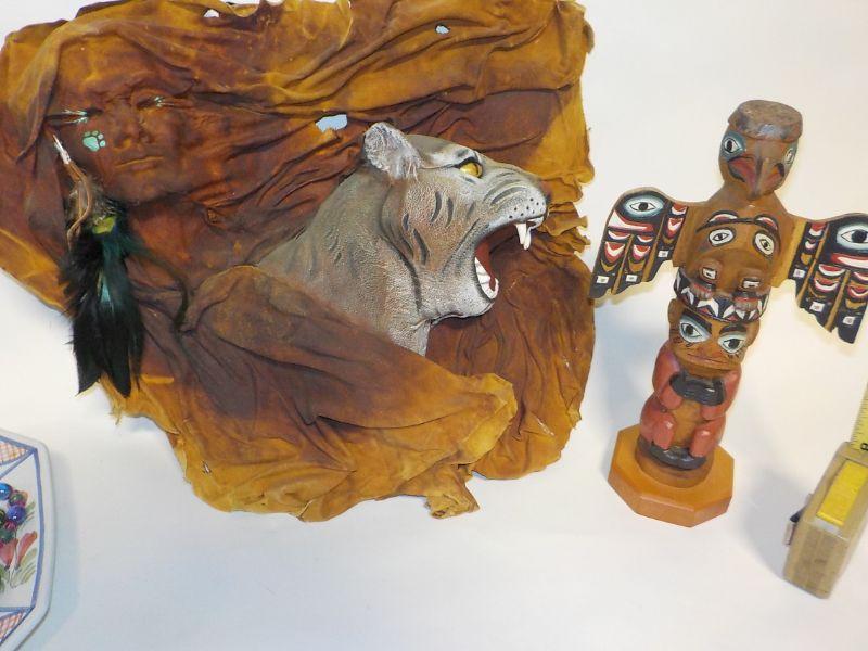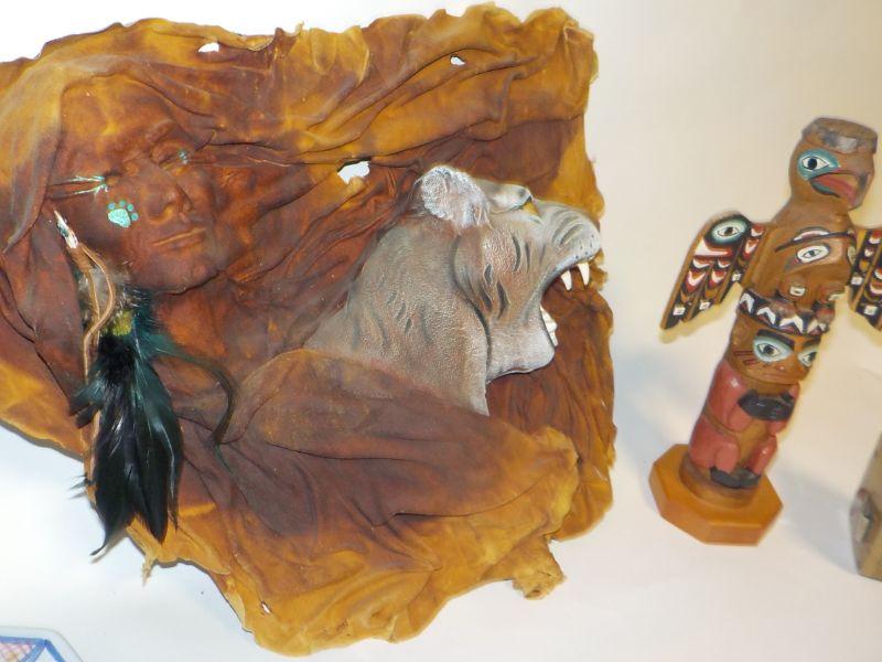 Patrick Seale signed Inuit totem, and sculpted, painted leather wall art of woman and bobcat head.