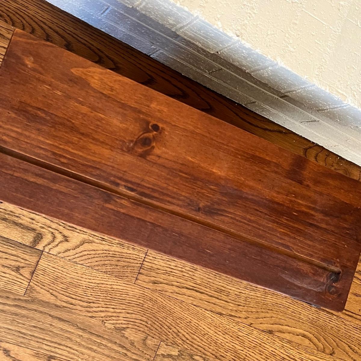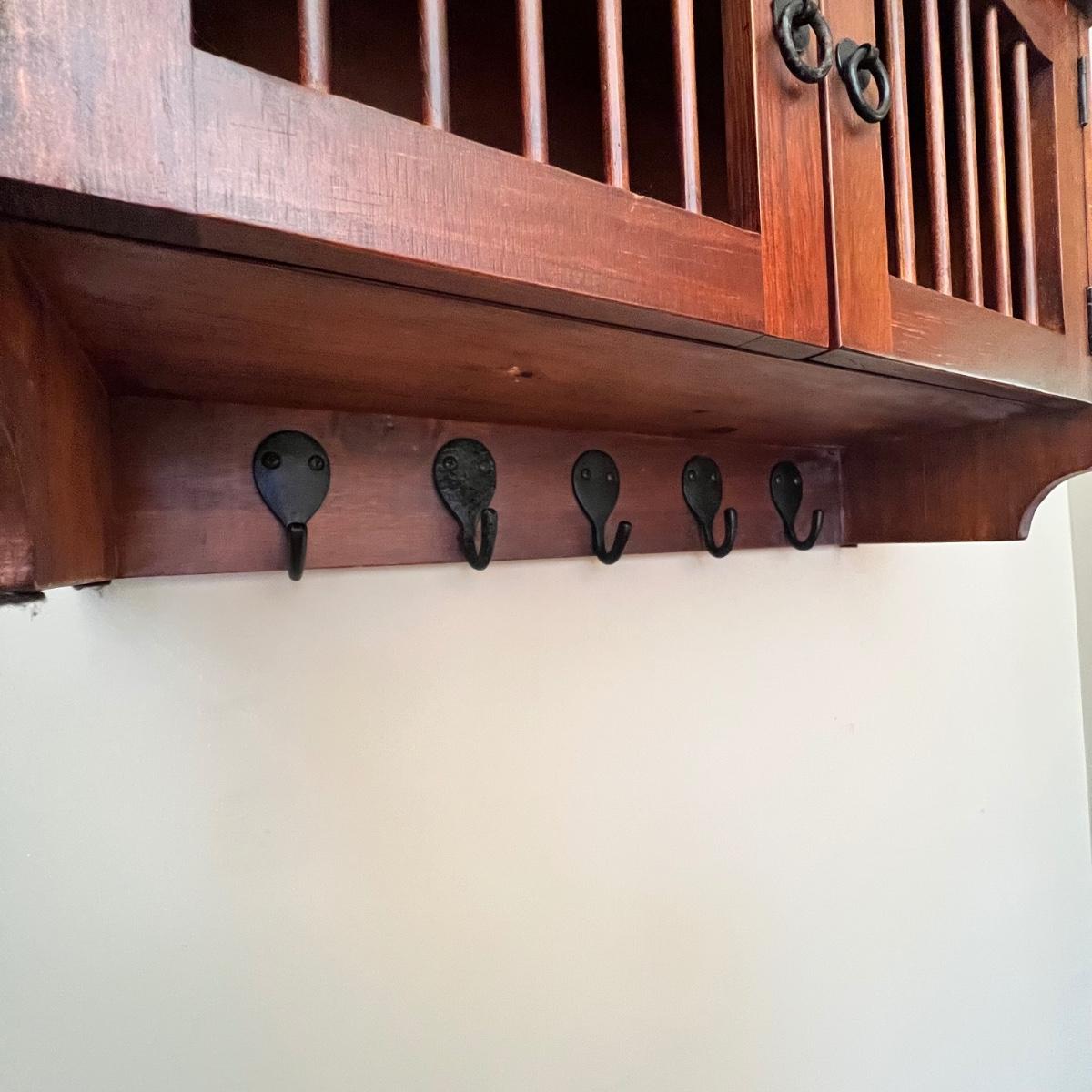 Small hanging cabinet appears to be made from pressed wood. It has black metal hooks to hold coffee/tea mugs and a plate rail on top.