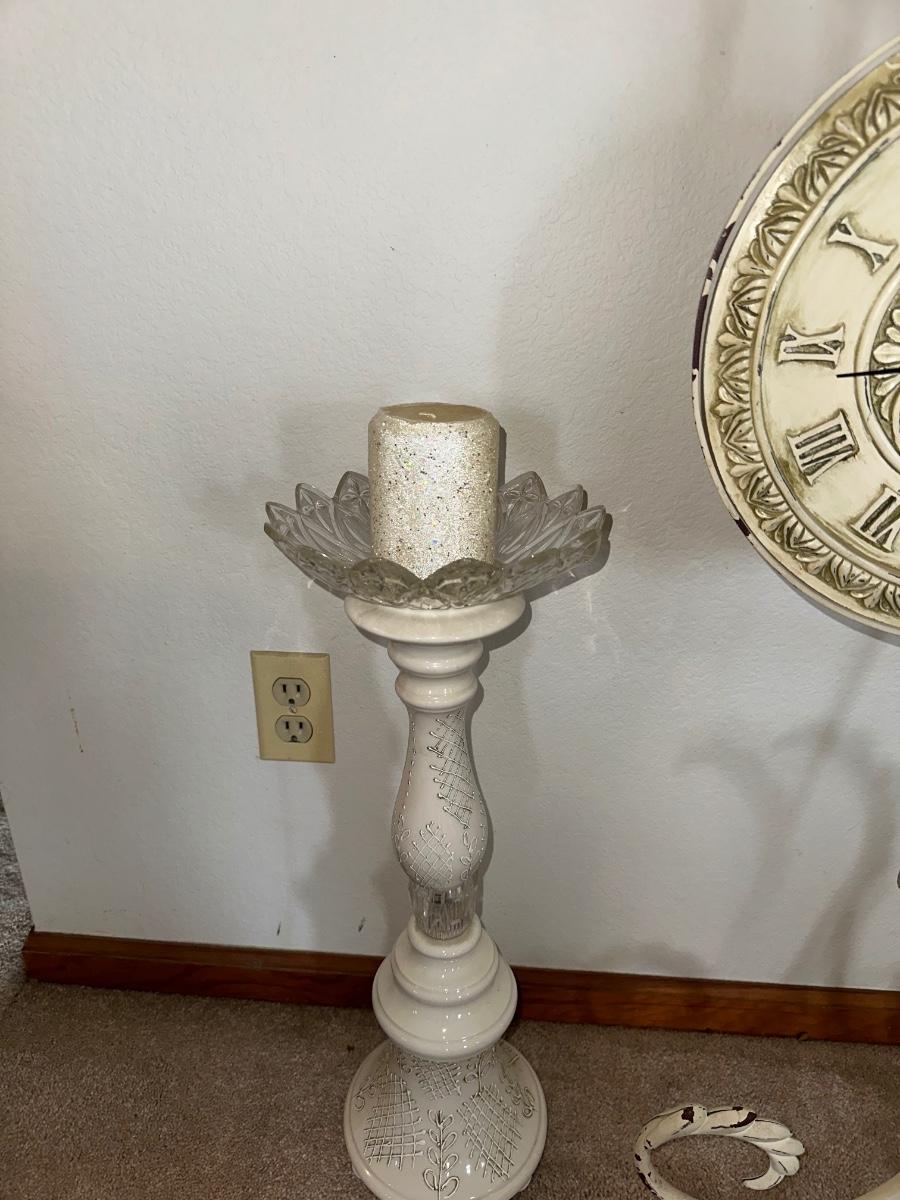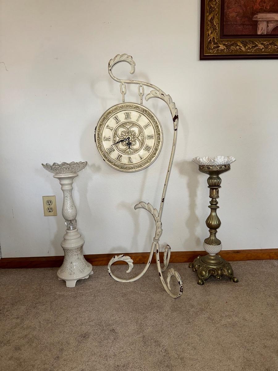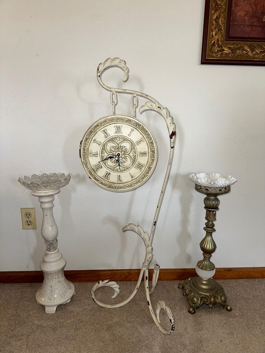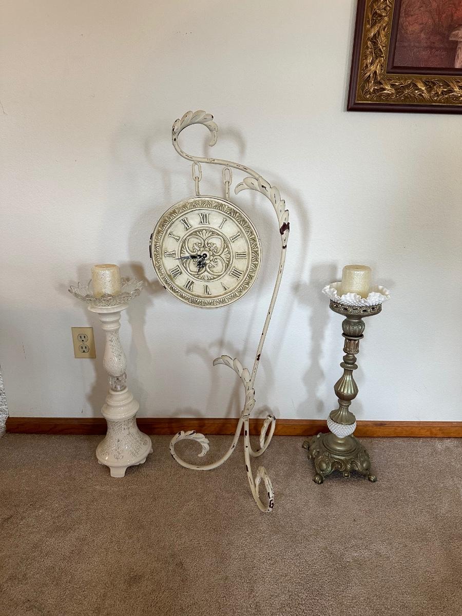 HANGING CLOCK ON AN IRON FRAME AND 2 FLOOR PILLAR CANDLE HOLDERS