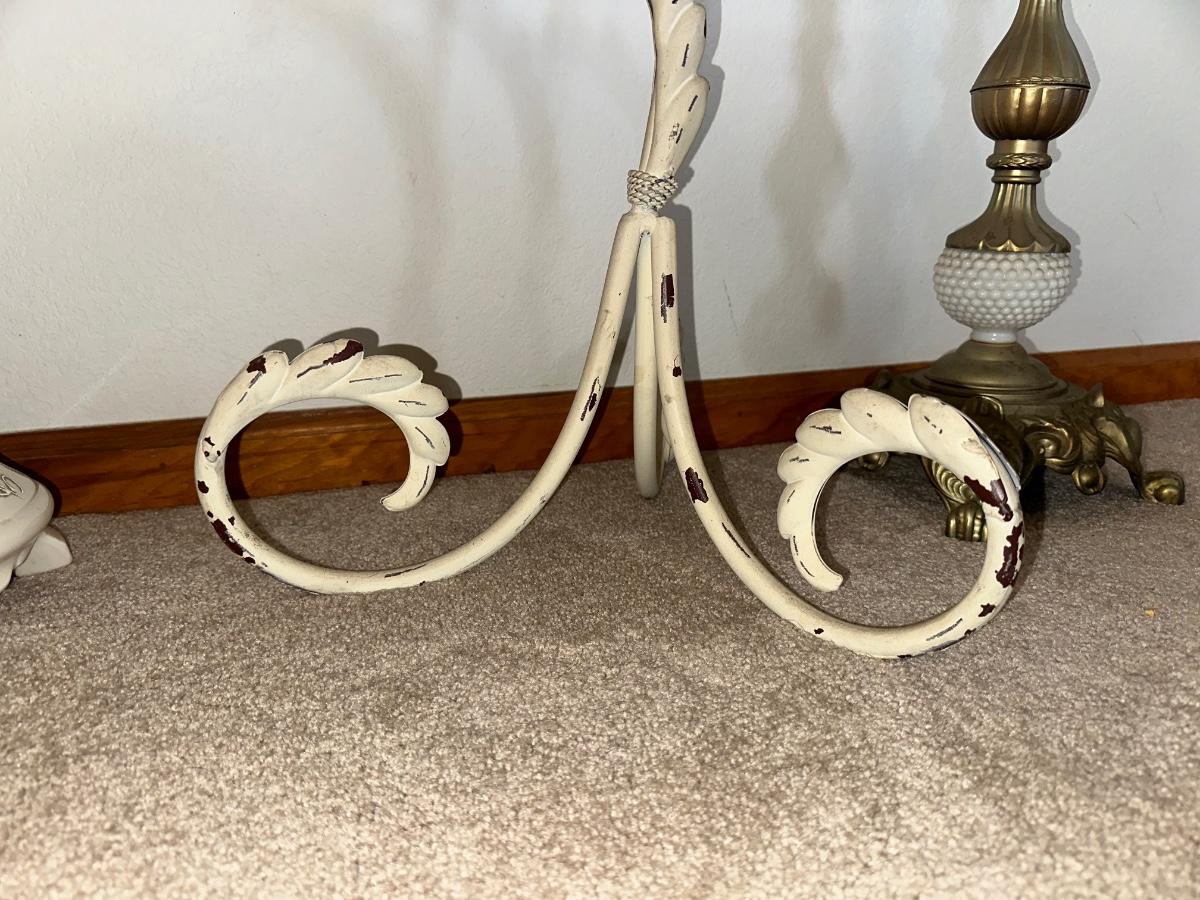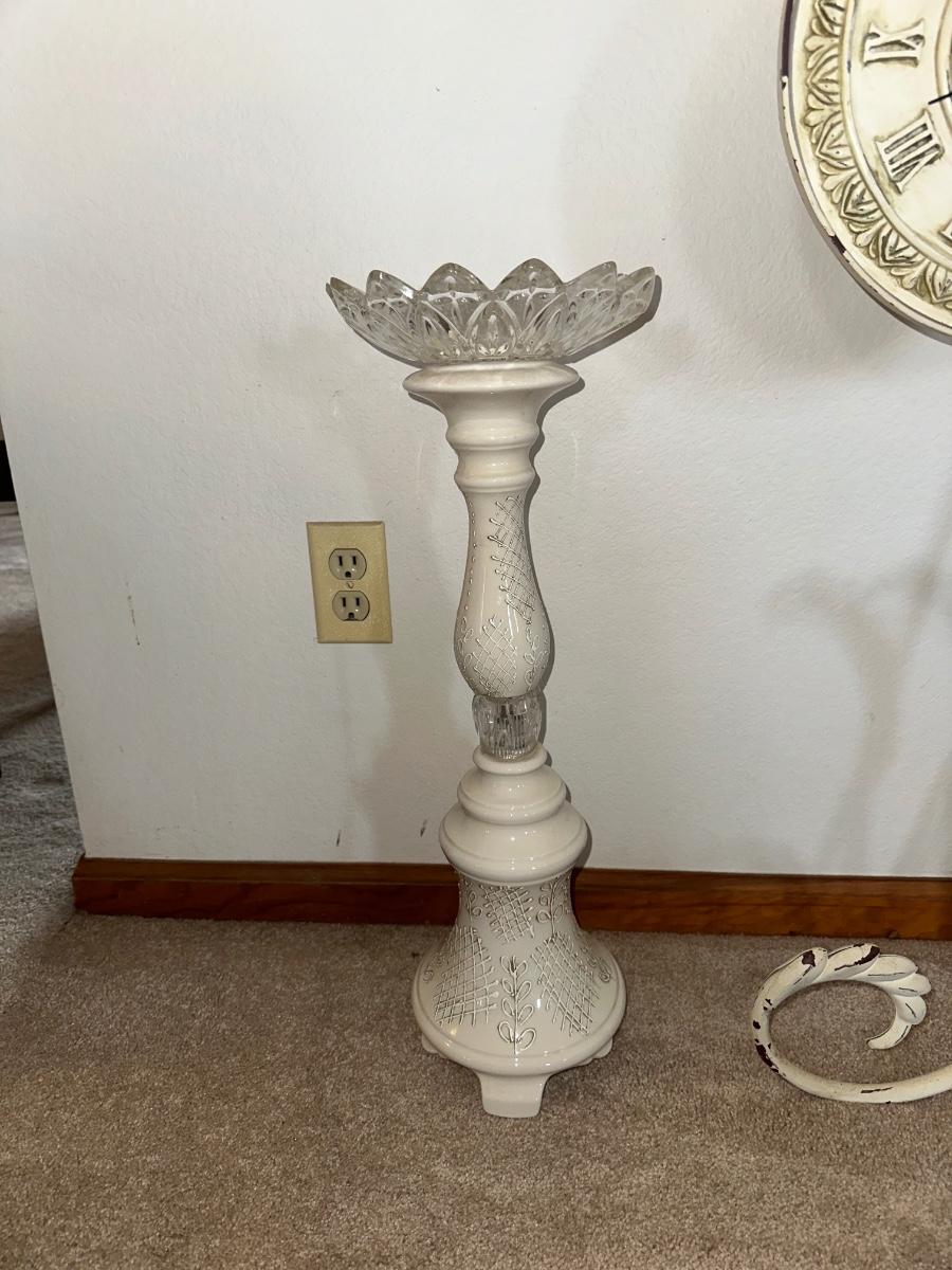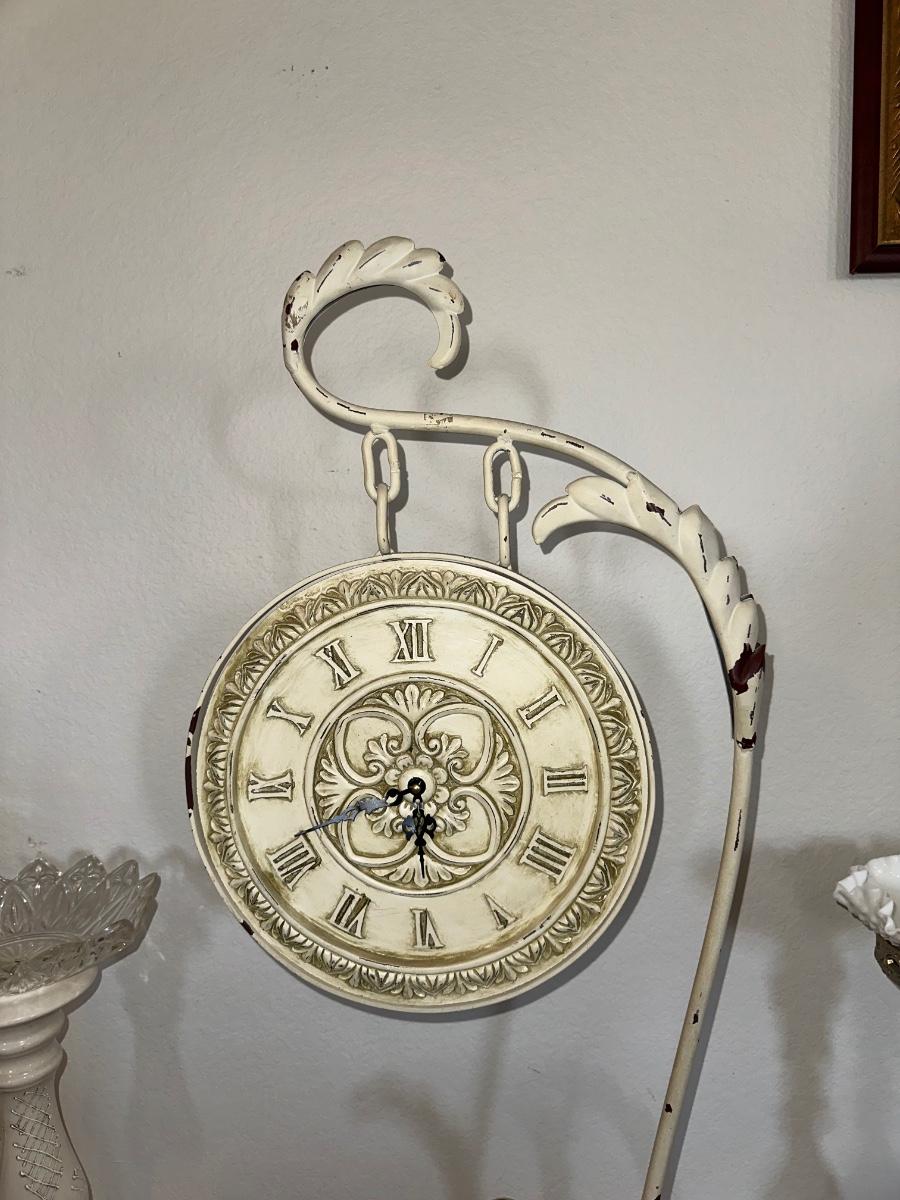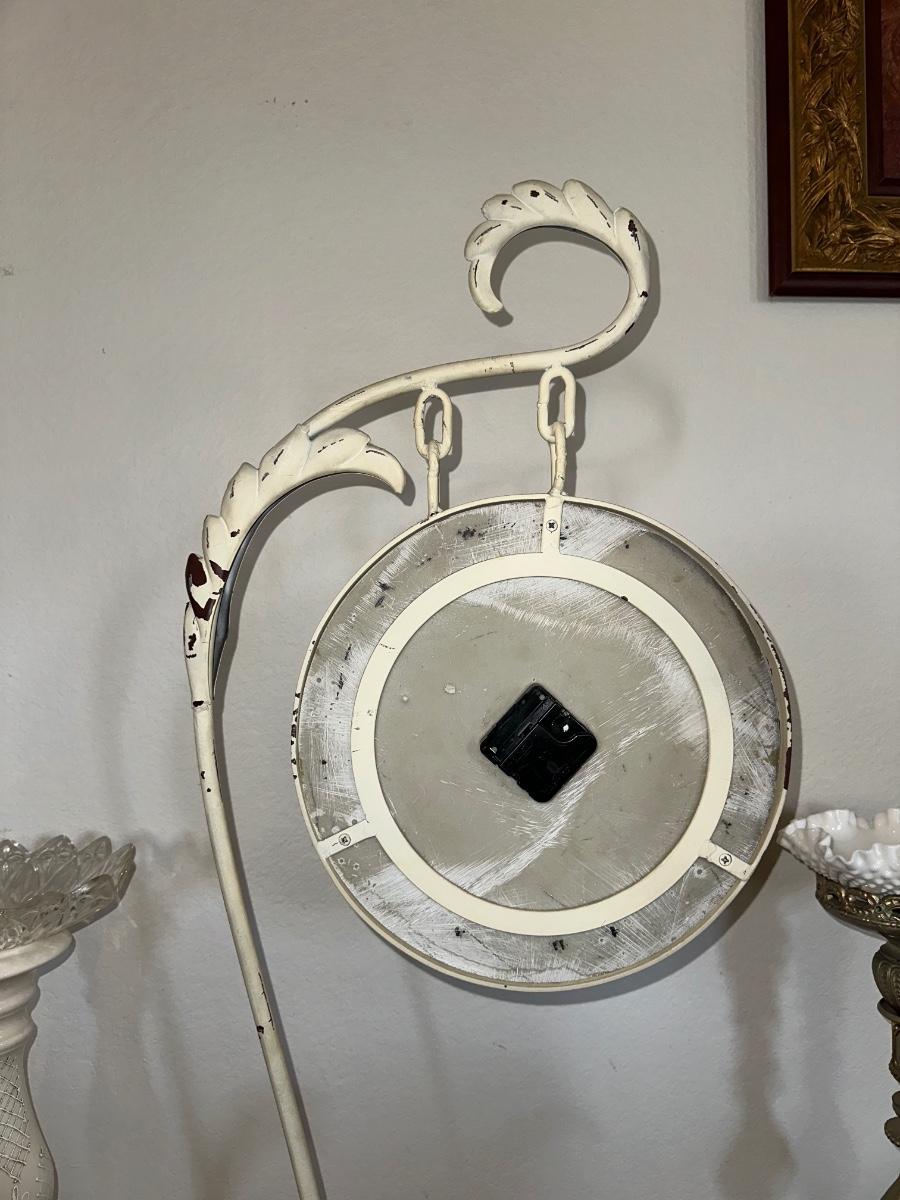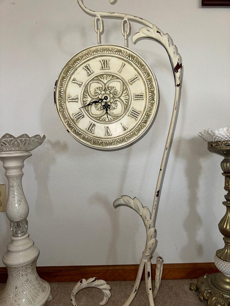 HANGING CLOCK ON AN IRON FRAME AND 2 FLOOR PILLAR CANDLE HOLDERS