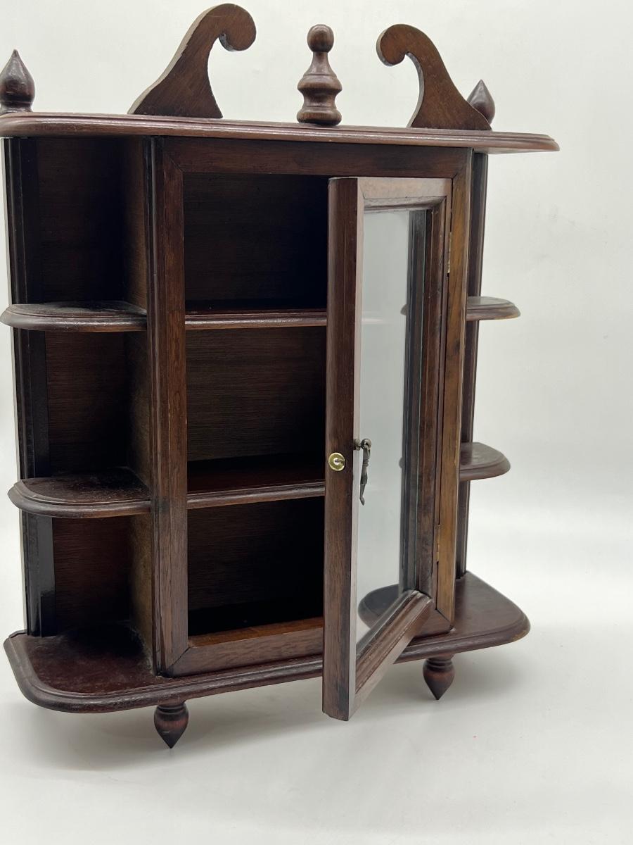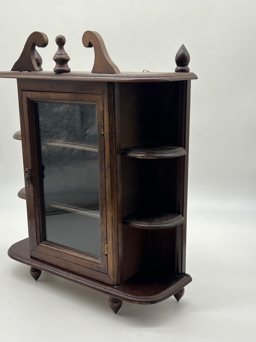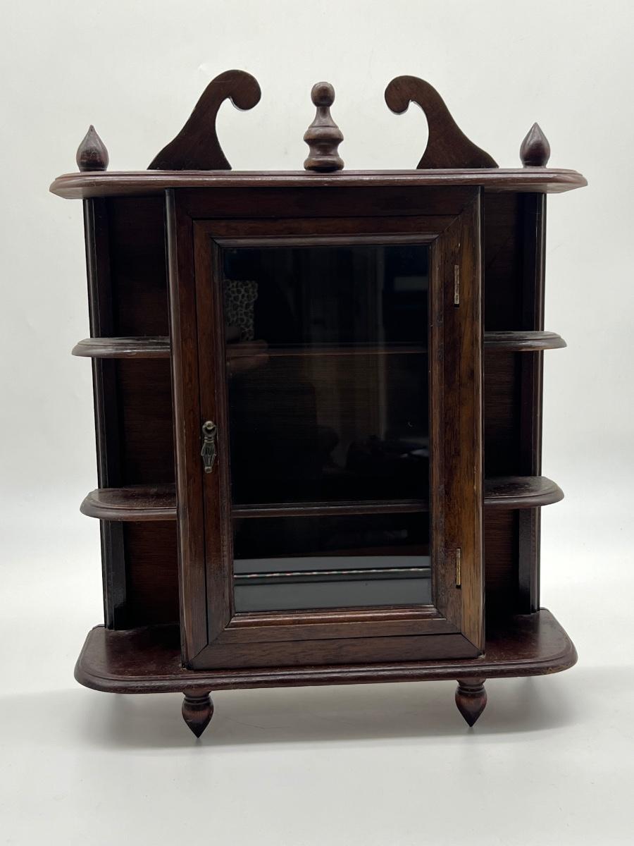 Small Hanging Curio Cabinet With glass front and three shelves. Measures 16 inches tall 14 1/2 inches wide and 4 1/2 inches deep.