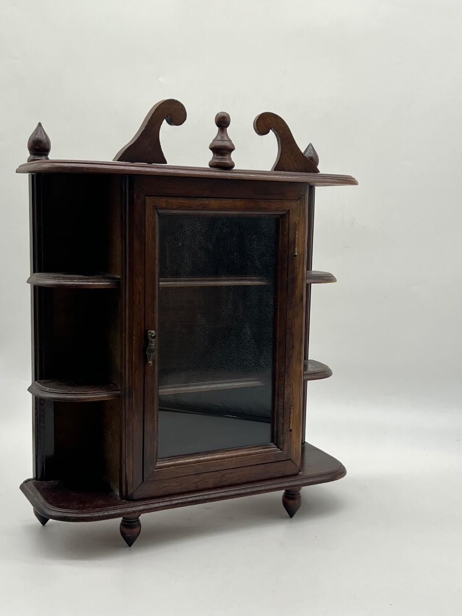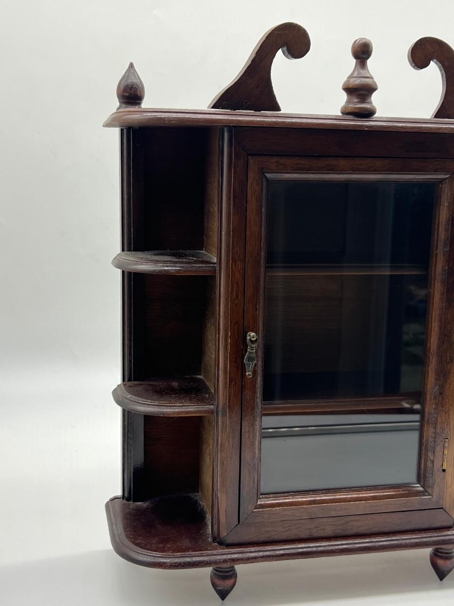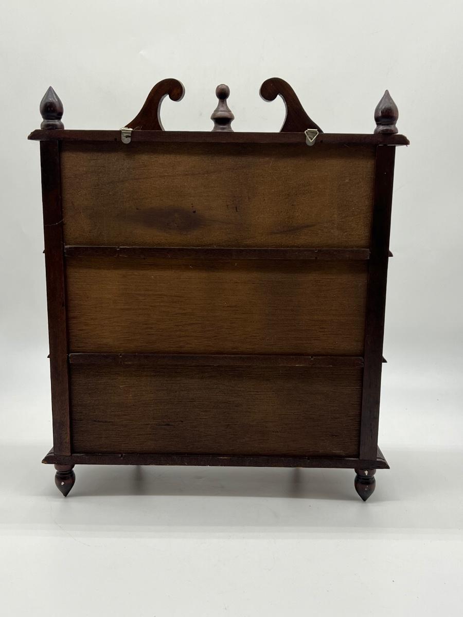 Small Hanging Curio Cabinet With glass front and three shelves. Measures 16 inches tall 14 1/2 inches wide and 4 1/2 inches deep.