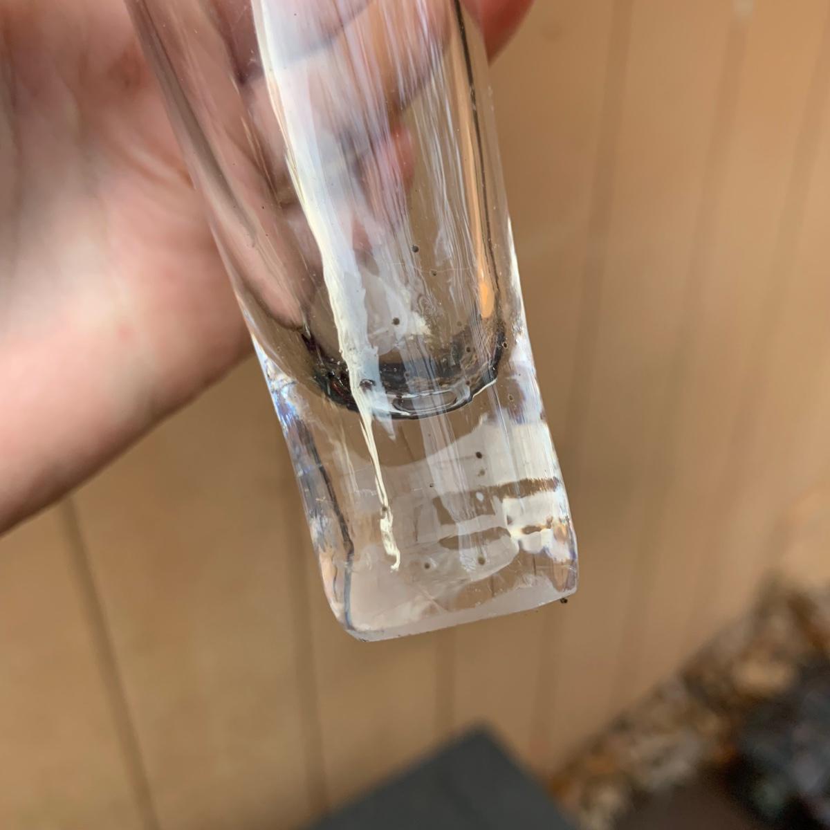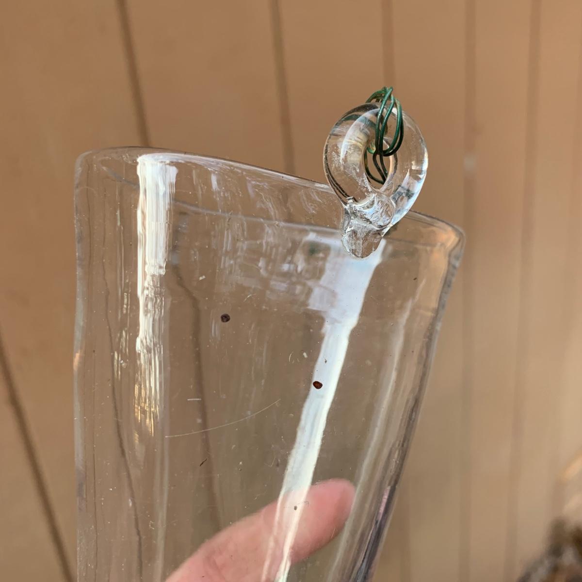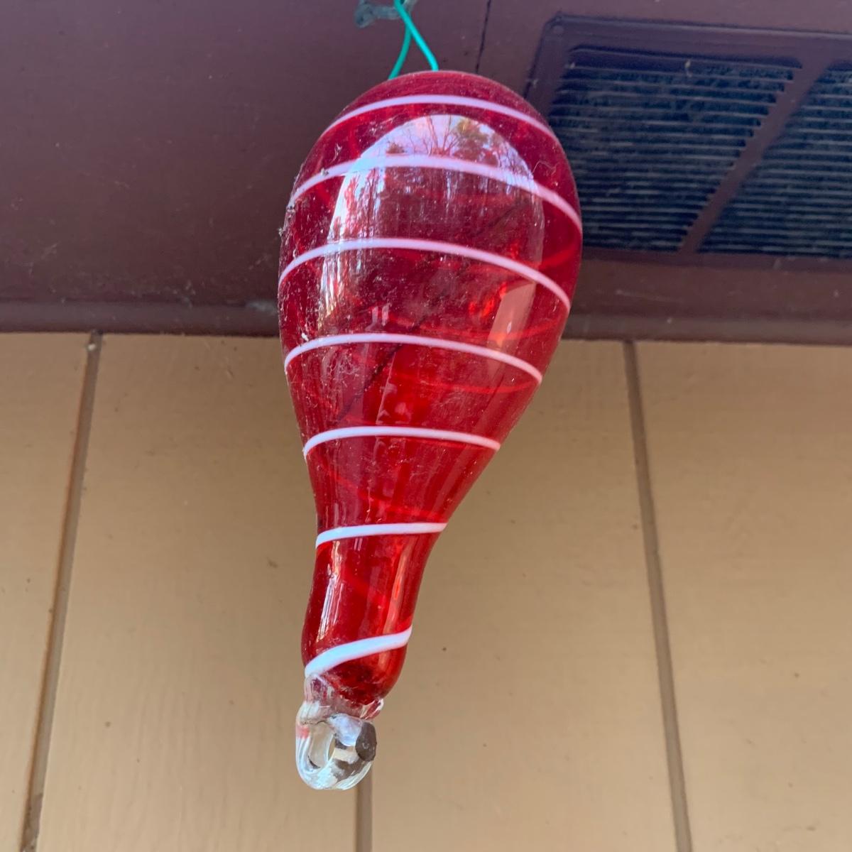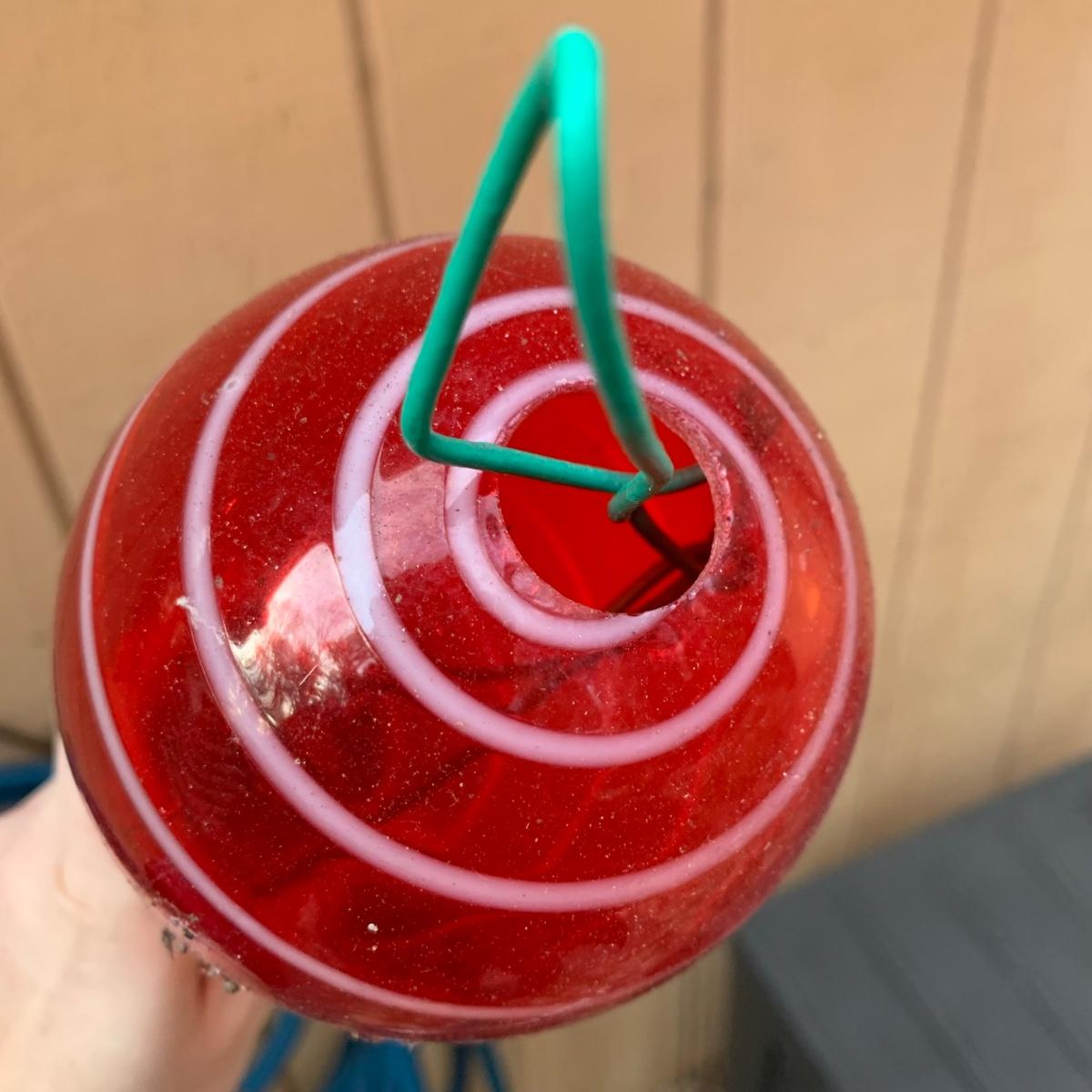 Three hanging glass outdoor decor items. One is a beautiful blue bell hanging on rope with a wooden clapper. The glass part is approximately 5.25” x 7”H. Total length including rope and clapper is about 18”. A clear glass item that appears to be a hanging vase and a red and white hanging decor item are included as well. Items are dusty from outdoor use.