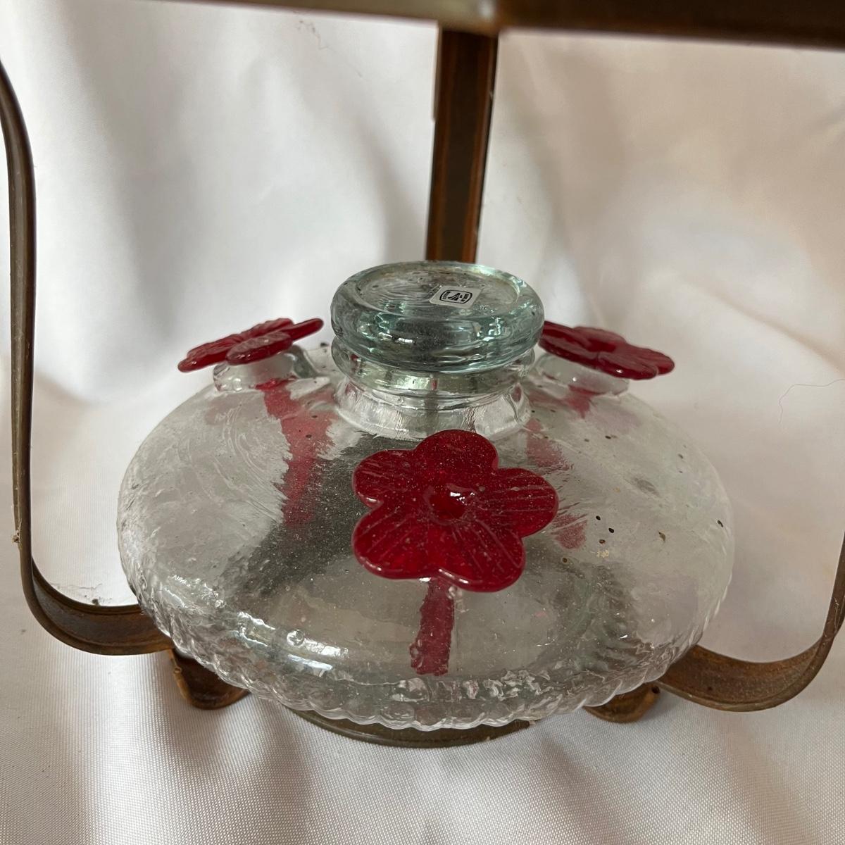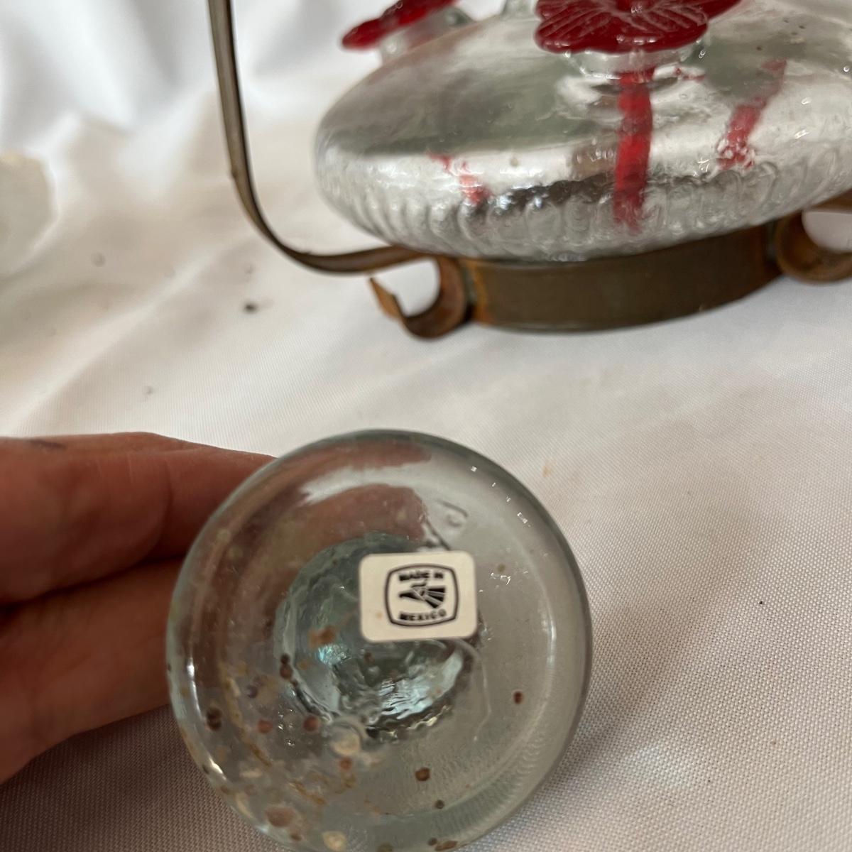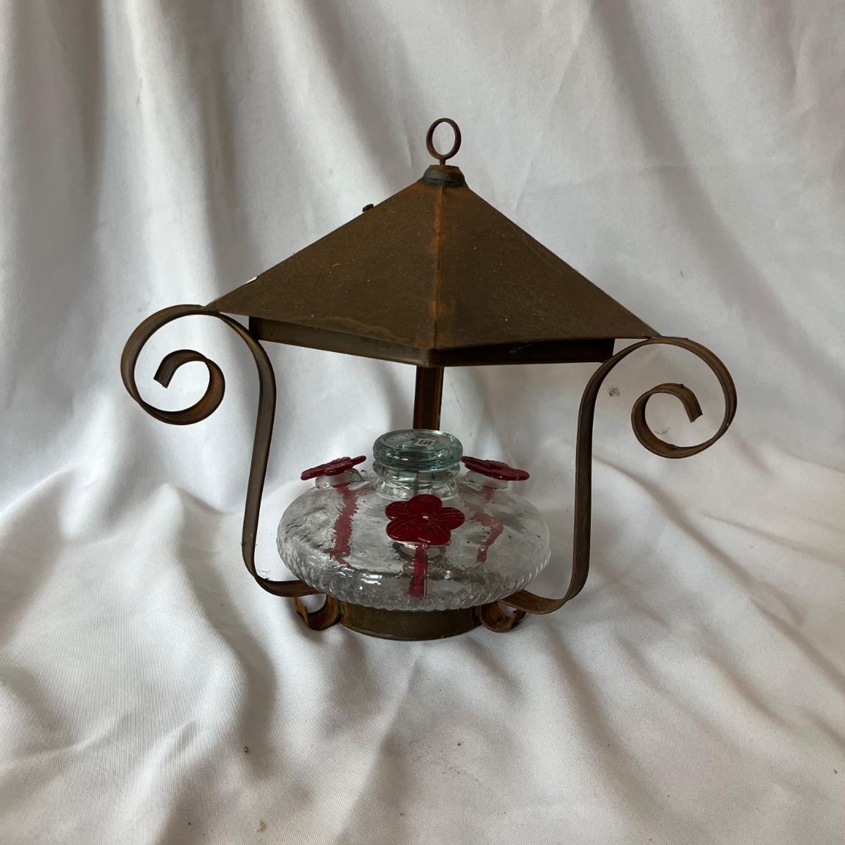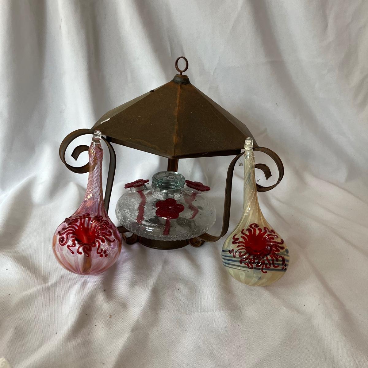Lot includes two glass hanging hummingbird feeders and a copper and glass hanging hummingbird feeder that was made in Mexico and measures 12”D x 11”H.