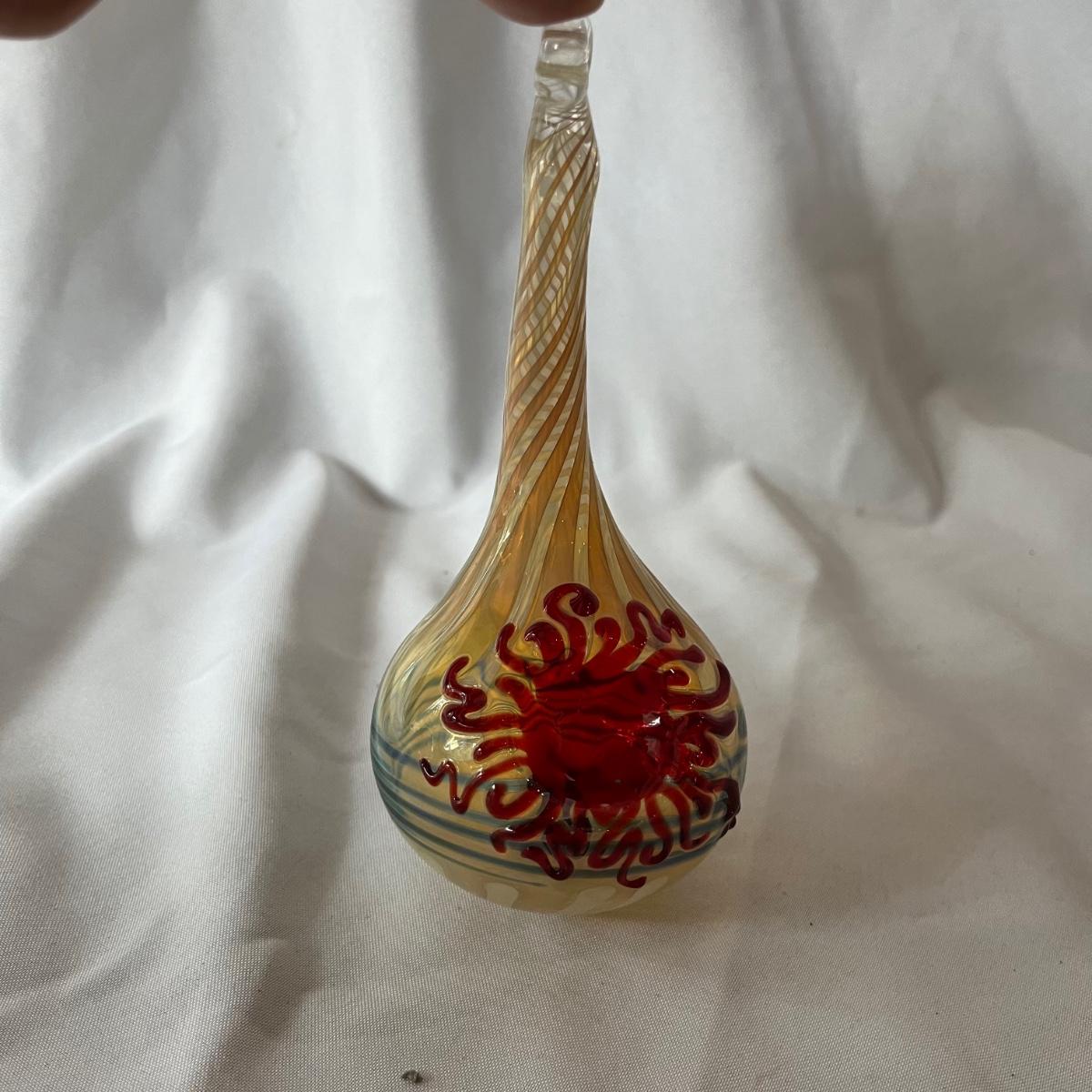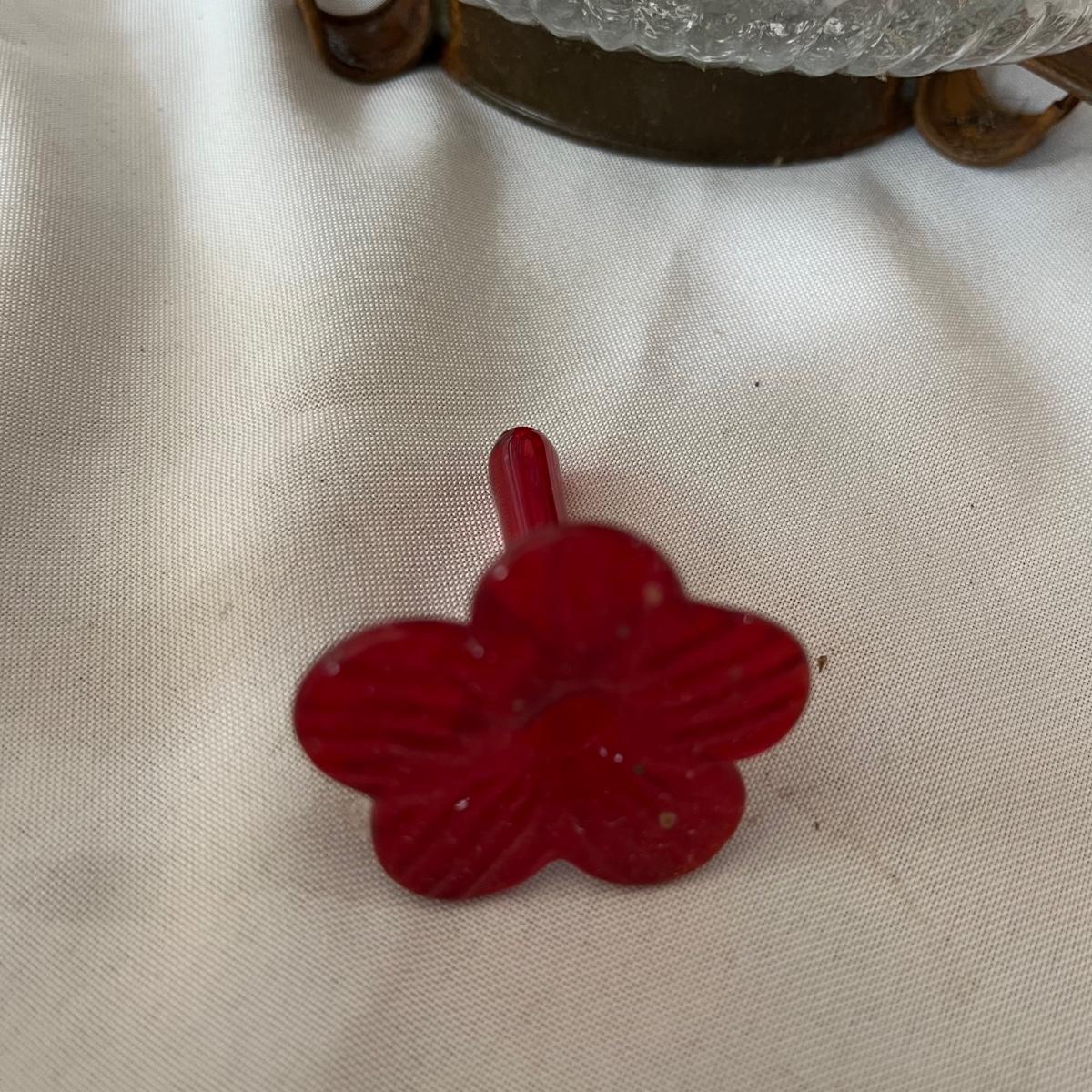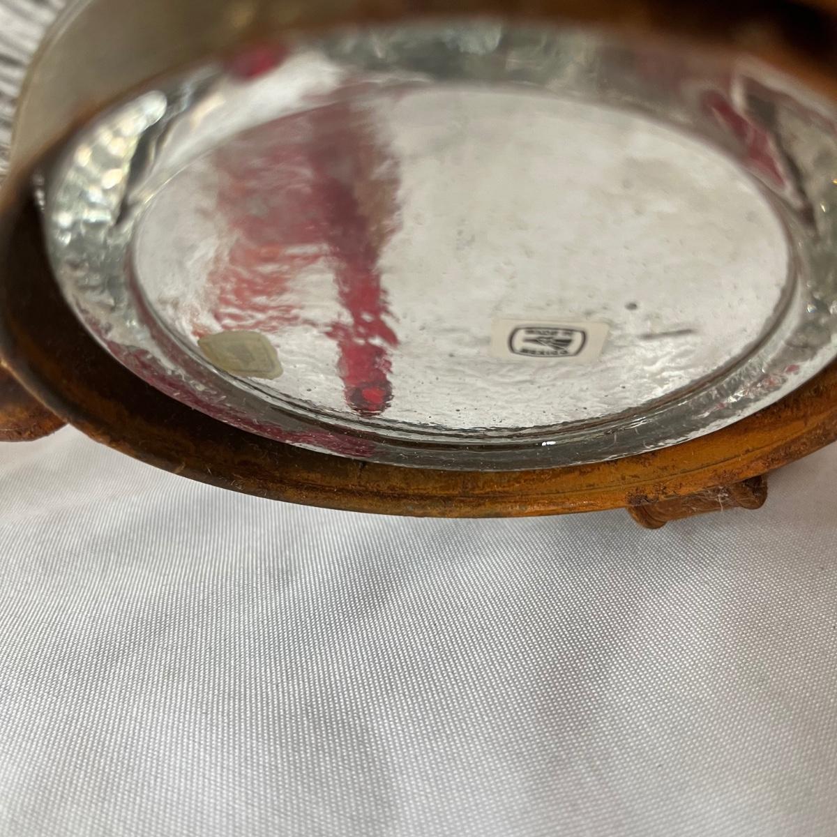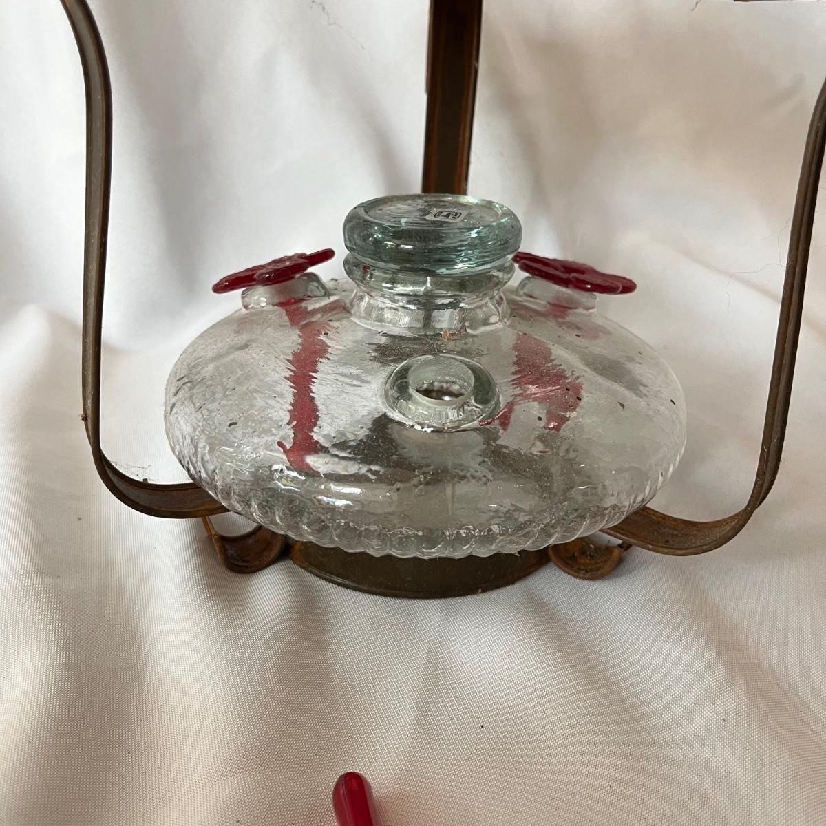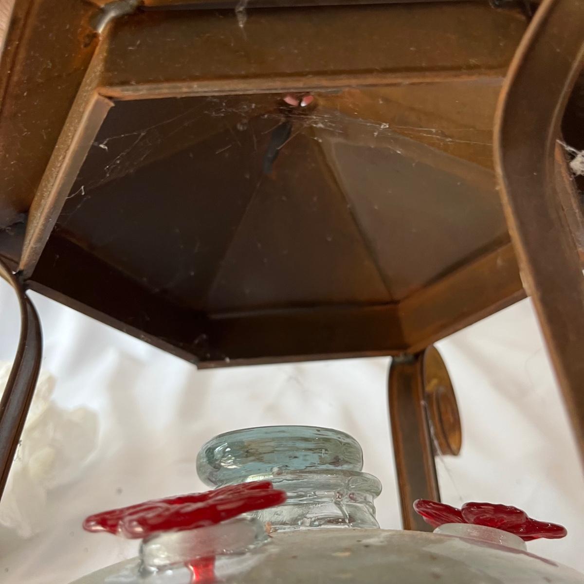 Lot includes two glass hanging hummingbird feeders and a copper and glass hanging hummingbird feeder that was made in Mexico and measures 12”D x 11”H.