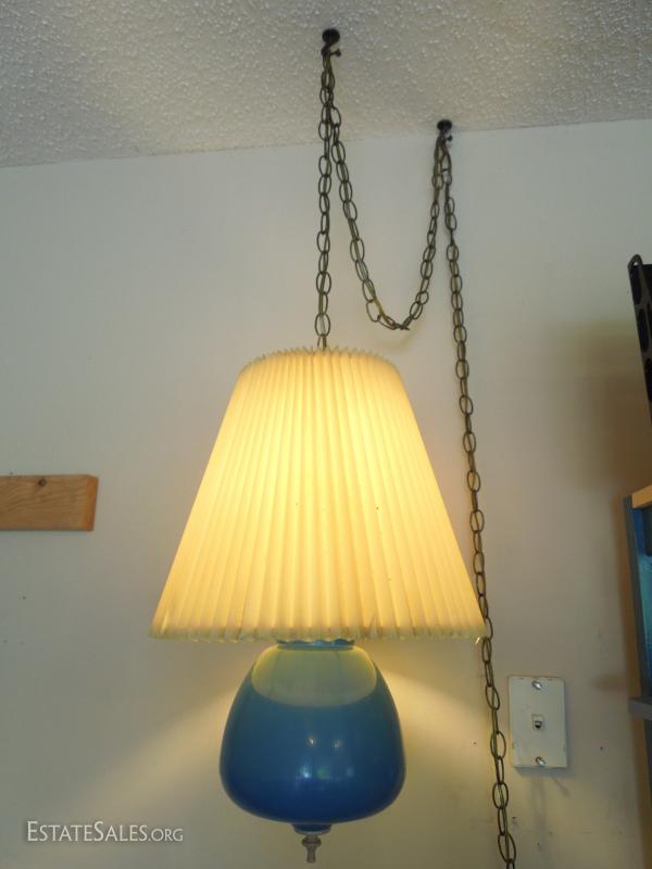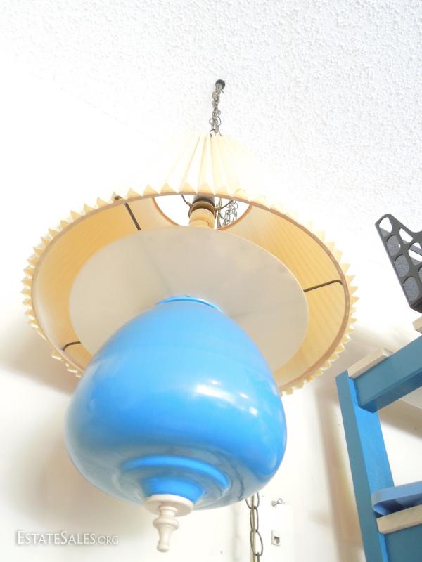Blue glass base and pleated shade. Shade is yellowed from age and lining beginning to crack.. Chain with cord woven in.
