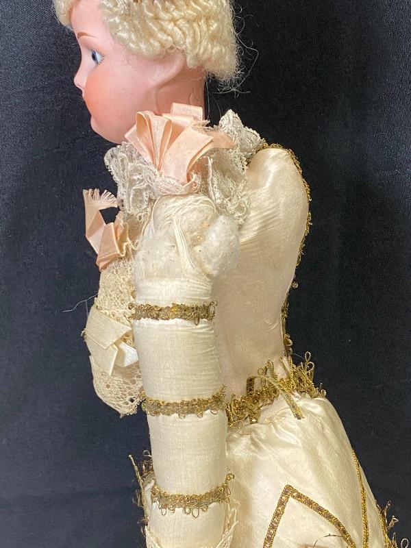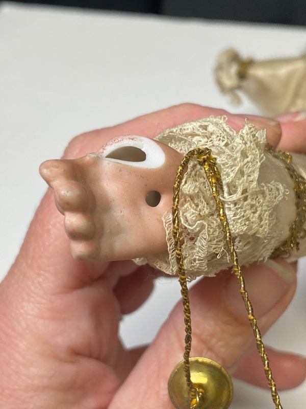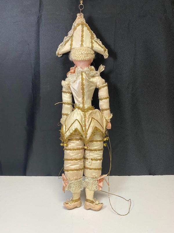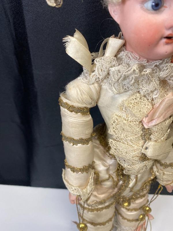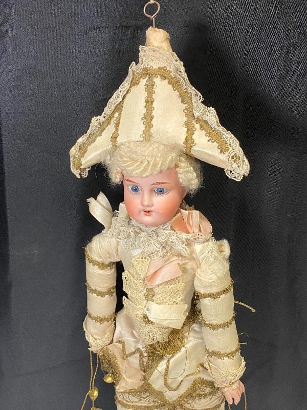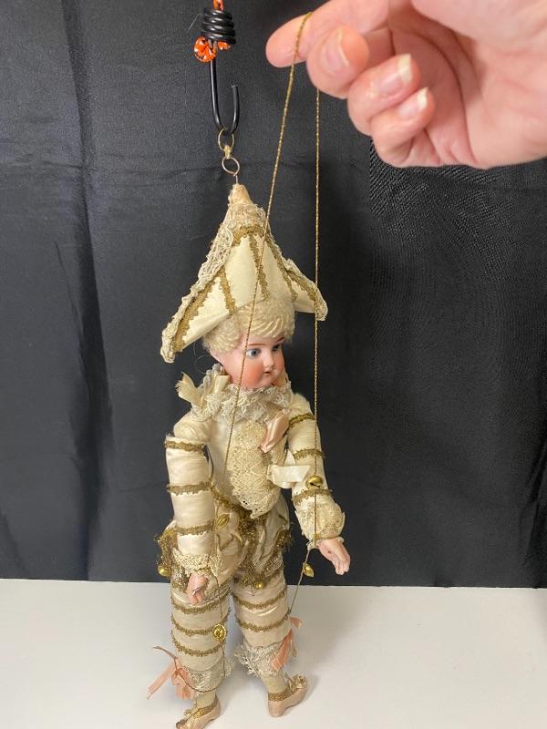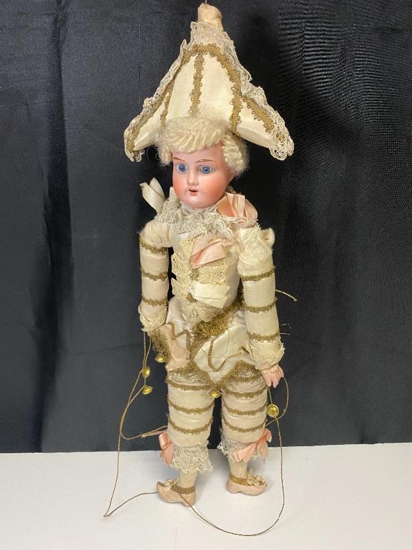 Single string marionette style jester doll. Stuffed body with porcelain head and hands. One hand is broken. Marked Germany 10/0 on back of head. Blue glass eyes. He doesn't want to stand or sit, legs do not bend well at hip, has a ring for hanging at the end of hat. Legs might be straw filled by the feel. Clothes are discolored and have some holes. The arms are falling off at the shoulders. A string of bells connects his hands to his legs acts like a marionette when pulled. About 18" size