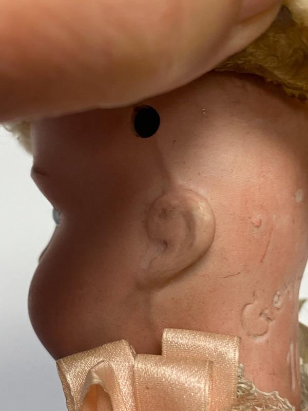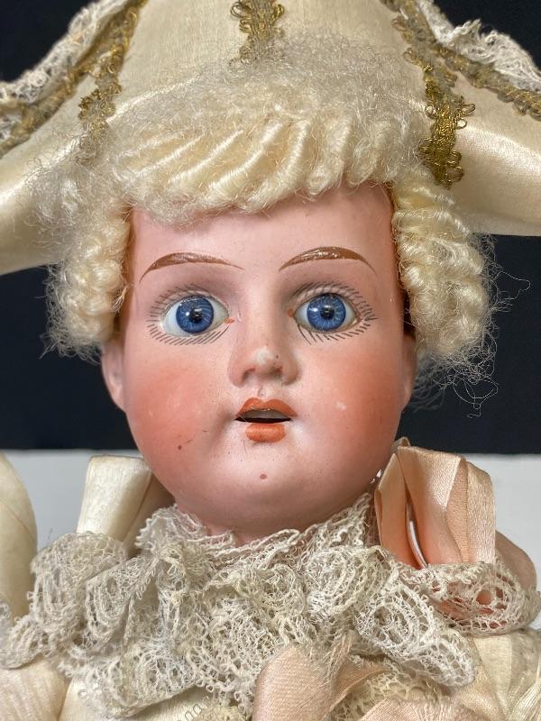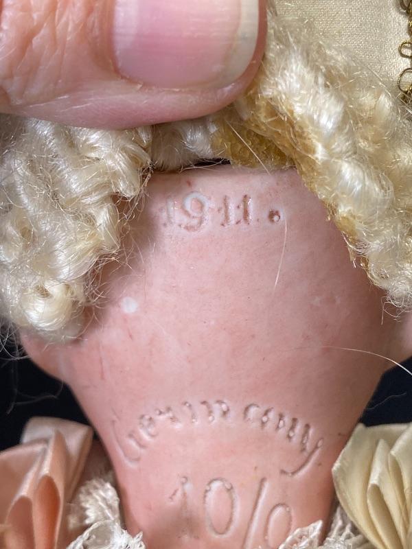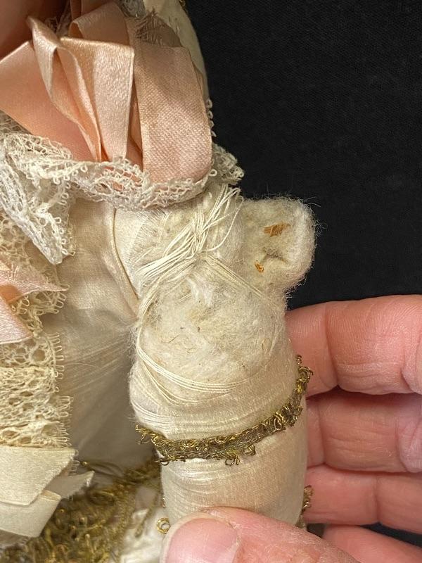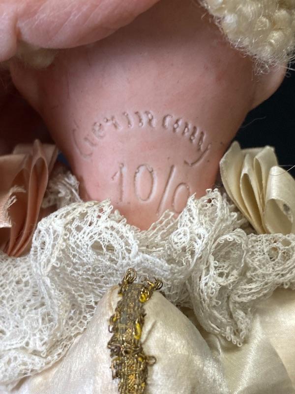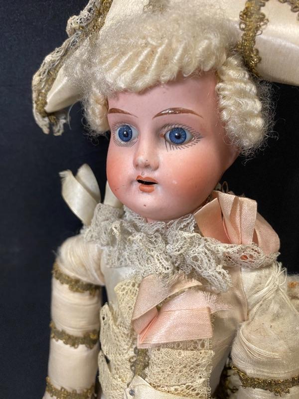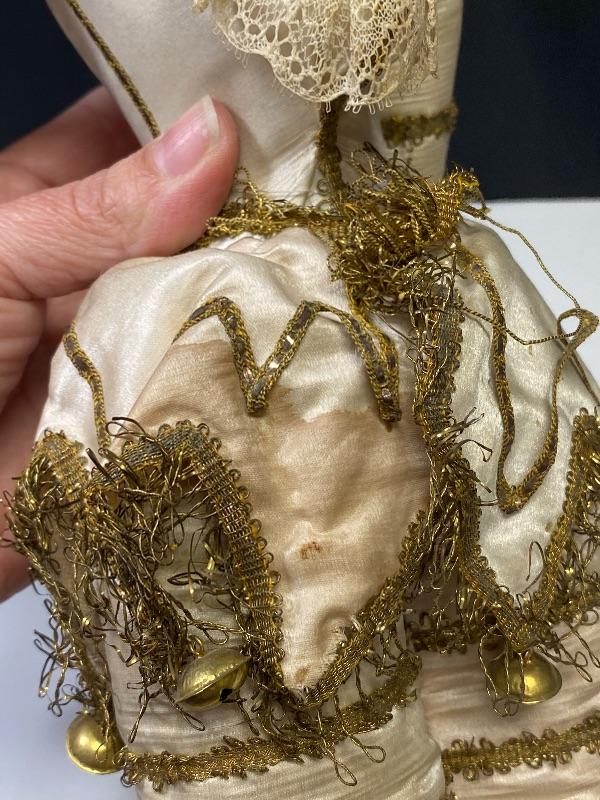 Single string marionette style jester doll. Stuffed body with porcelain head and hands. One hand is broken. Marked Germany 10/0 on back of head. Blue glass eyes. He doesn't want to stand or sit, legs do not bend well at hip, has a ring for hanging at the end of hat. Legs might be straw filled by the feel. Clothes are discolored and have some holes. The arms are falling off at the shoulders. A string of bells connects his hands to his legs acts like a marionette when pulled. About 18" size