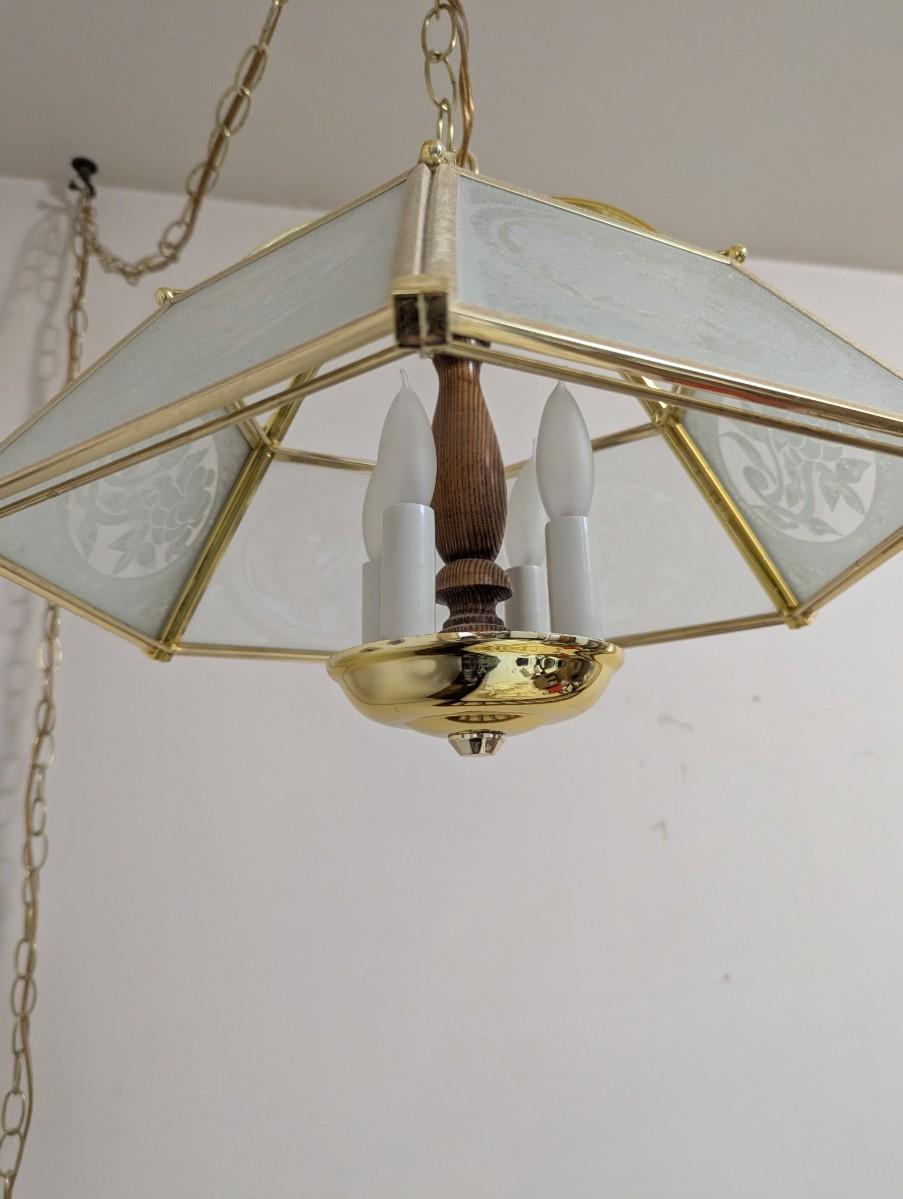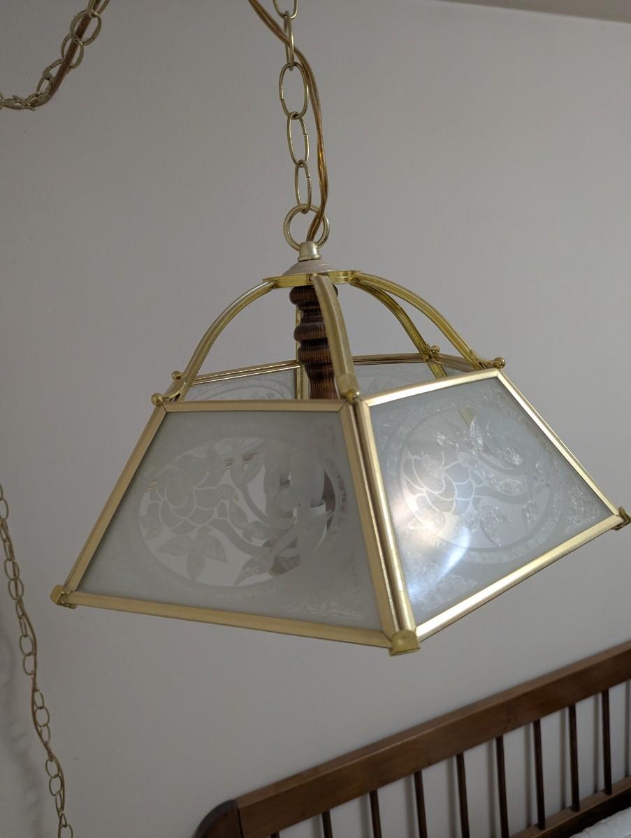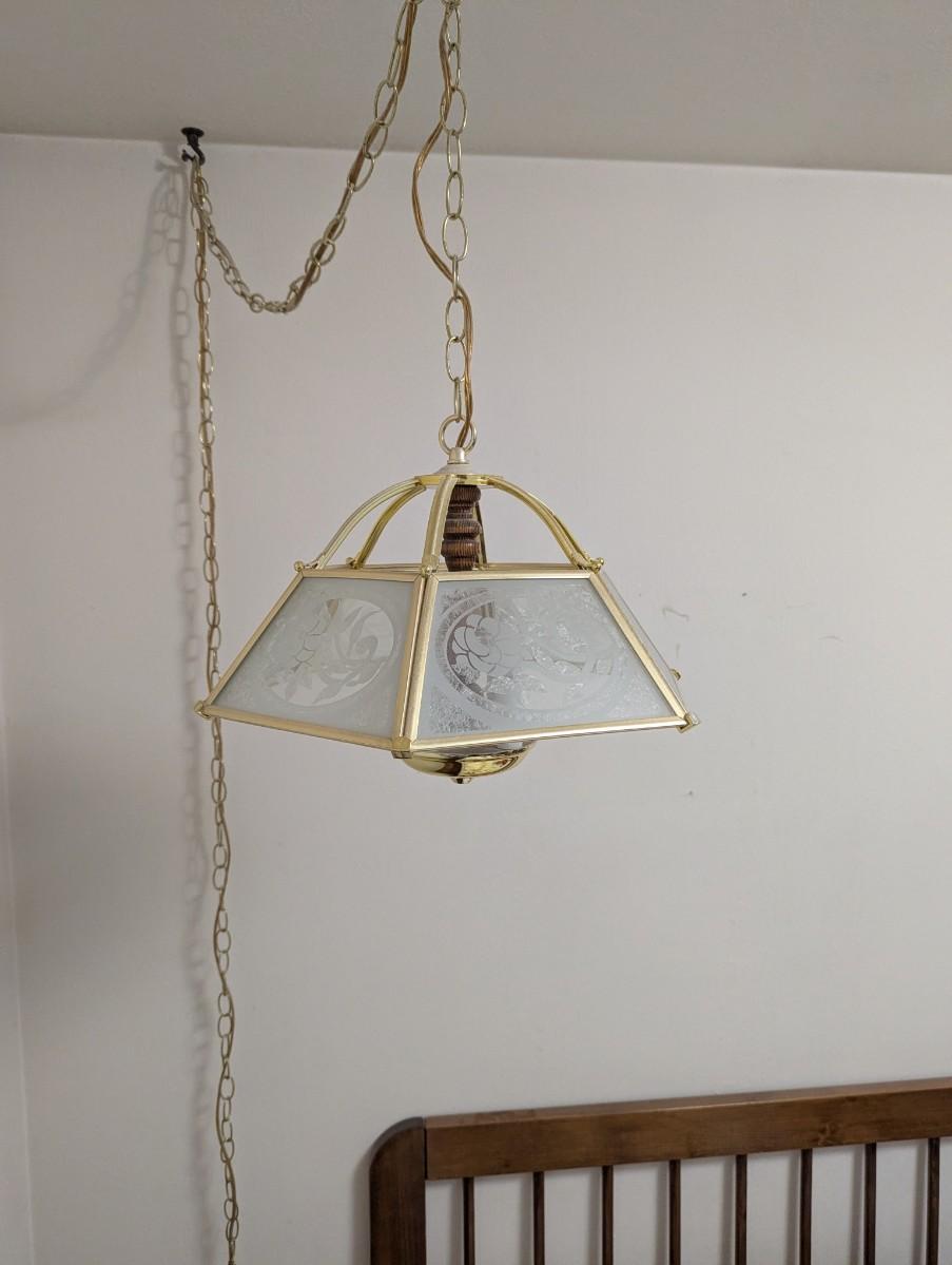 hanging lamp with a flower pattern on the glass, has a long cord,and chain.