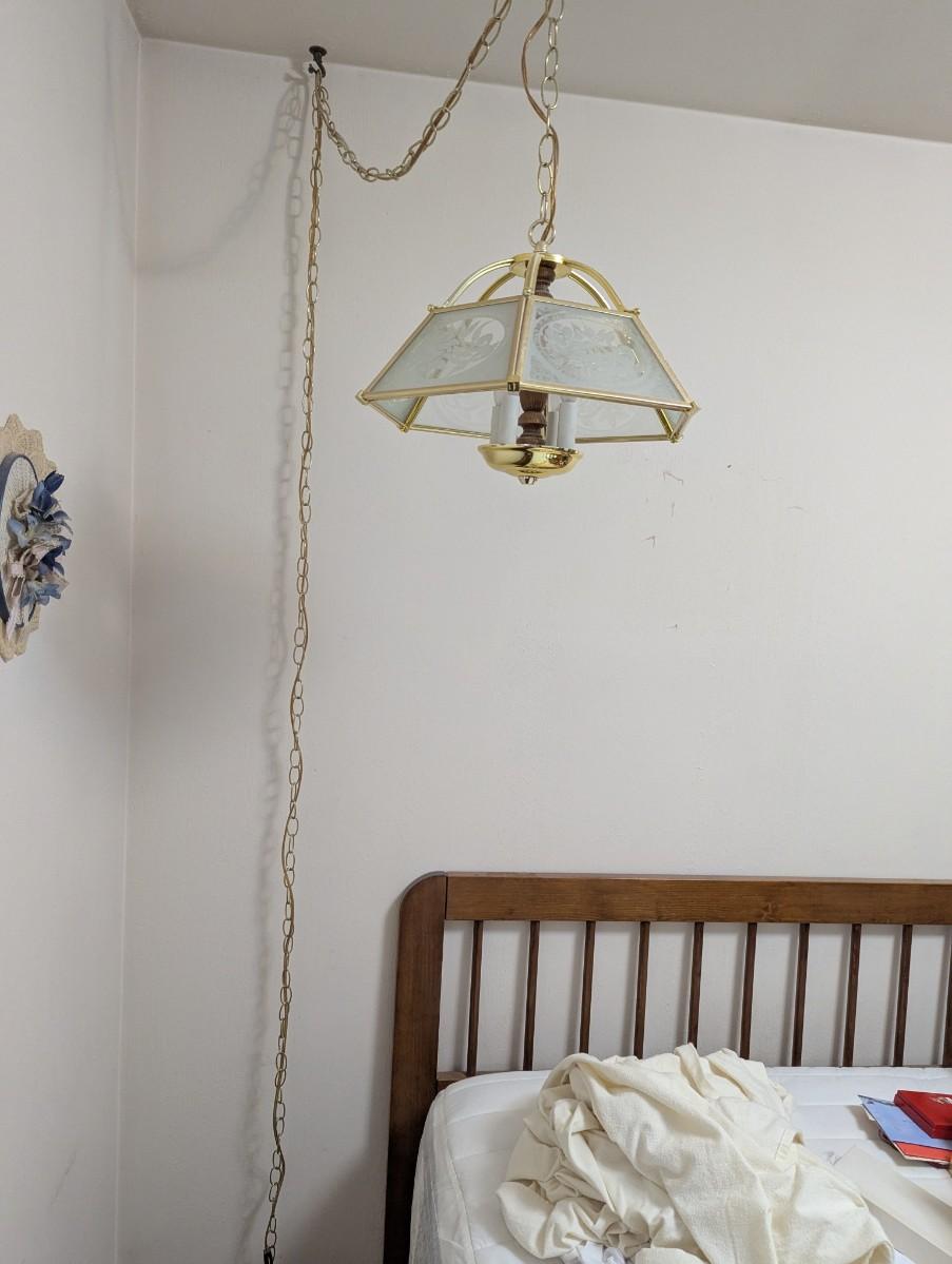 Hanging light with electric cord, and long chain.