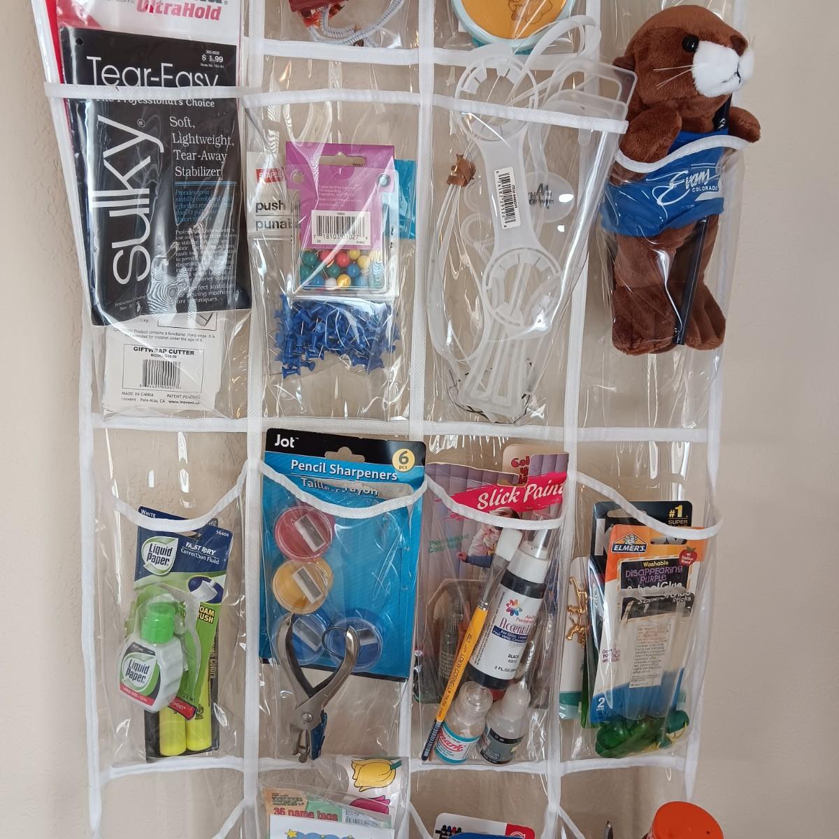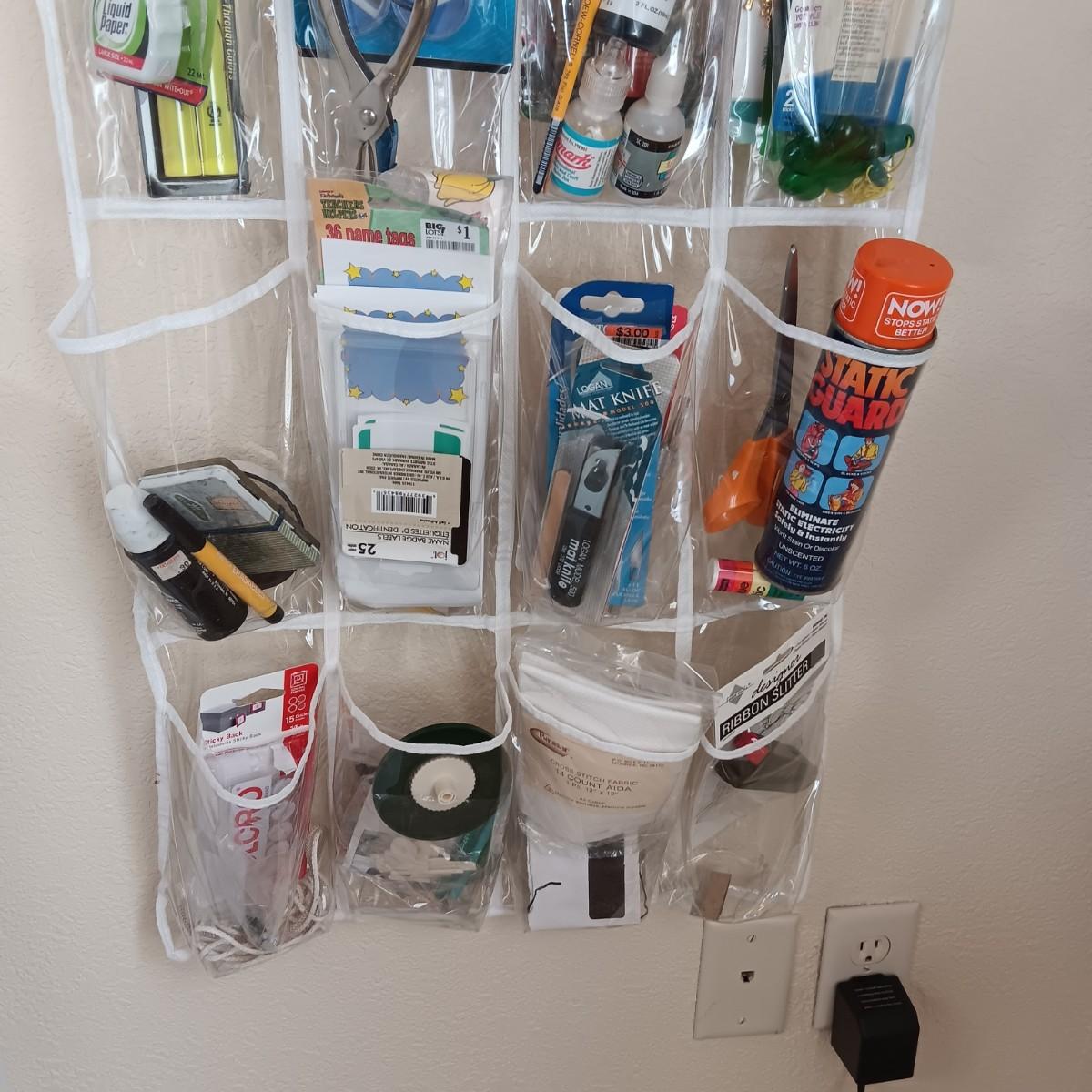HANGING ORGANIZER FULL OF CRAFT AND SEWING SUPPLIES
