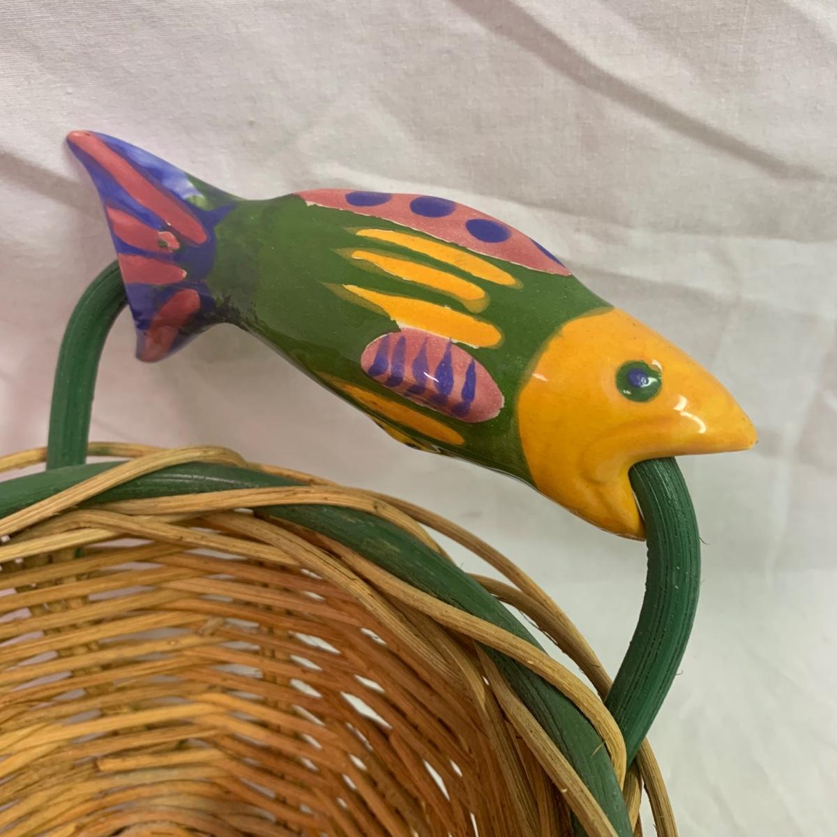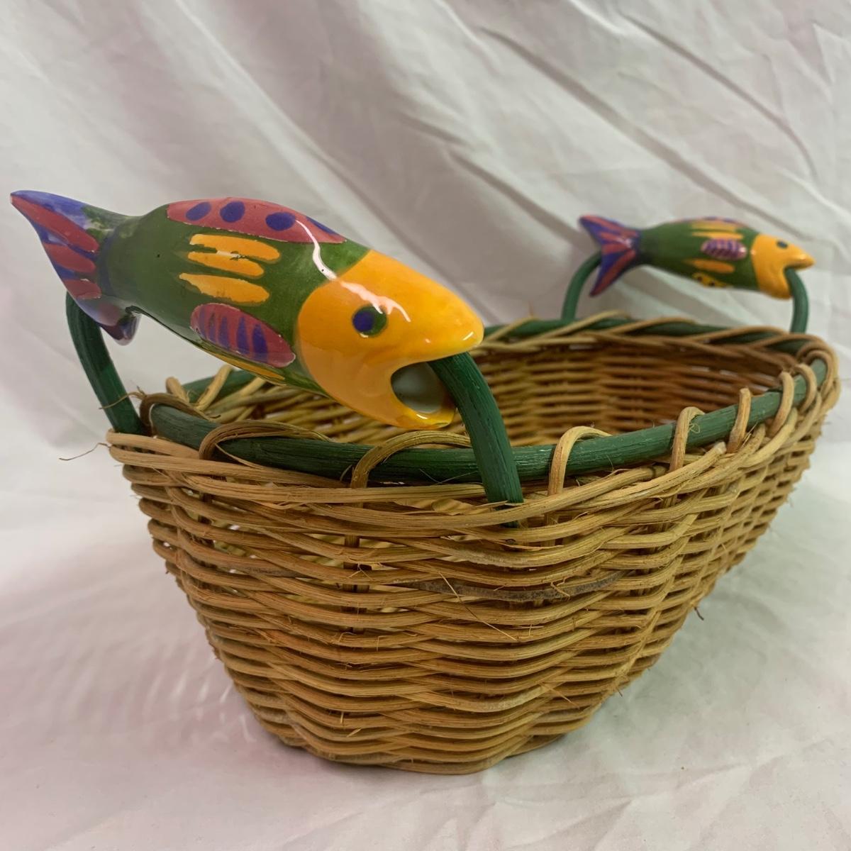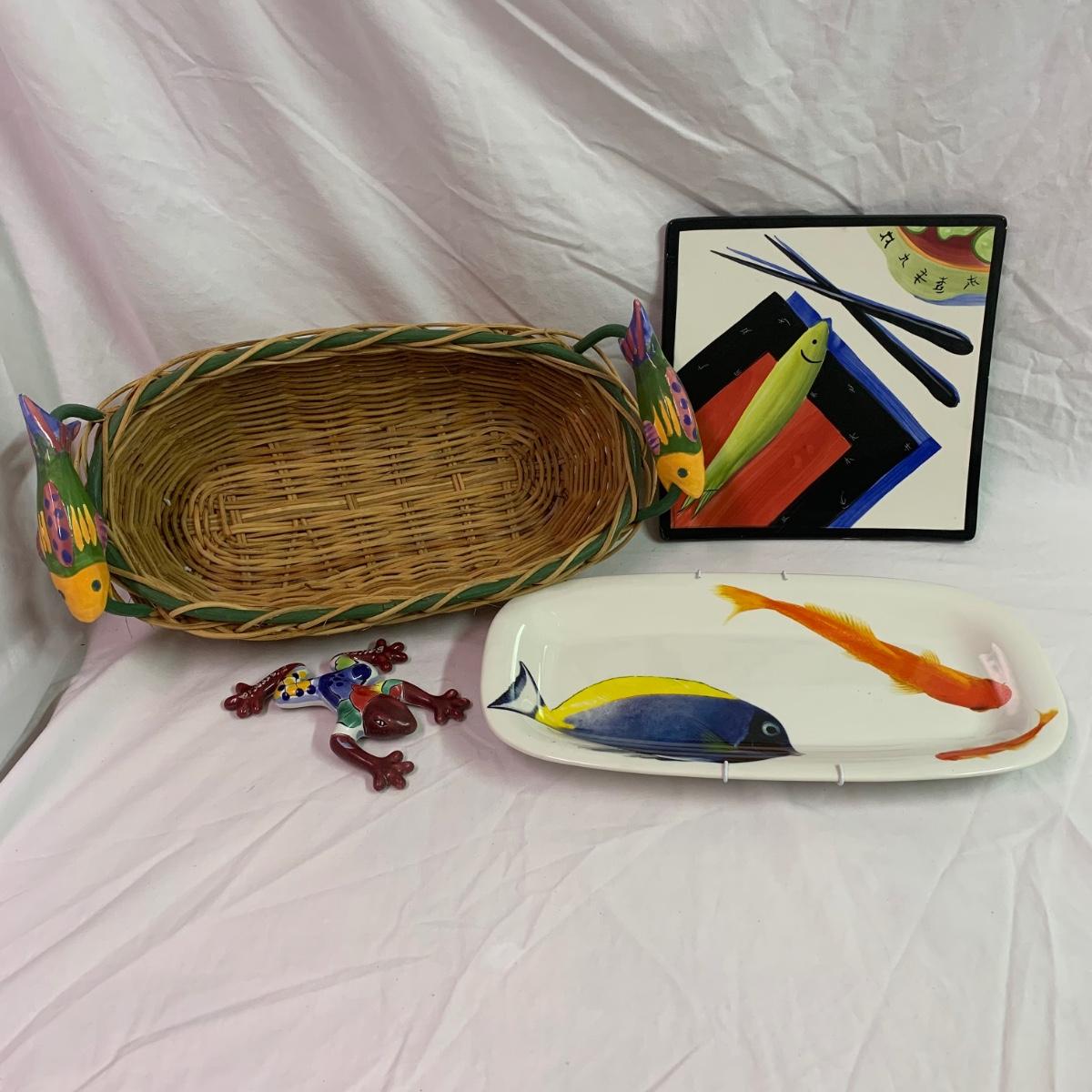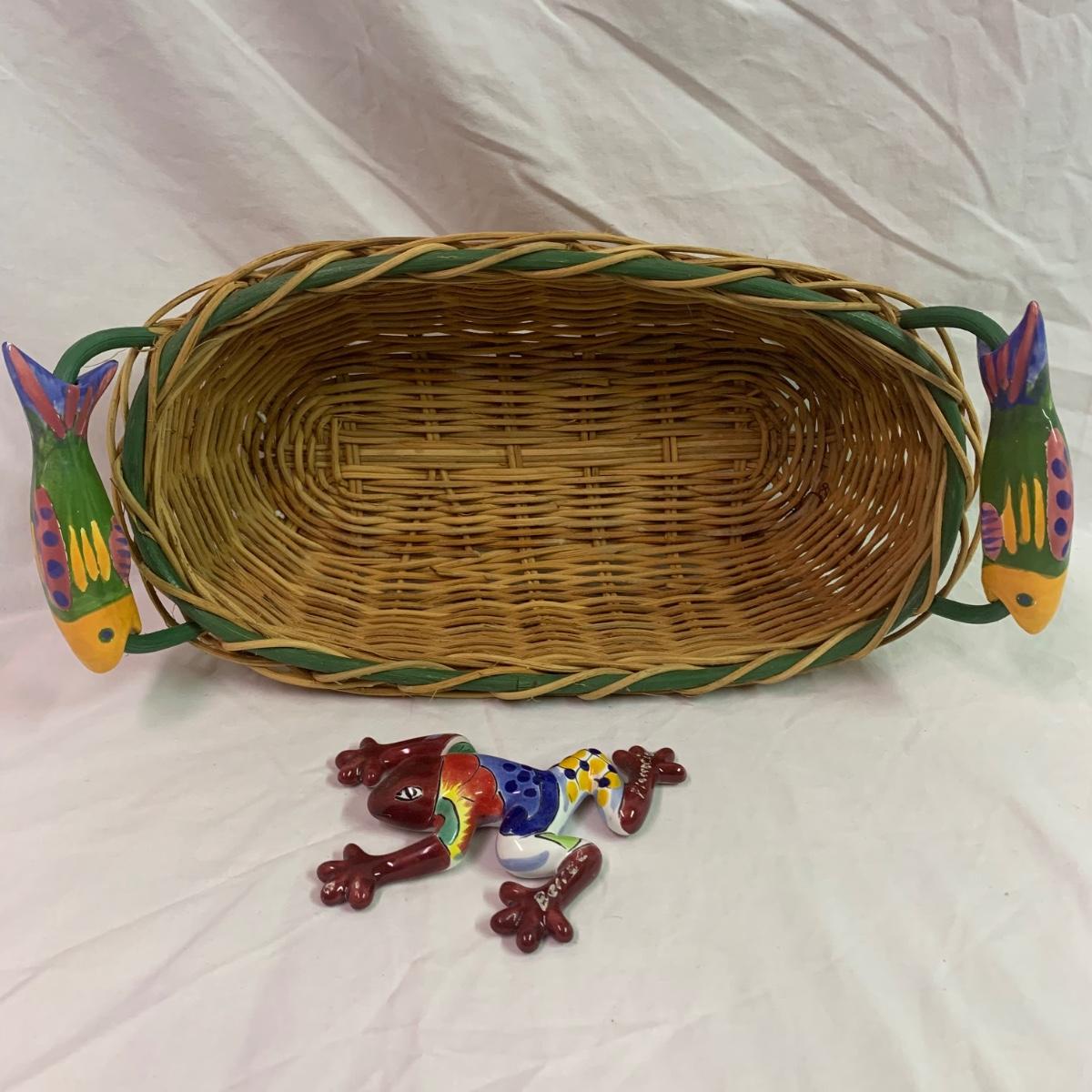 This lot includes two decorative hanging plates, one ceramic frog from Belize, and one adorable basket with painted ceramic fish handles. Fish-handled basket measures 16” x 8.5” x 7”H. Please see photos for more details. Shipping available.