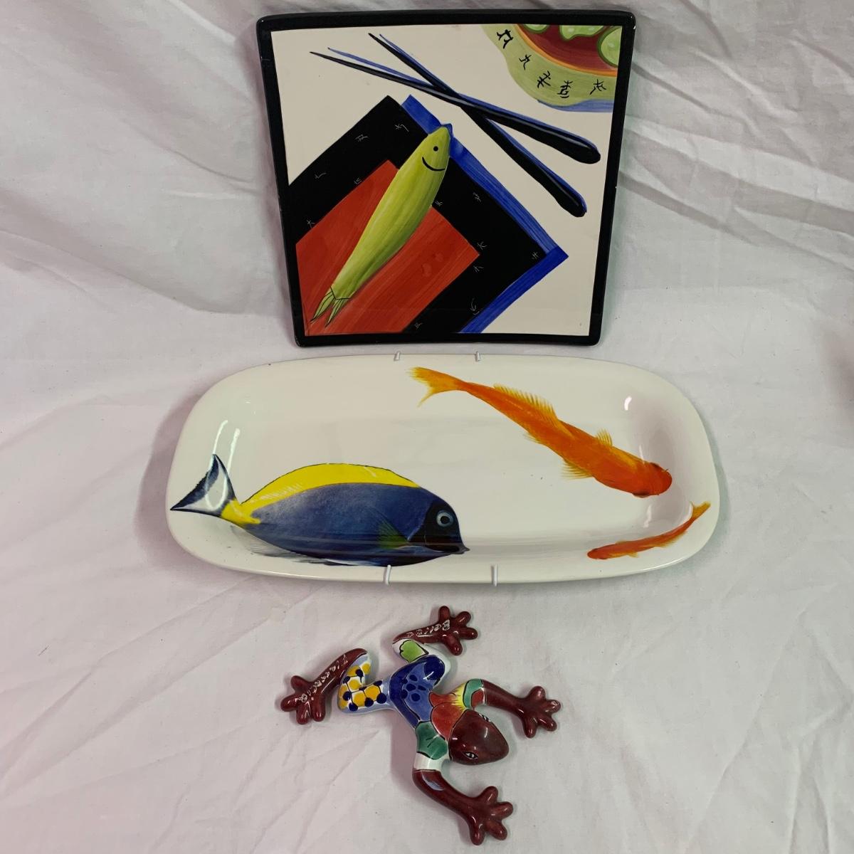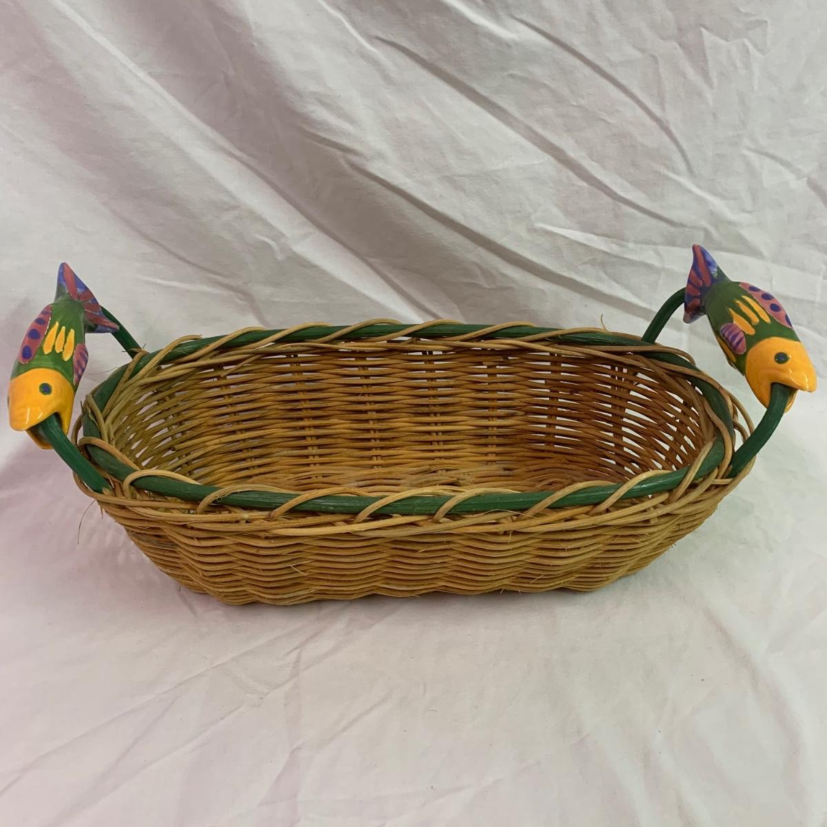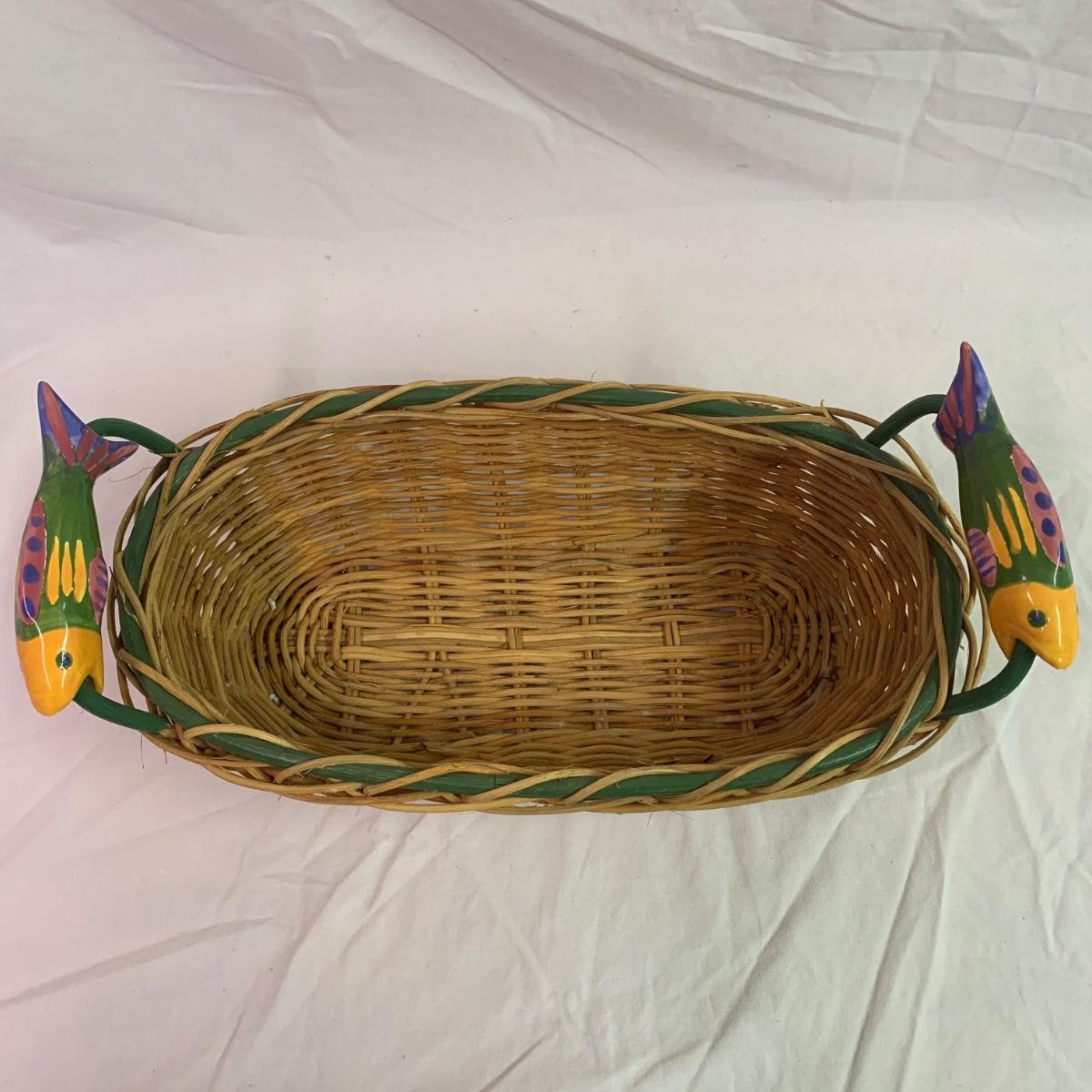 This lot includes two decorative hanging plates, one ceramic frog from Belize, and one adorable basket with painted ceramic fish handles. Fish-handled basket measures 16” x 8.5” x 7”H. Please see photos for more details. Shipping available.