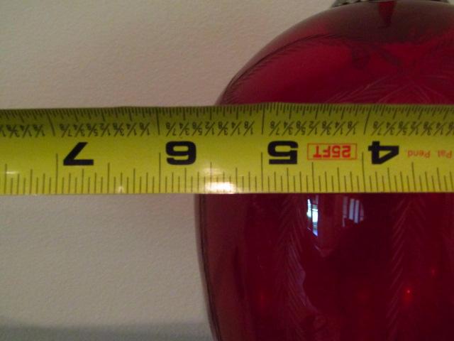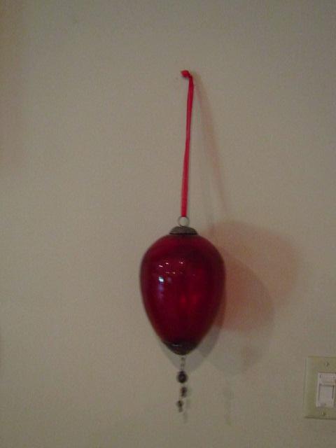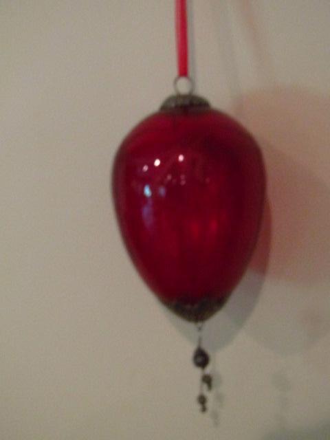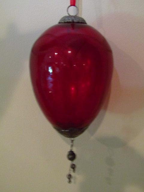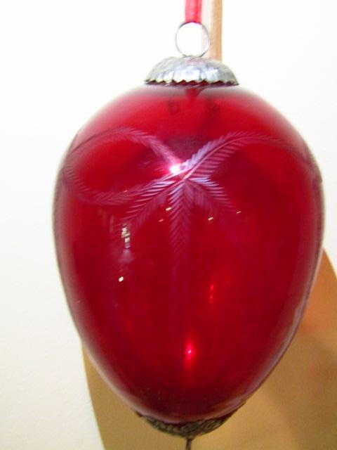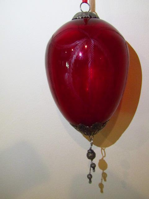 Hanging Red Glass 'Egg' Shaped Decor- Engraved with Ribbon Shapes