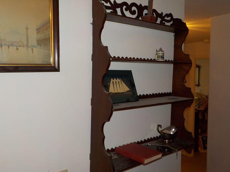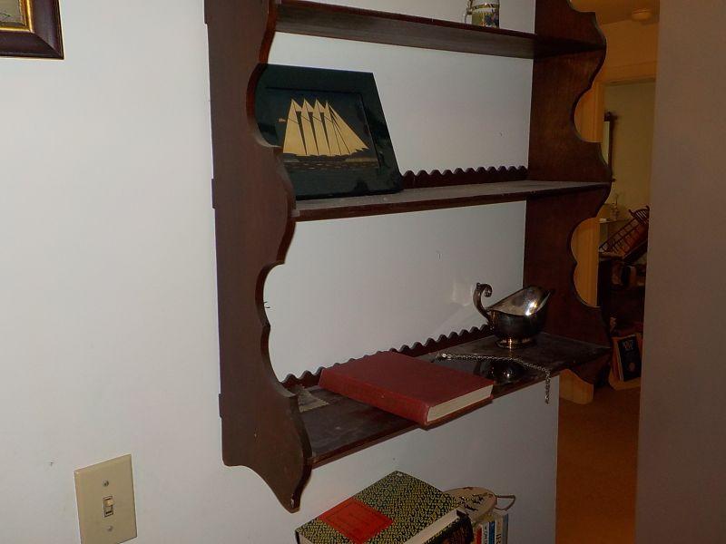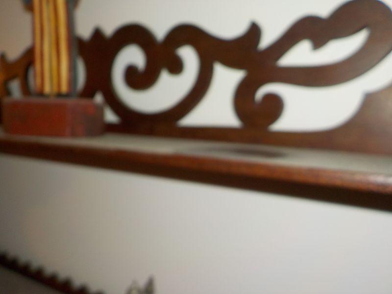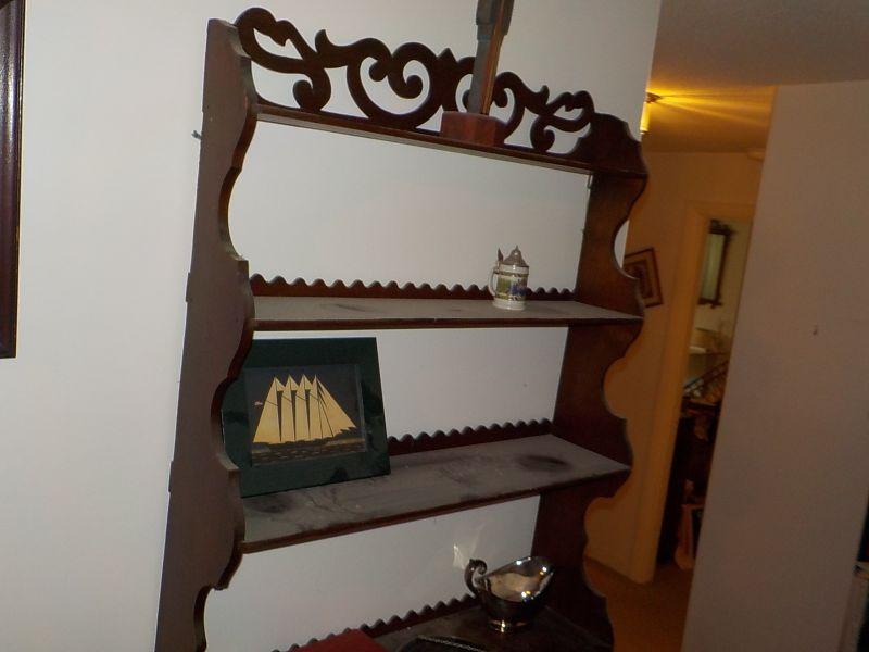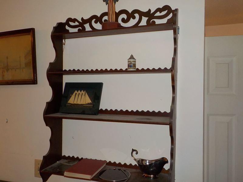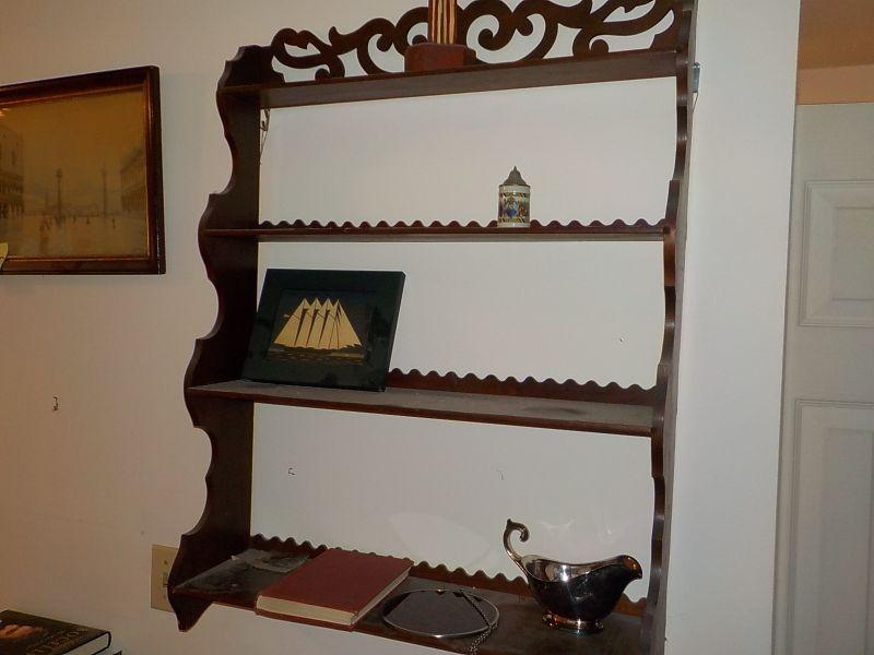 Nice wood scroll cut shelve , solid wood with 4 shelves. Size 38 in. wide x 36 in. high.