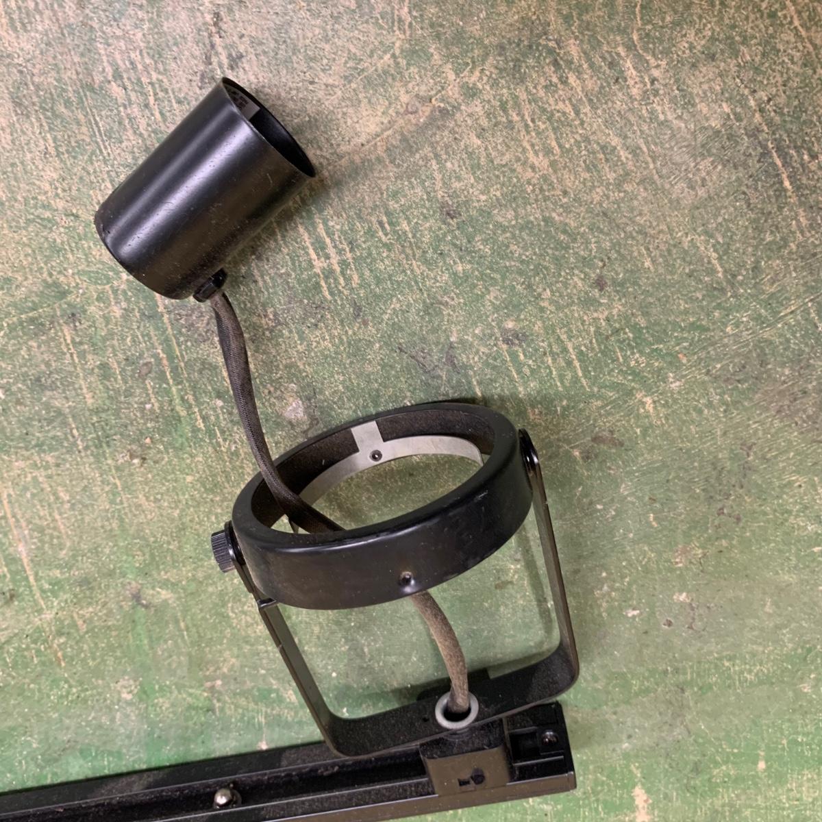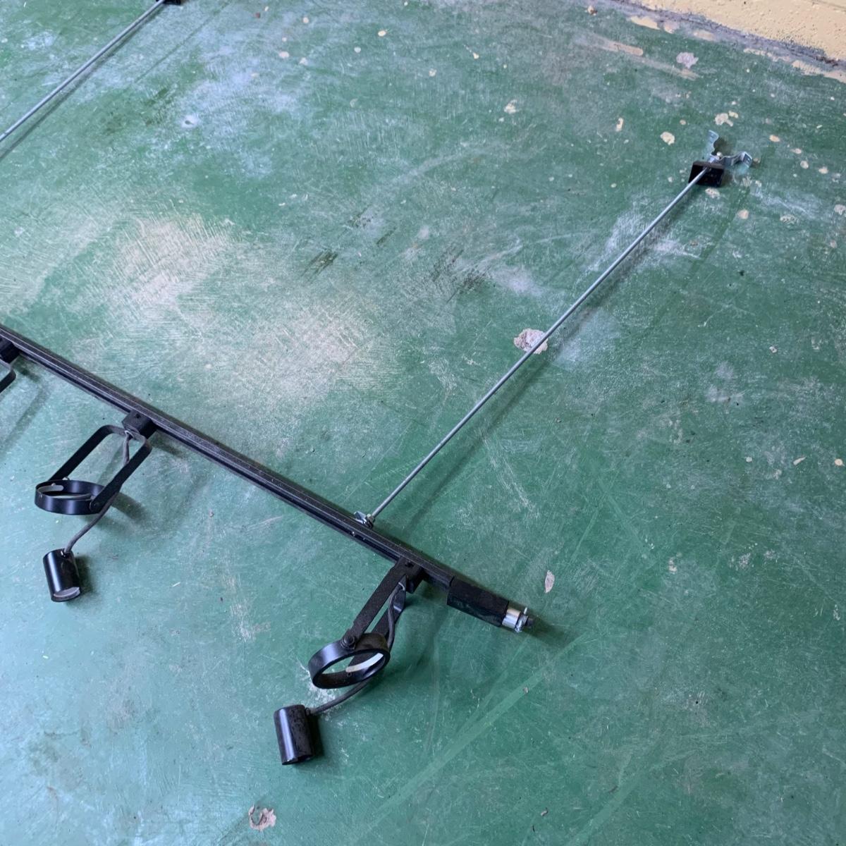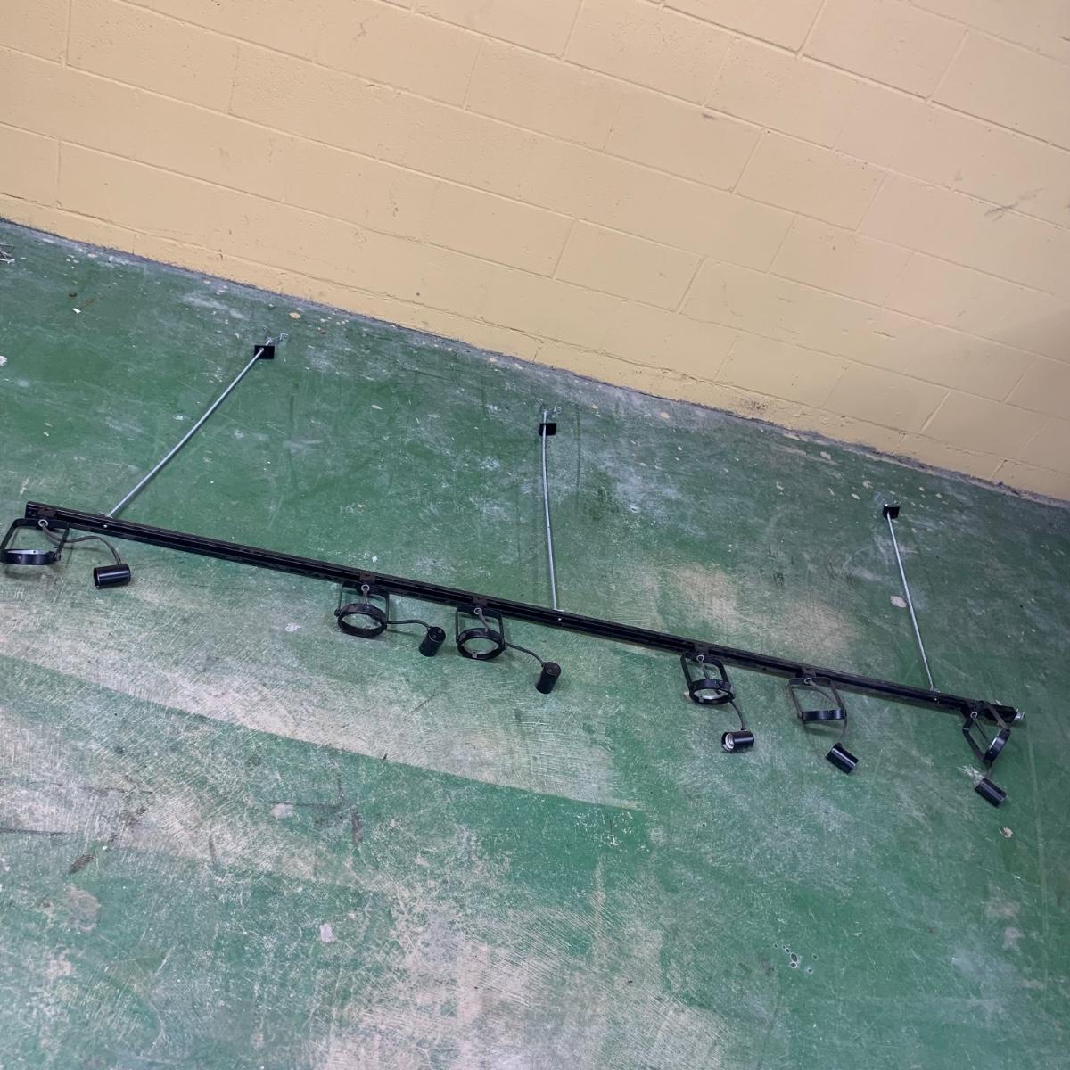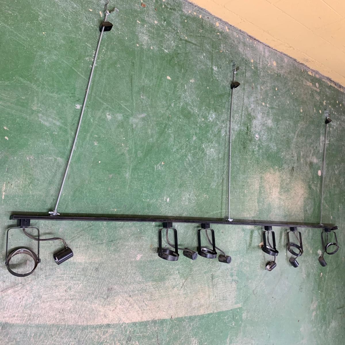 This track light fixture has three solid metal poles that attach to the ceiling for the fixture to hang. It has the capacity for six lights. It has pivoting swivel light heads. The fixture is black metal. It is about 96” (8ft) long. The hanging poles measure approximately 37” long. The fixture is a bit dusty and it would benefit from a good cleaning. We are unable to test this item, but previous owner confirmed that it functioned when it last was in use. Local pickup only.