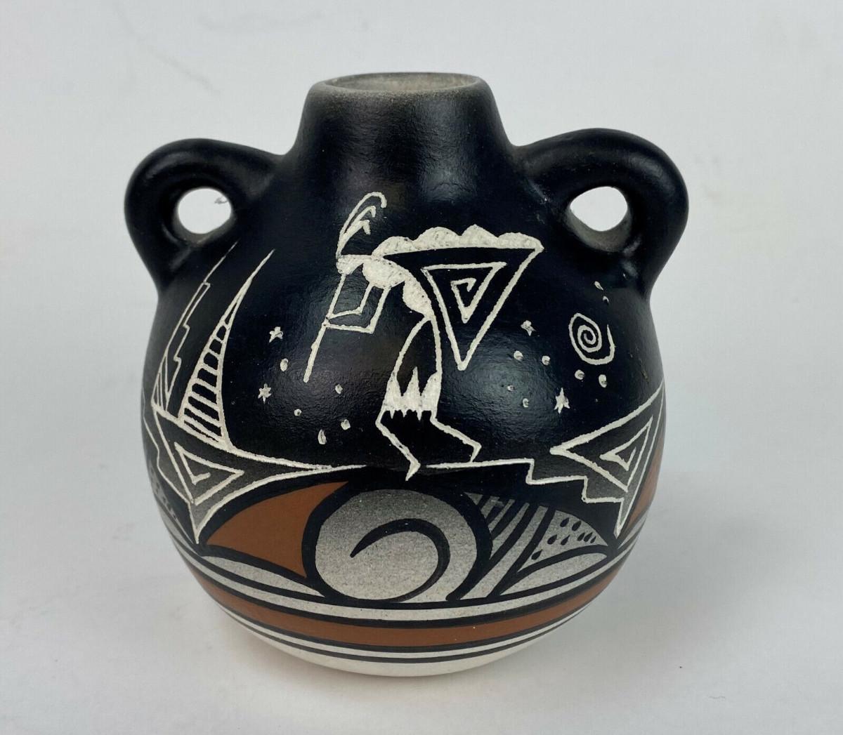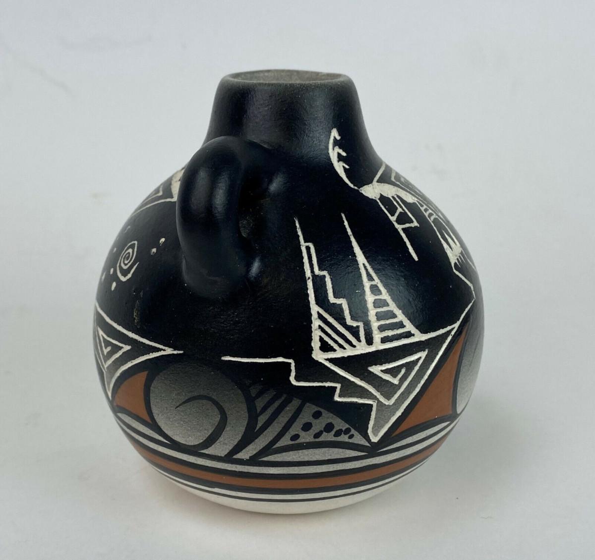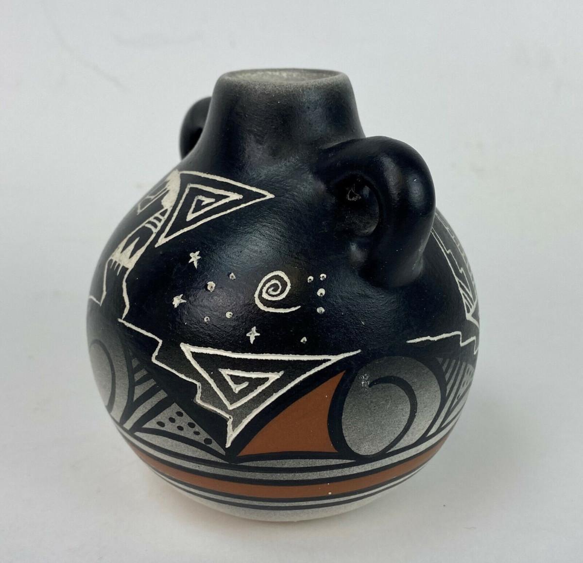 Excellent condition on this interesting piece by Navajo artist Hanna Jay Kinlicheni..this small 4"h x 3.75"w water jug features a night scene...sand cast..hand carved...signed by this Santa Clara artist.