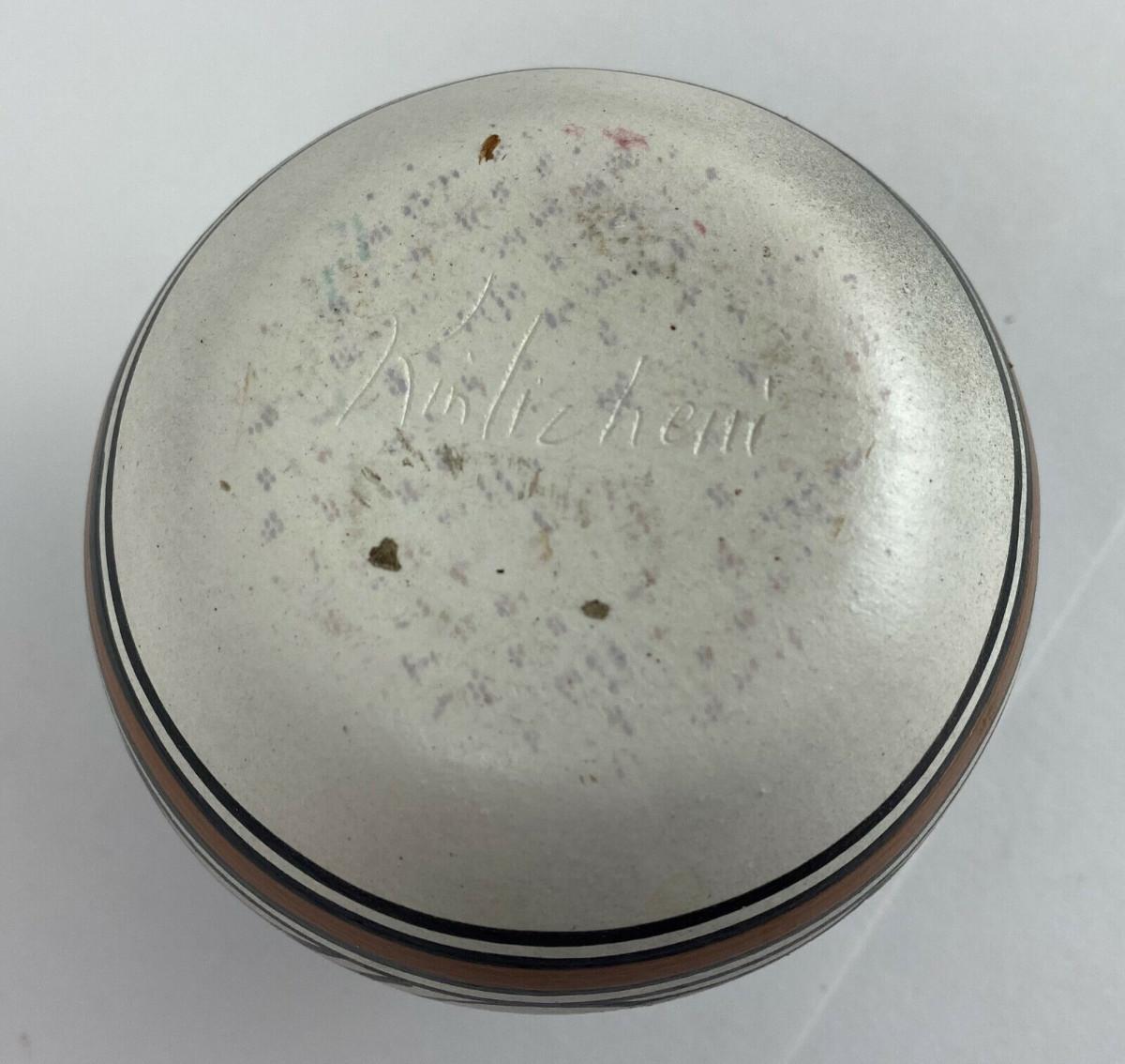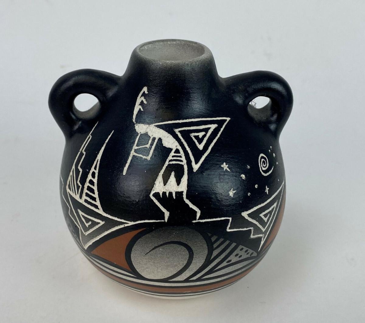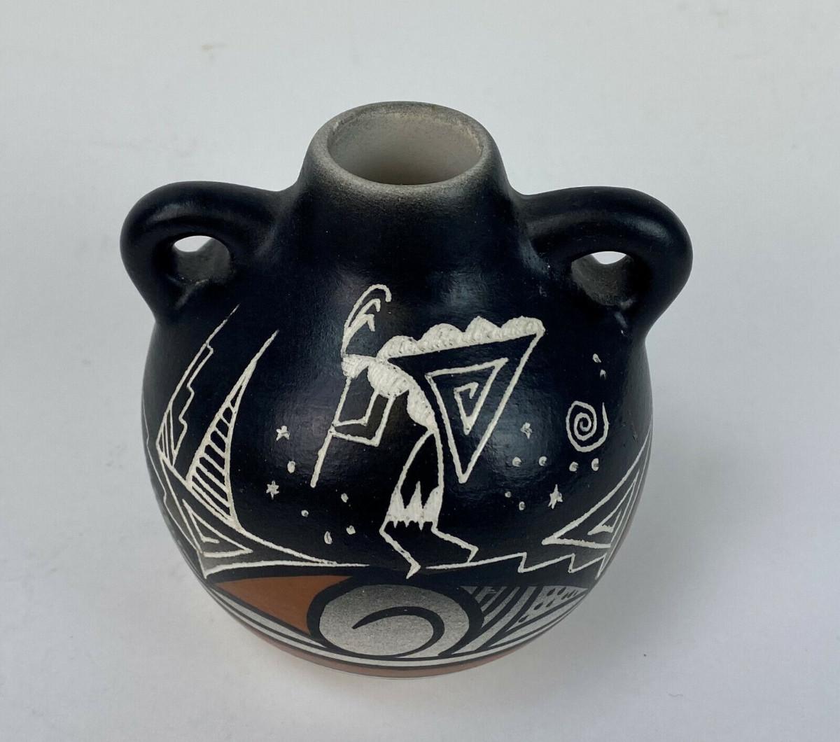 Excellent condition on this interesting piece by Navajo artist Hanna Jay Kinlicheni..this small 4"h x 3.75"w water jug features a night scene...sand cast..hand carved...signed by this Santa Clara artist.