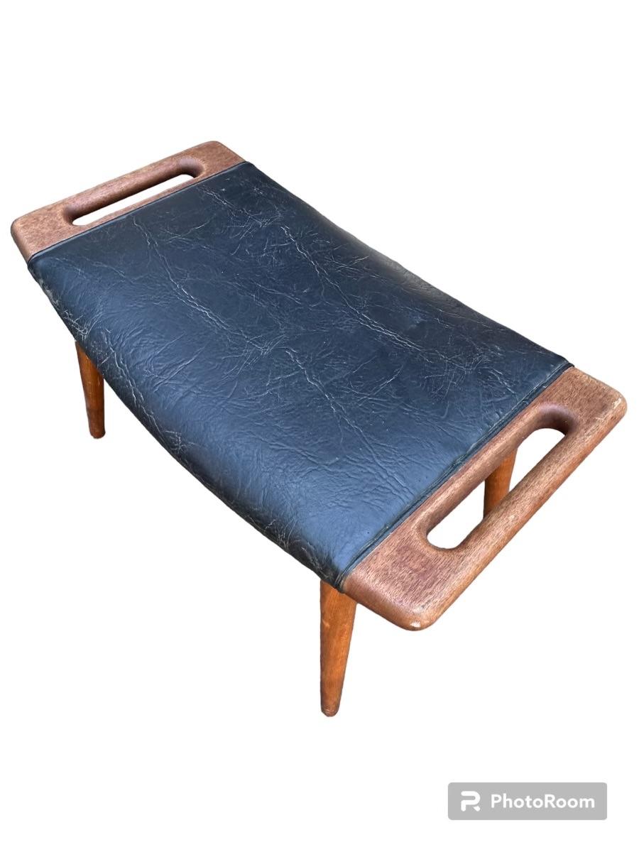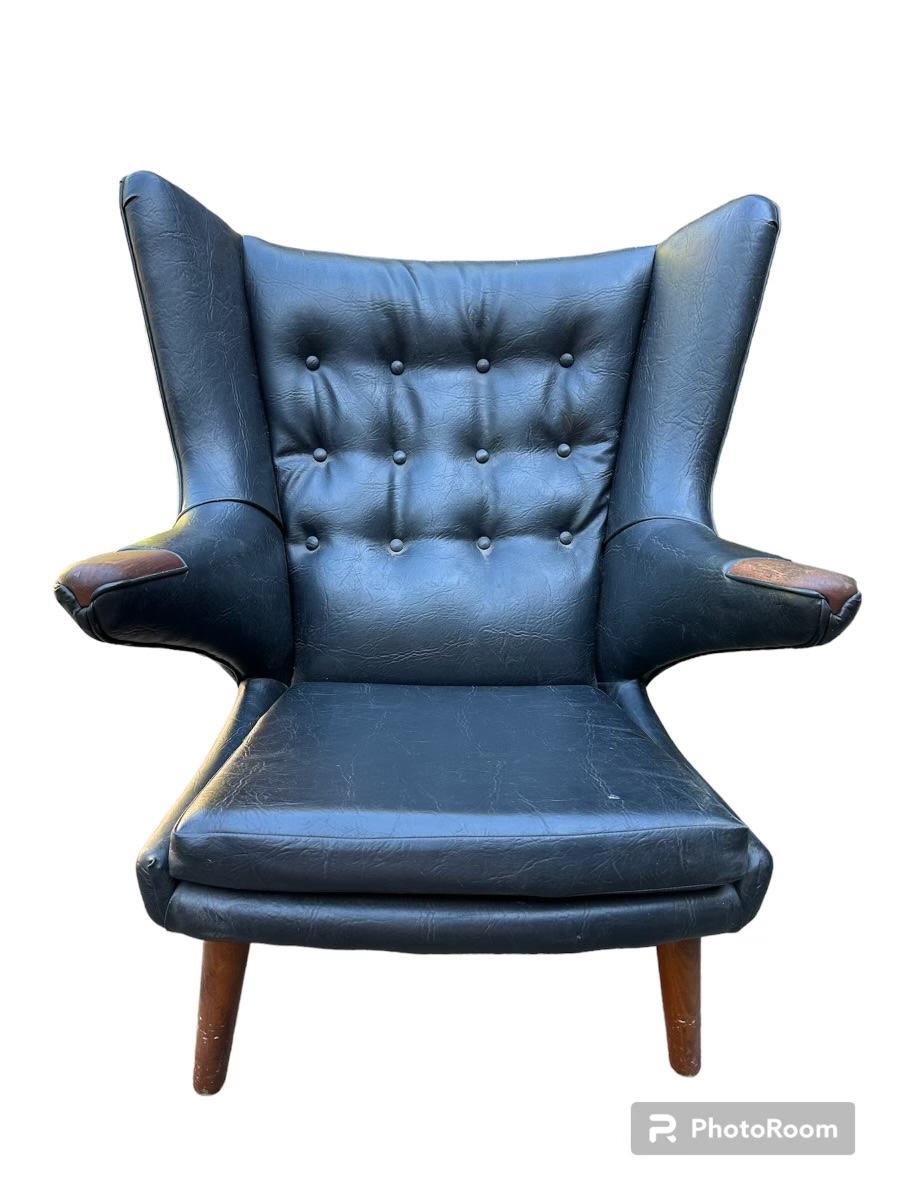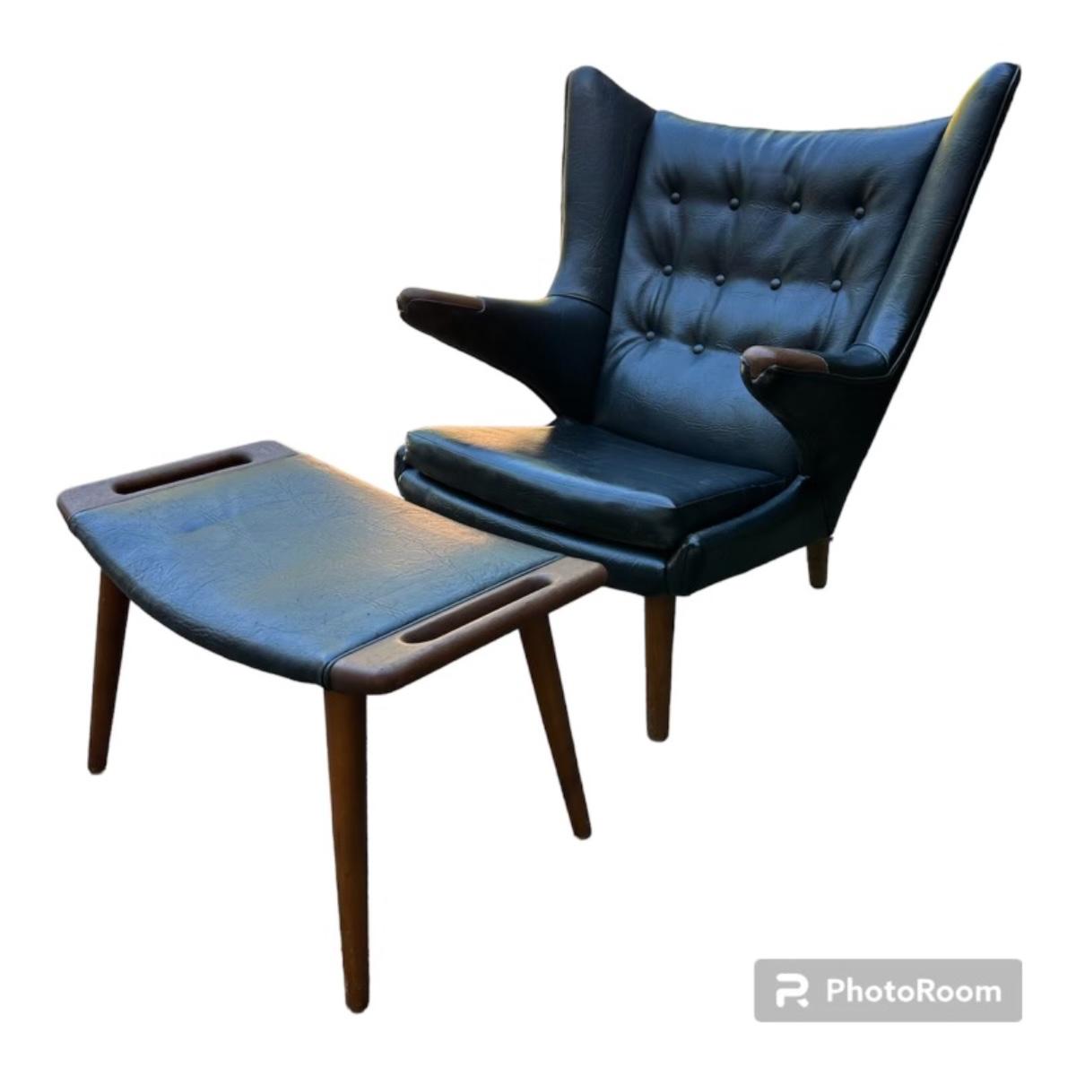 Classic Beauty Mid Century danish chair designed by Hans J. Wegner for A.P. Stolen Model AP19 and ottoman AP29 circa 1951 Denmark. Has some Cat claw pricks on the head rest of the chair.