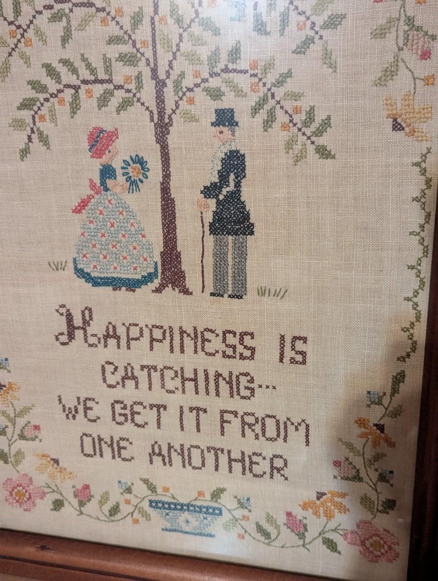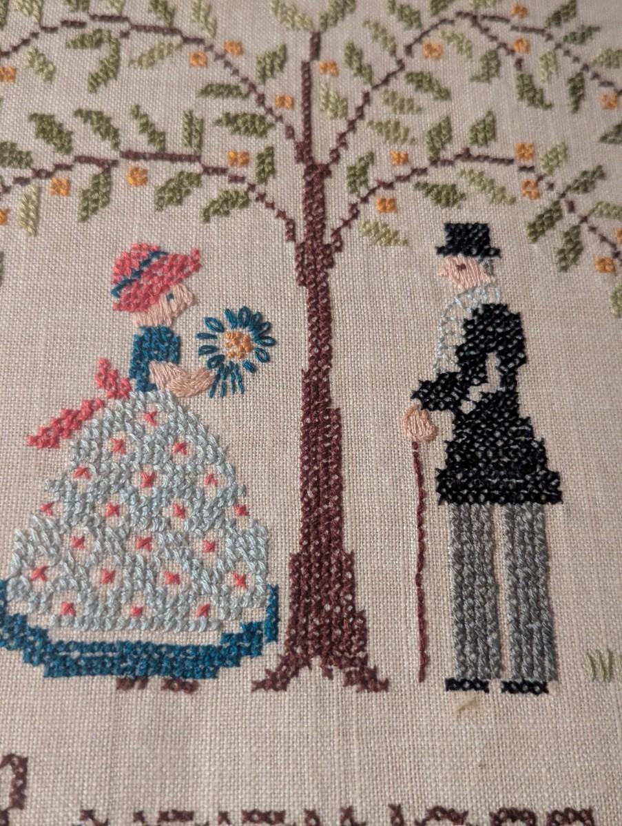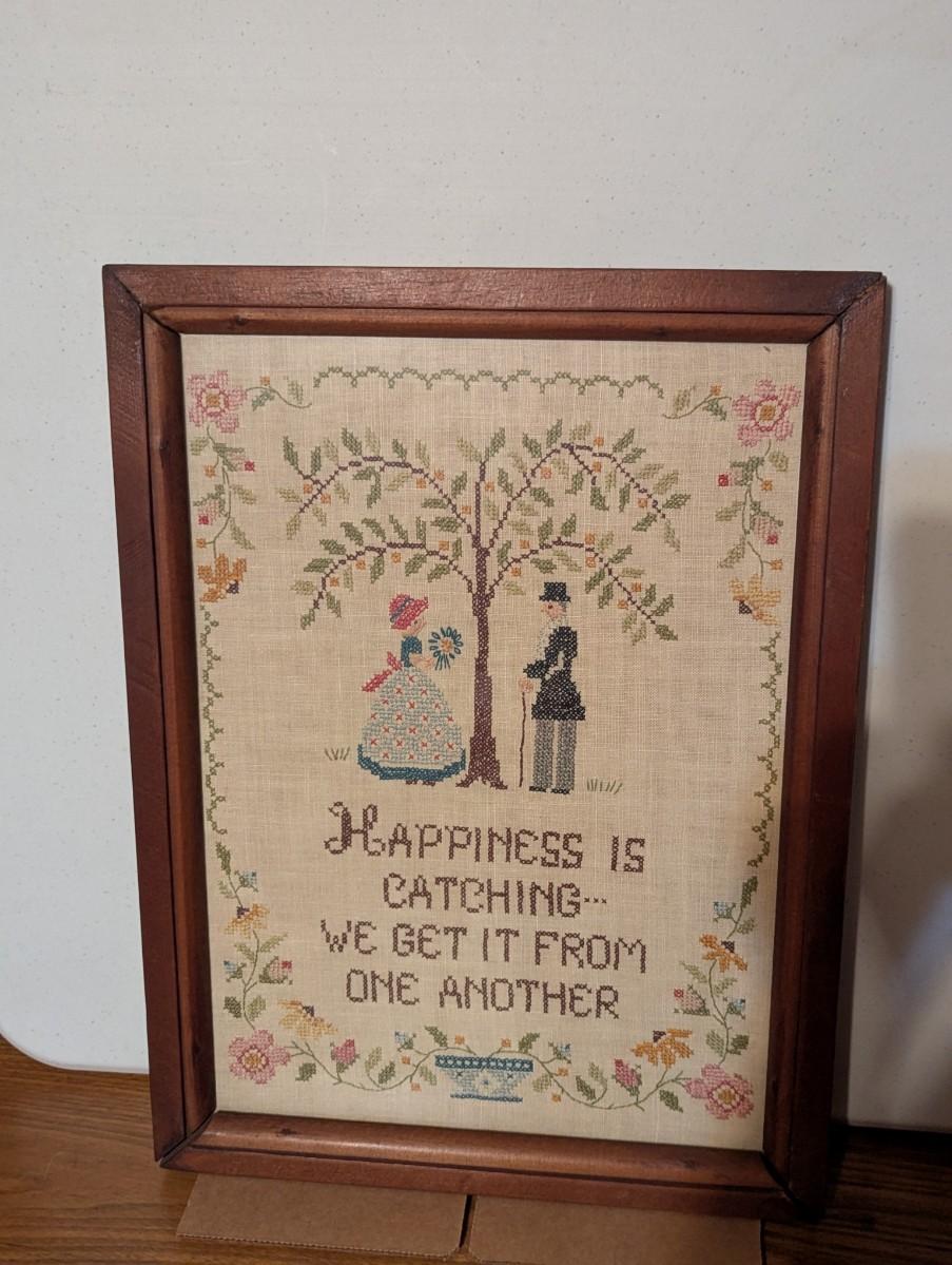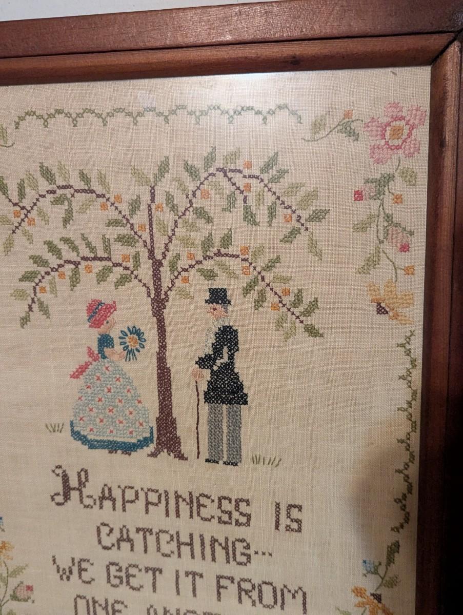 Happiness Is Catching Courting Couple Vintage Framed Cross Stitch 14 3/4" x 20"
