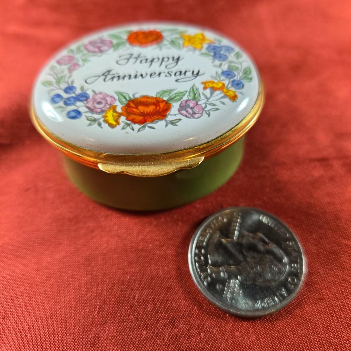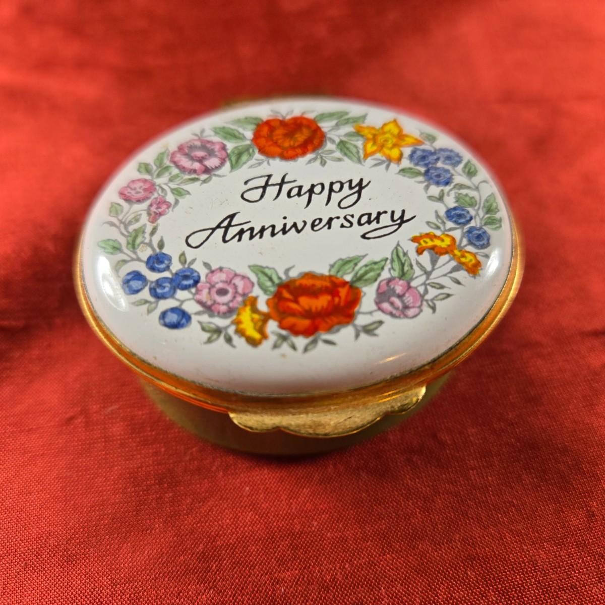 This auction lot is for a Happy Anniversary Limoges Box - England. This is a Limoges Box by Crummles & Company made in England. Such a nice anniversary gift as a vessel for a new ring? It is about a 2-inch oval. So Sweet!