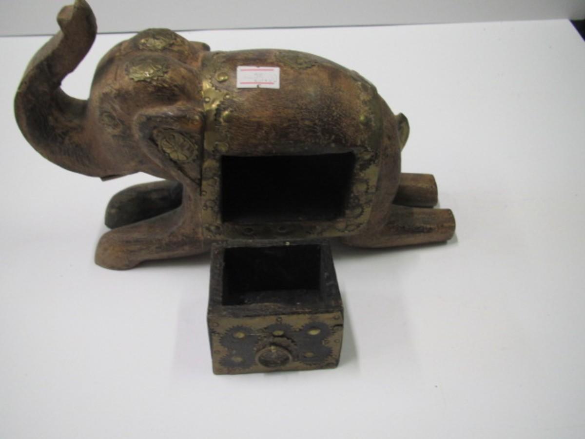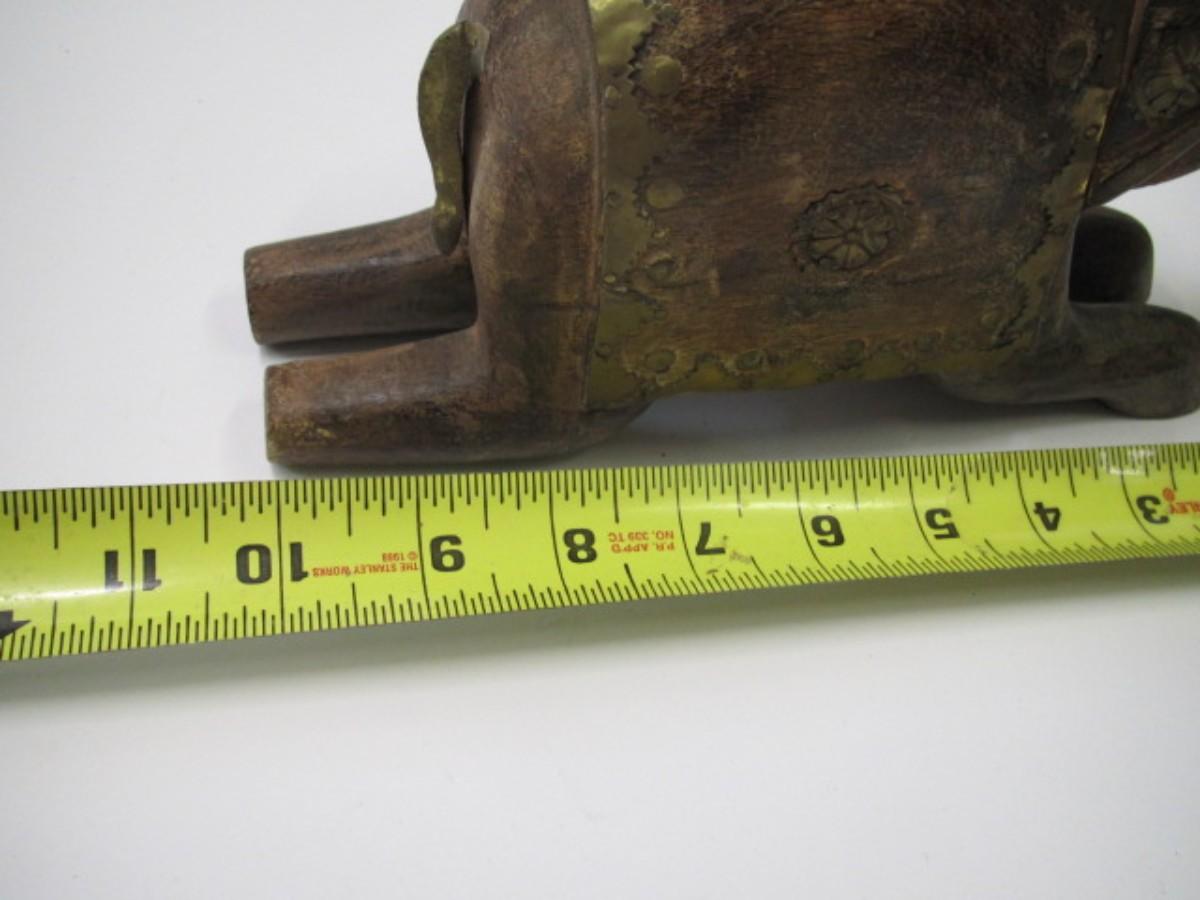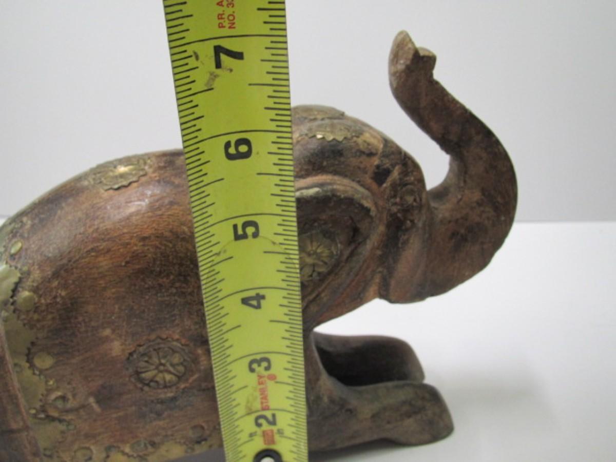 Happy Elephant Figurine Wood/Brass Trim With Hidden Compartment Approx 7" Tall