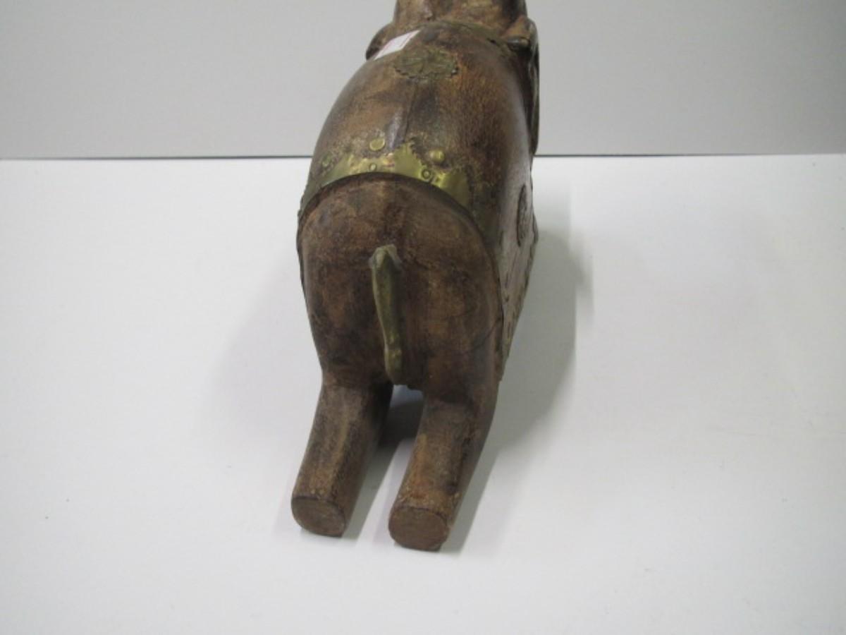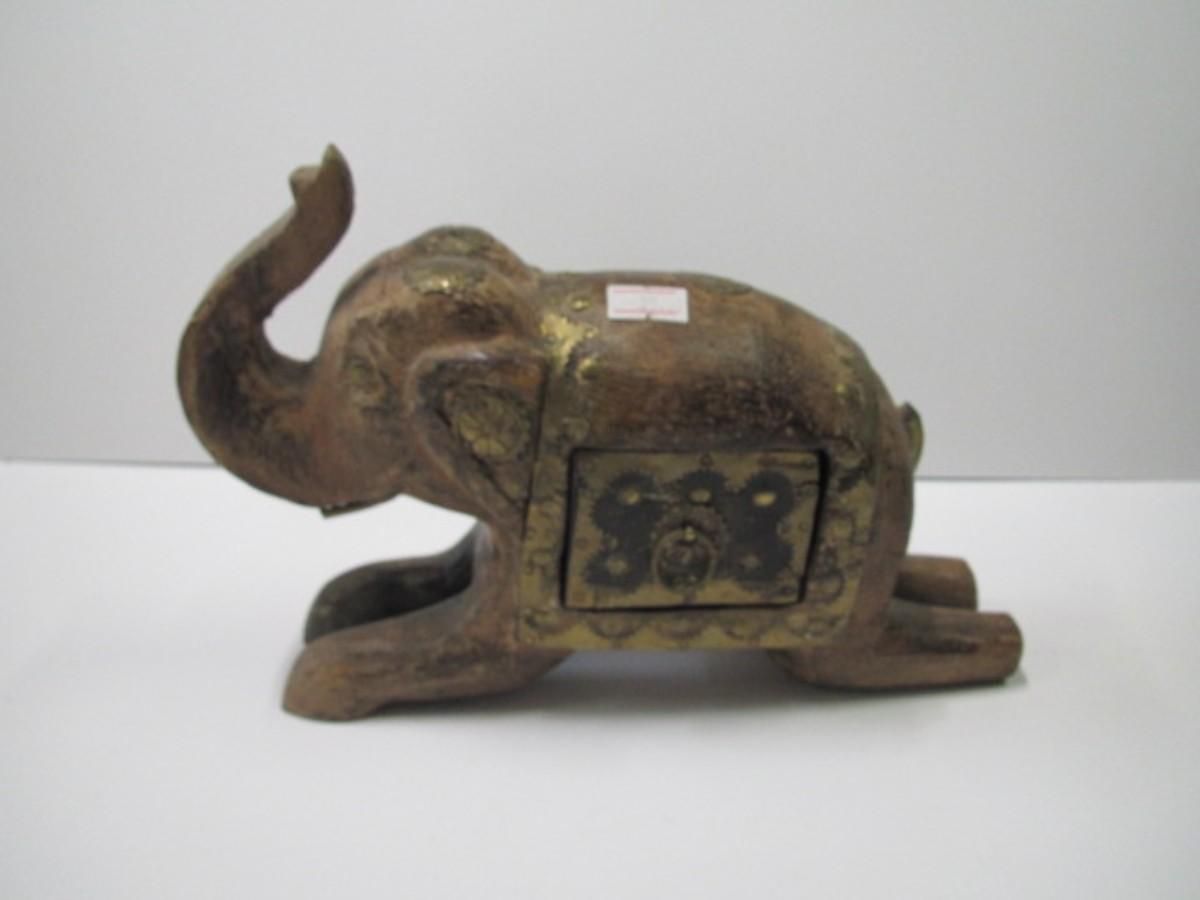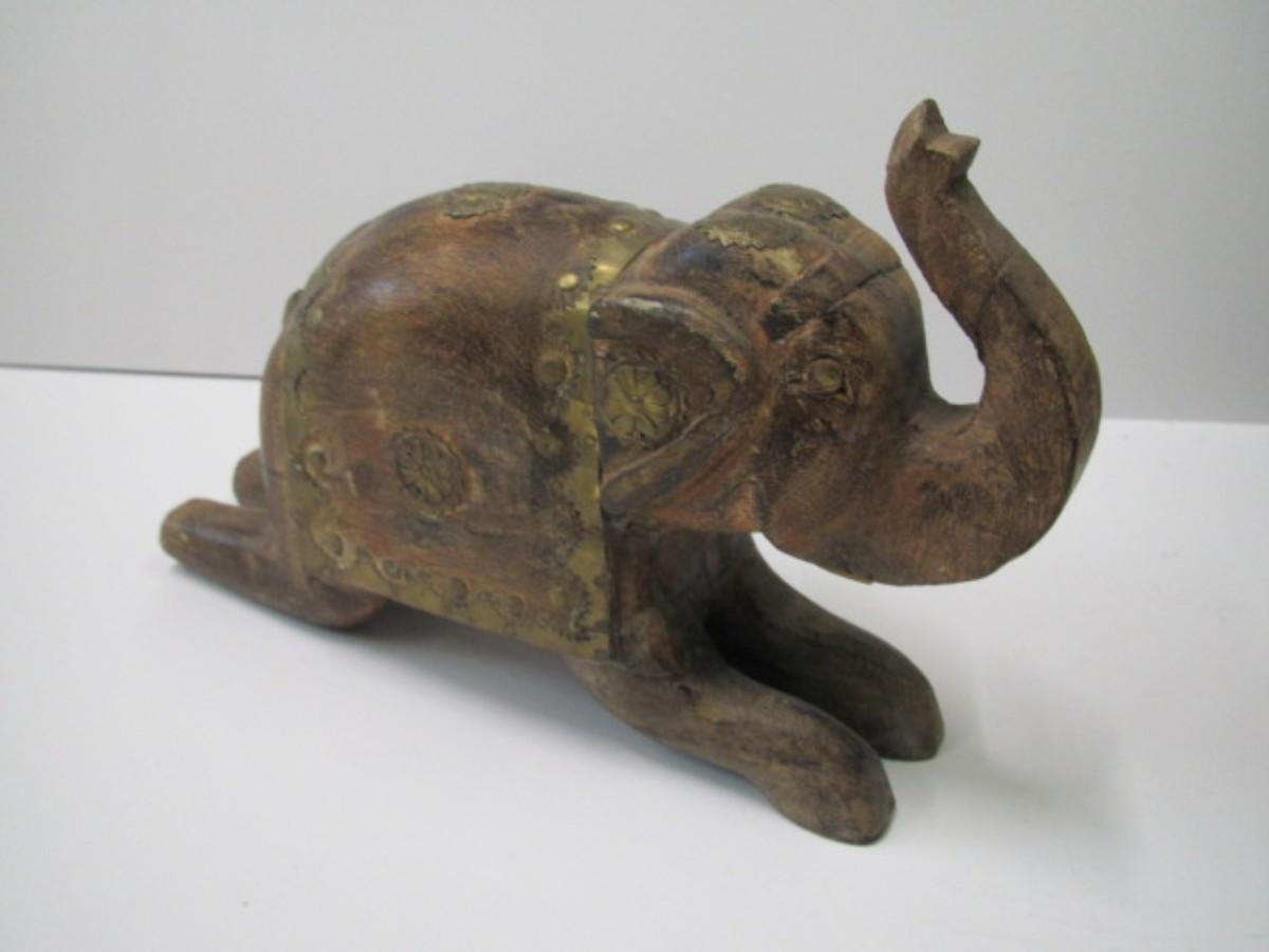 Happy Elephant Figurine Wood/Brass Trim With Hidden Compartment Approx 7" Tall