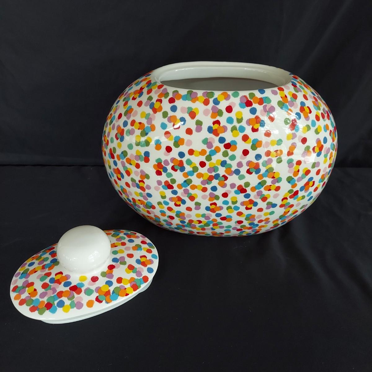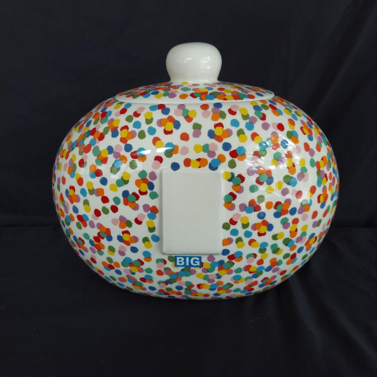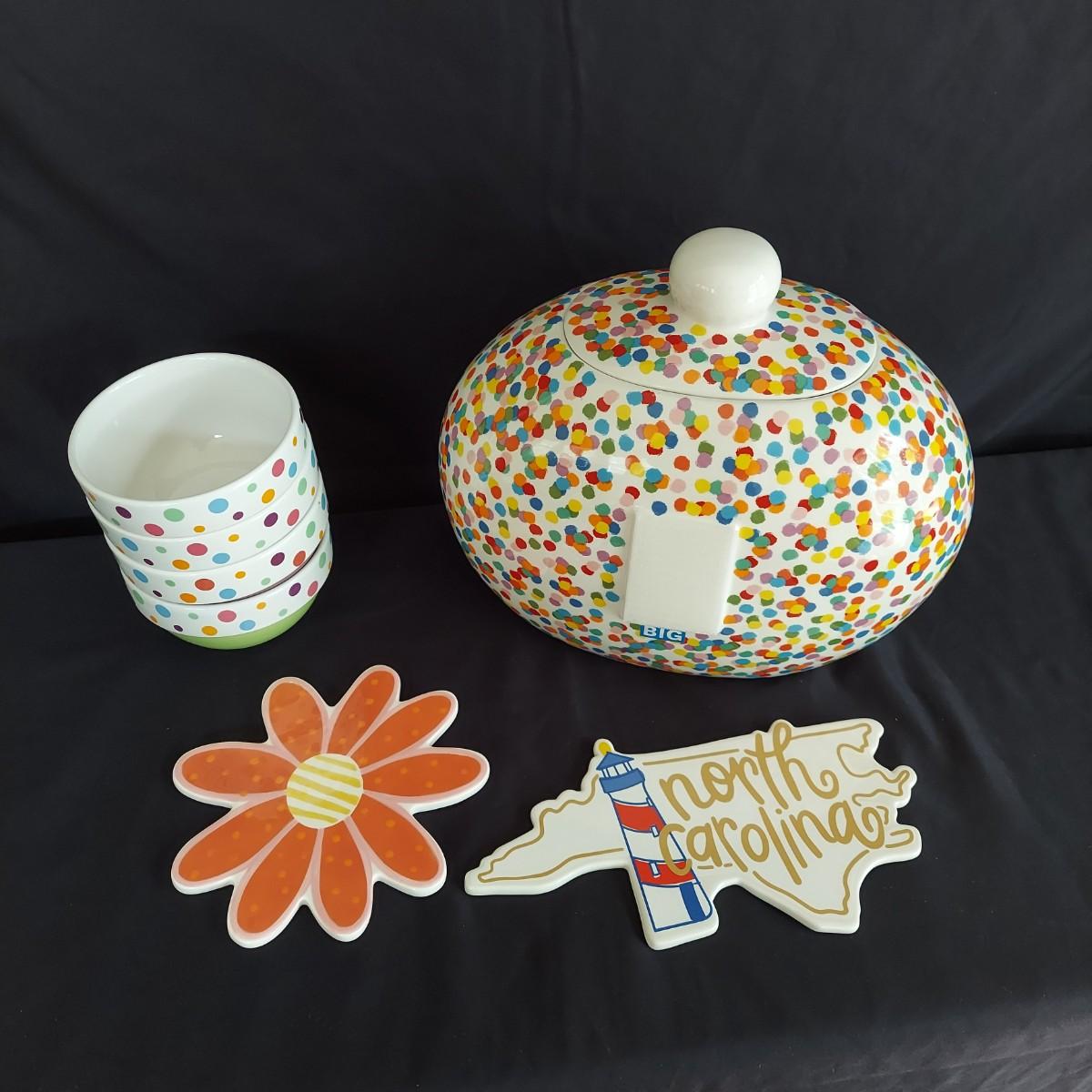 The Happy Everything Toss Big Cookie Jar is a fun piece. Attach any of the Big Attachments to the front with Velcro to match the season or what's inside. This lot includes a big cookie jar by Happy Everything in Toss print with two interchangeable ceramic decorative attachments from the Cotton Colors Collection. Plus, four polka dot bowls by Tag. The cookie jar is approximately 12" x 7" x 10.5"H. Shipping available