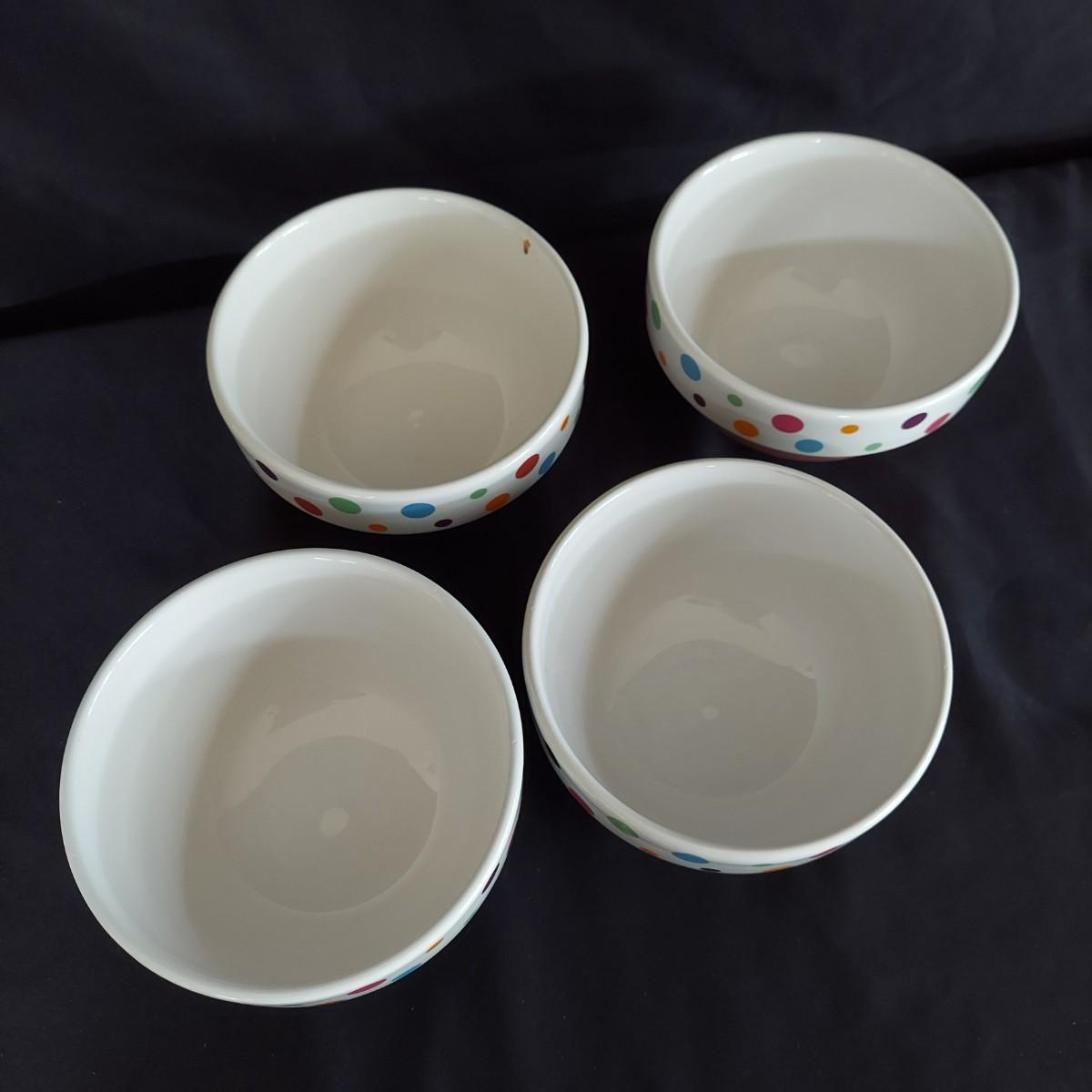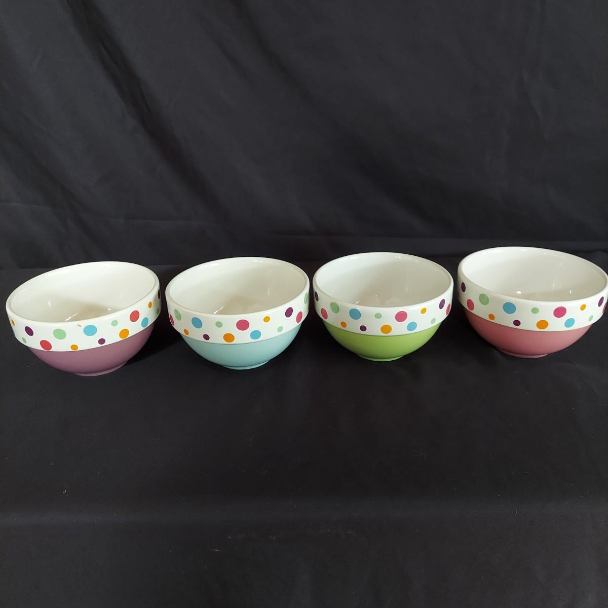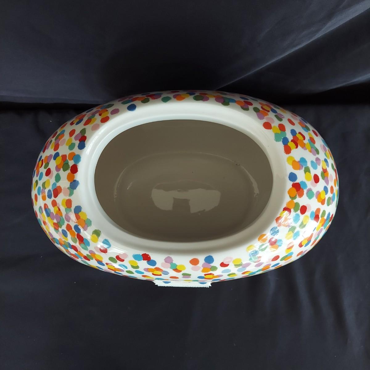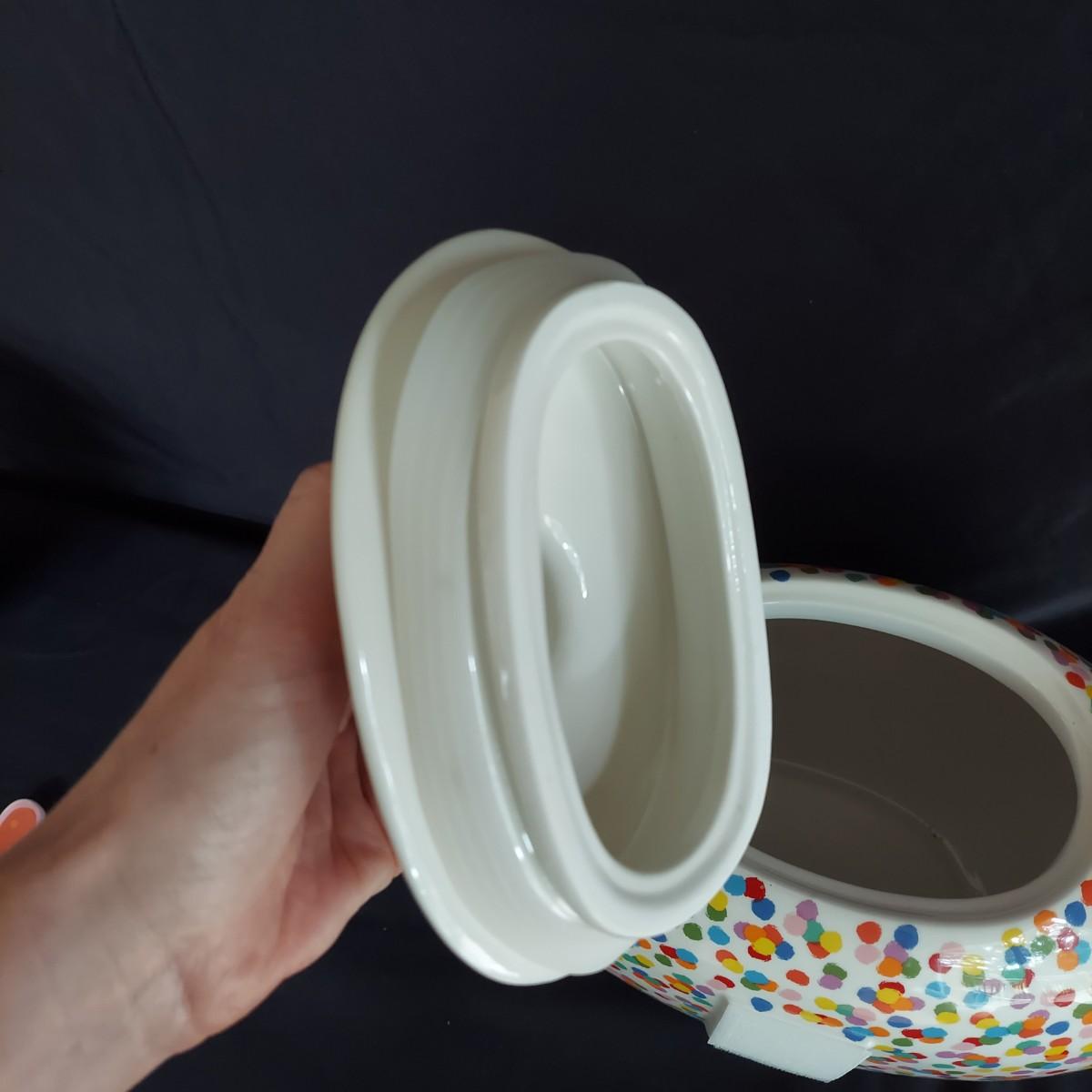 The Happy Everything Toss Big Cookie Jar is a fun piece. Attach any of the Big Attachments to the front with Velcro to match the season or what's inside. This lot includes a big cookie jar by Happy Everything in Toss print with two interchangeable ceramic decorative attachments from the Cotton Colors Collection. Plus, four polka dot bowls by Tag. The cookie jar is approximately 12" x 7" x 10.5"H. Shipping available