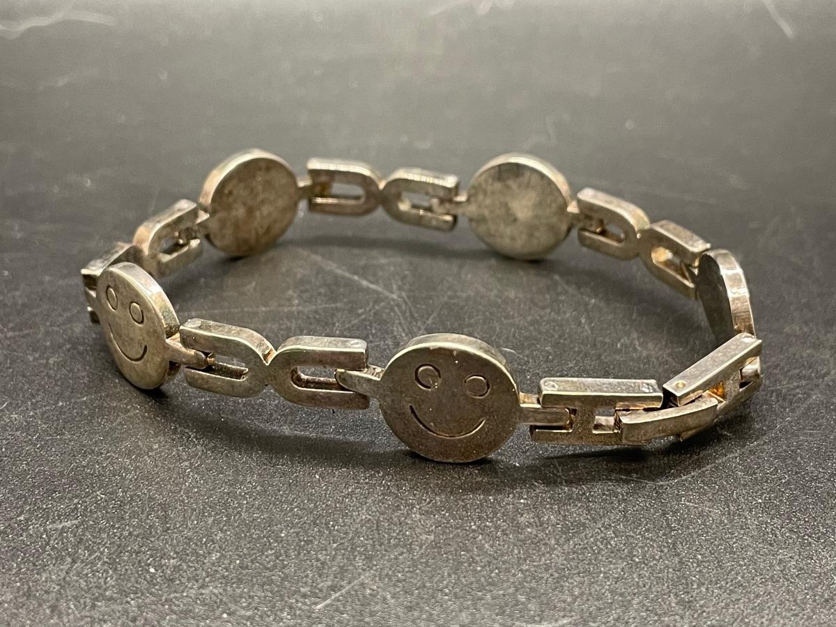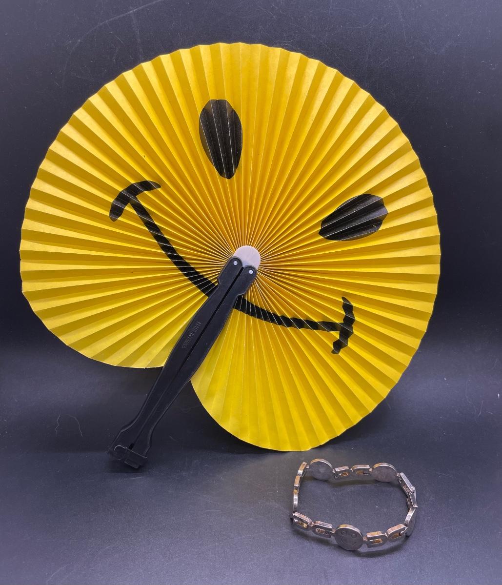 The items included are a happy face fan and a happy face bracelet. The bracelet is a little rusted and doesn’t stretch. The fan was made in China and is in great condition.