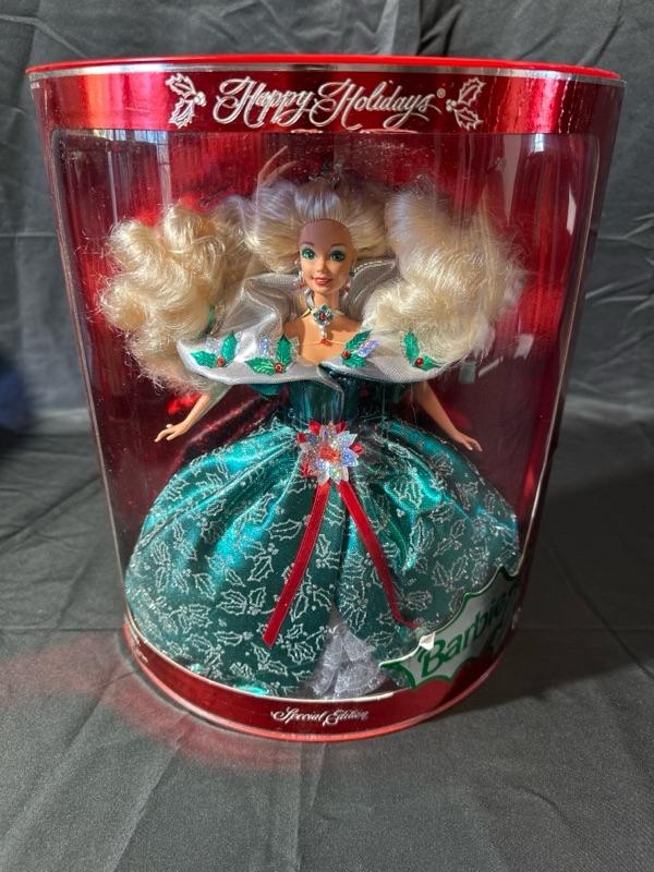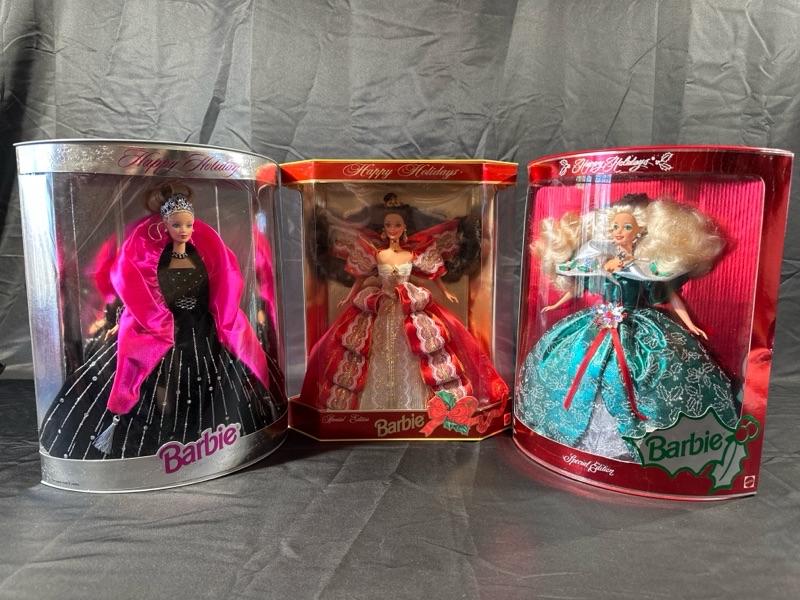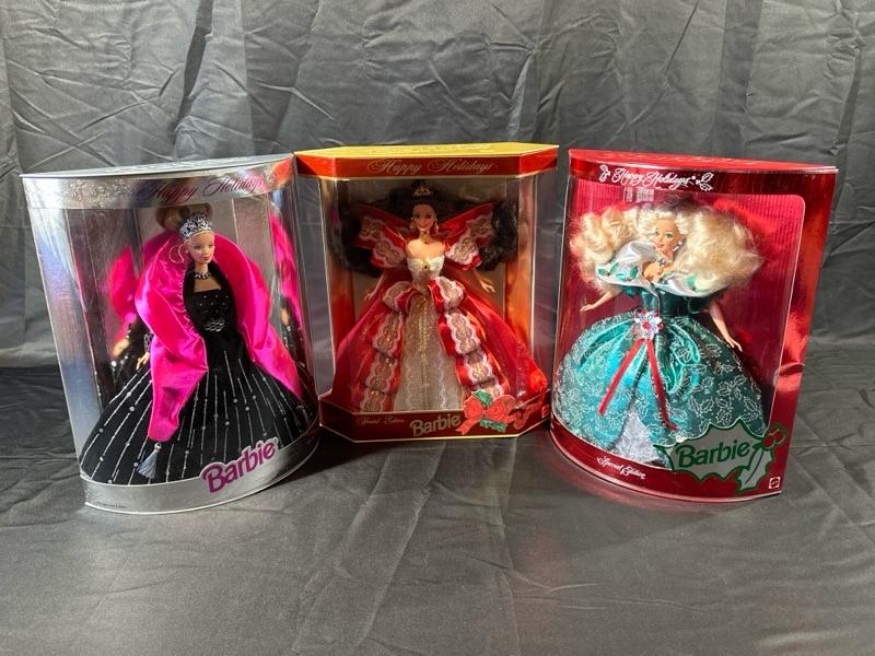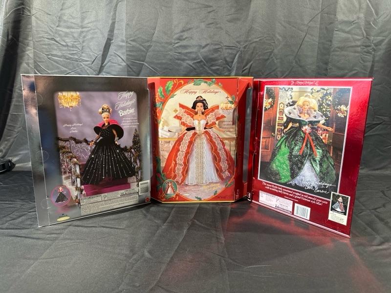Happy Holidays Barbies, 1995, 1997, 1998 in original boxes.