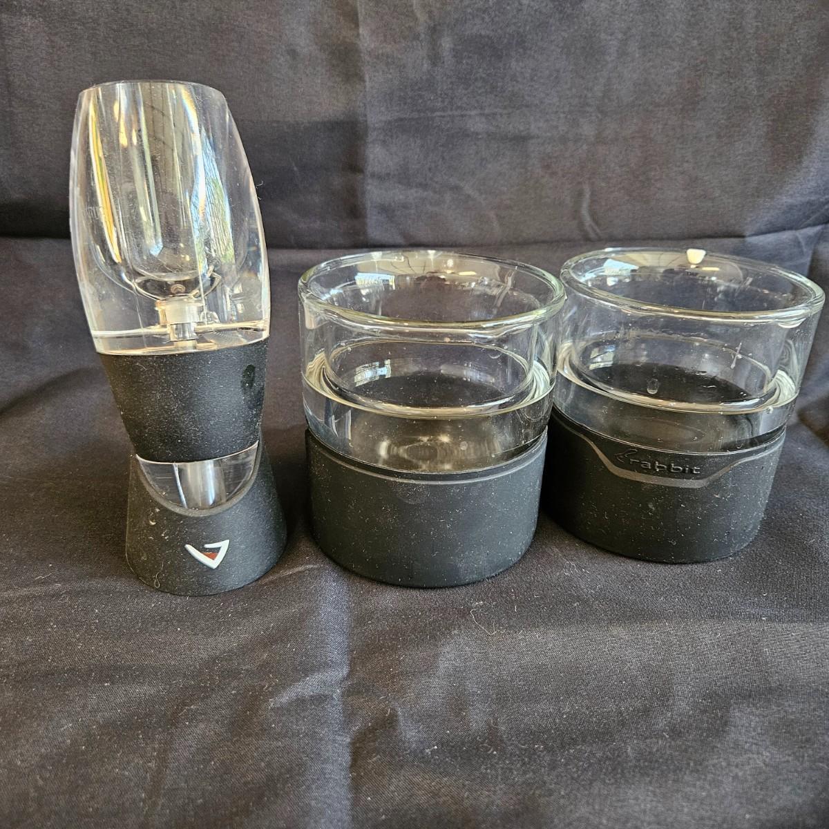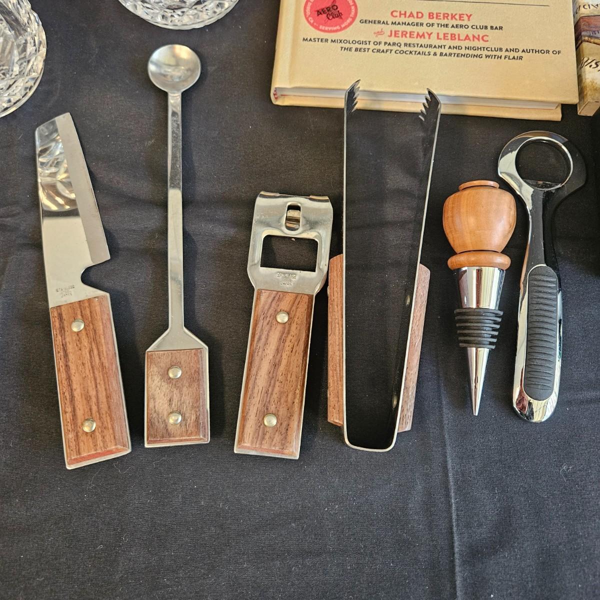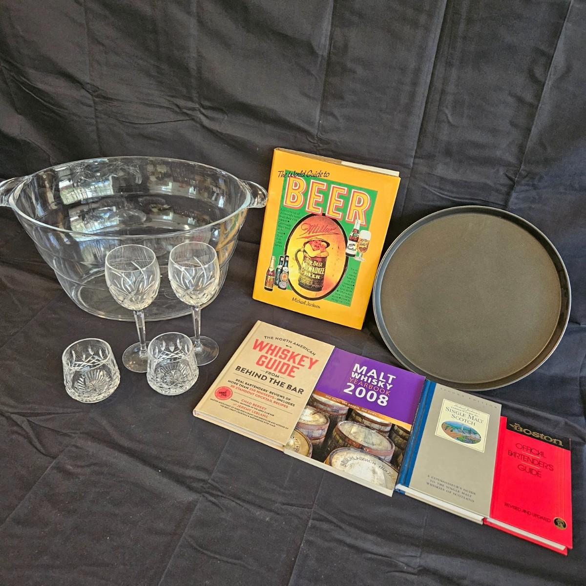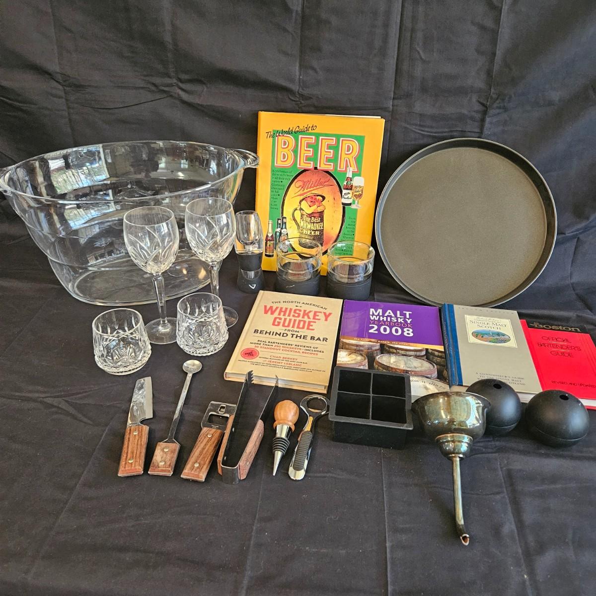 An assortment of items for the cocktail enthusiast. Includes two Waterford crystal wine glasses and 2 Waterford snifters, silicone ice molds, drink making tools, books and more. The large, clear plastic ice bucket measures approximately 18.5" x 11" x 9"H. Shipping available