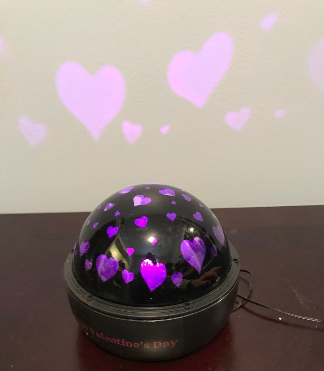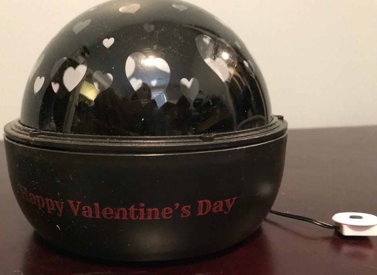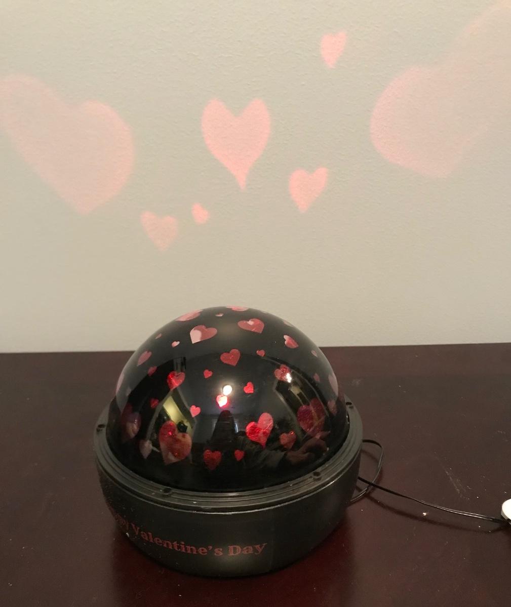 Rotating changing color hearts light projected on wall. Happy Valentines Day