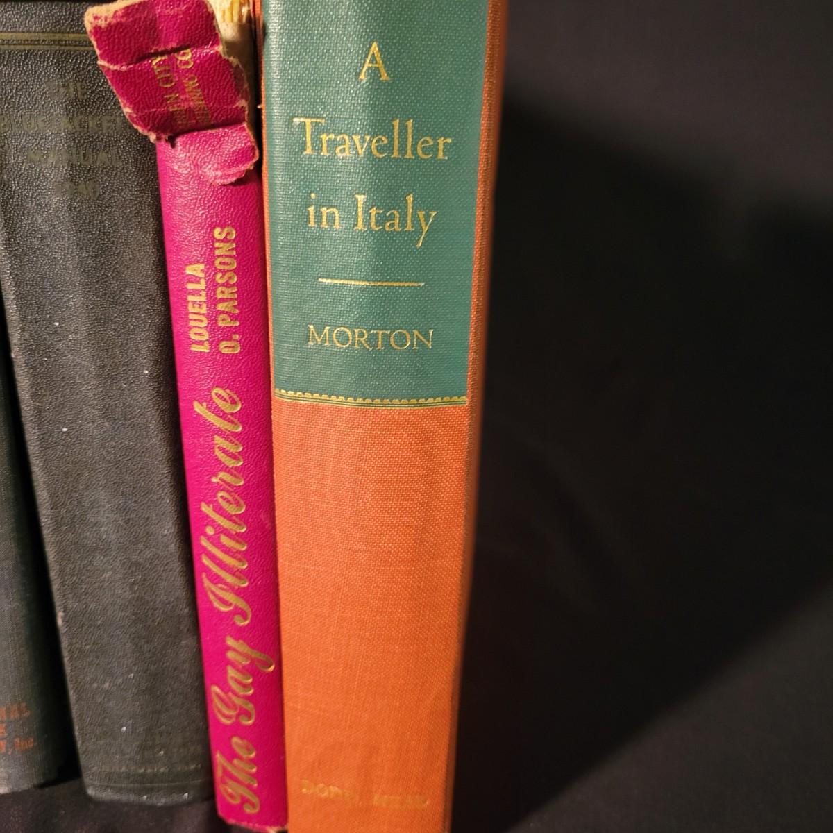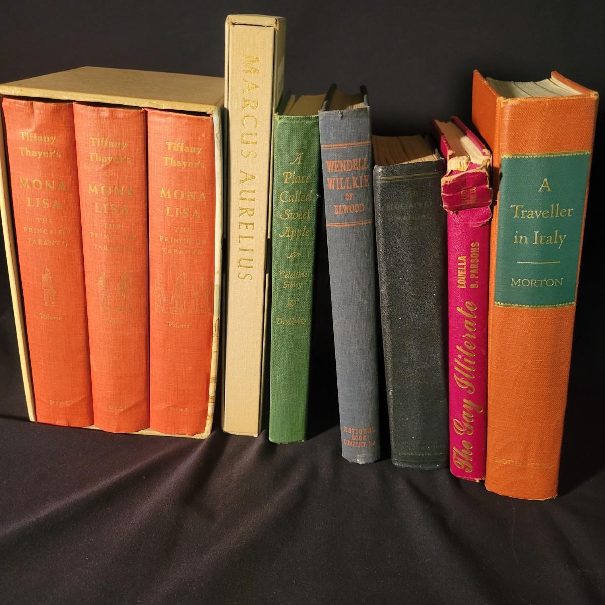 An assortment of hard cover books in good condition. One book does have a torn binding. Nine books total including the authors Tiffany Thayer, Celestine Sibley, HV Morton, & more. Shipping available.